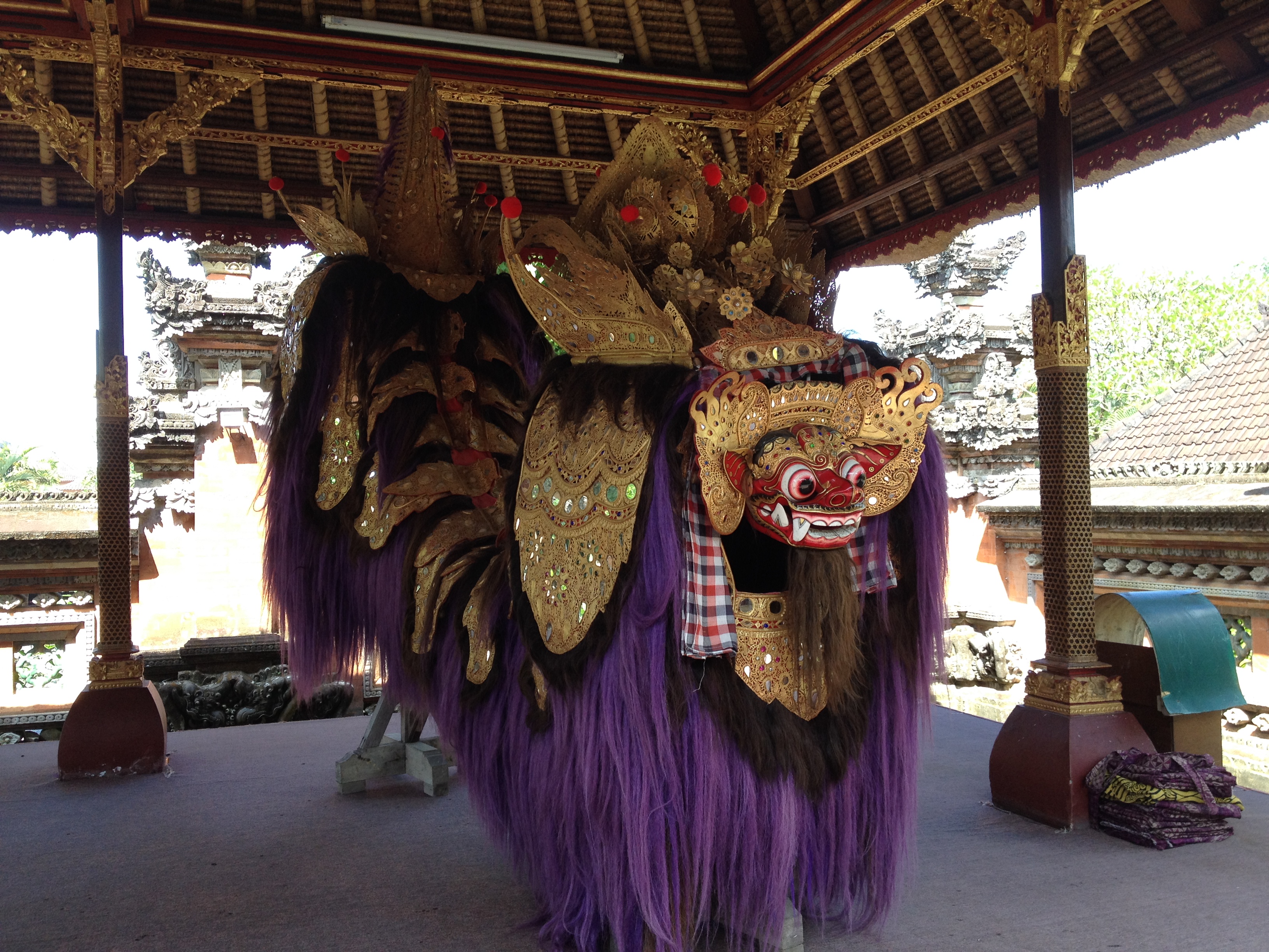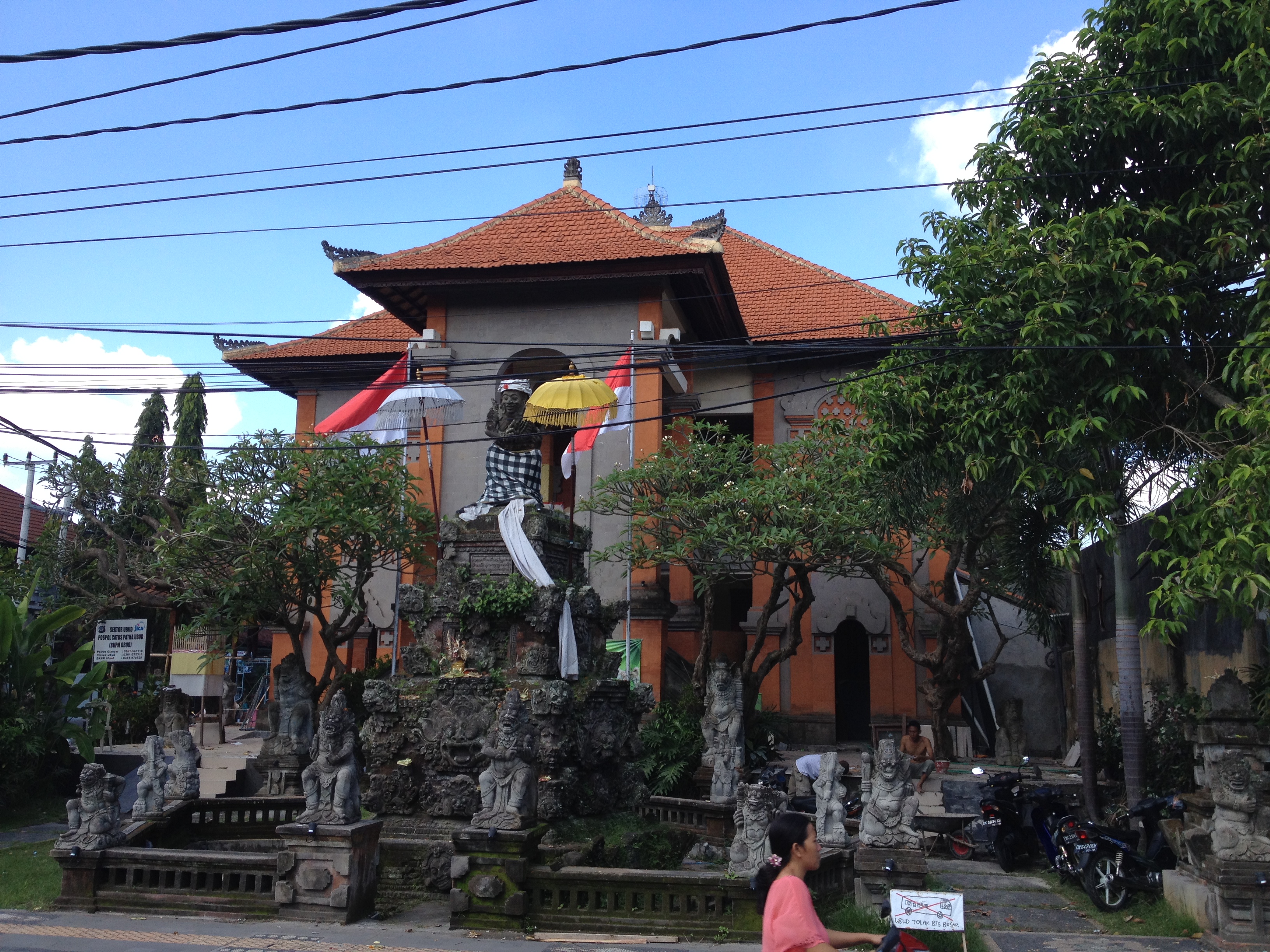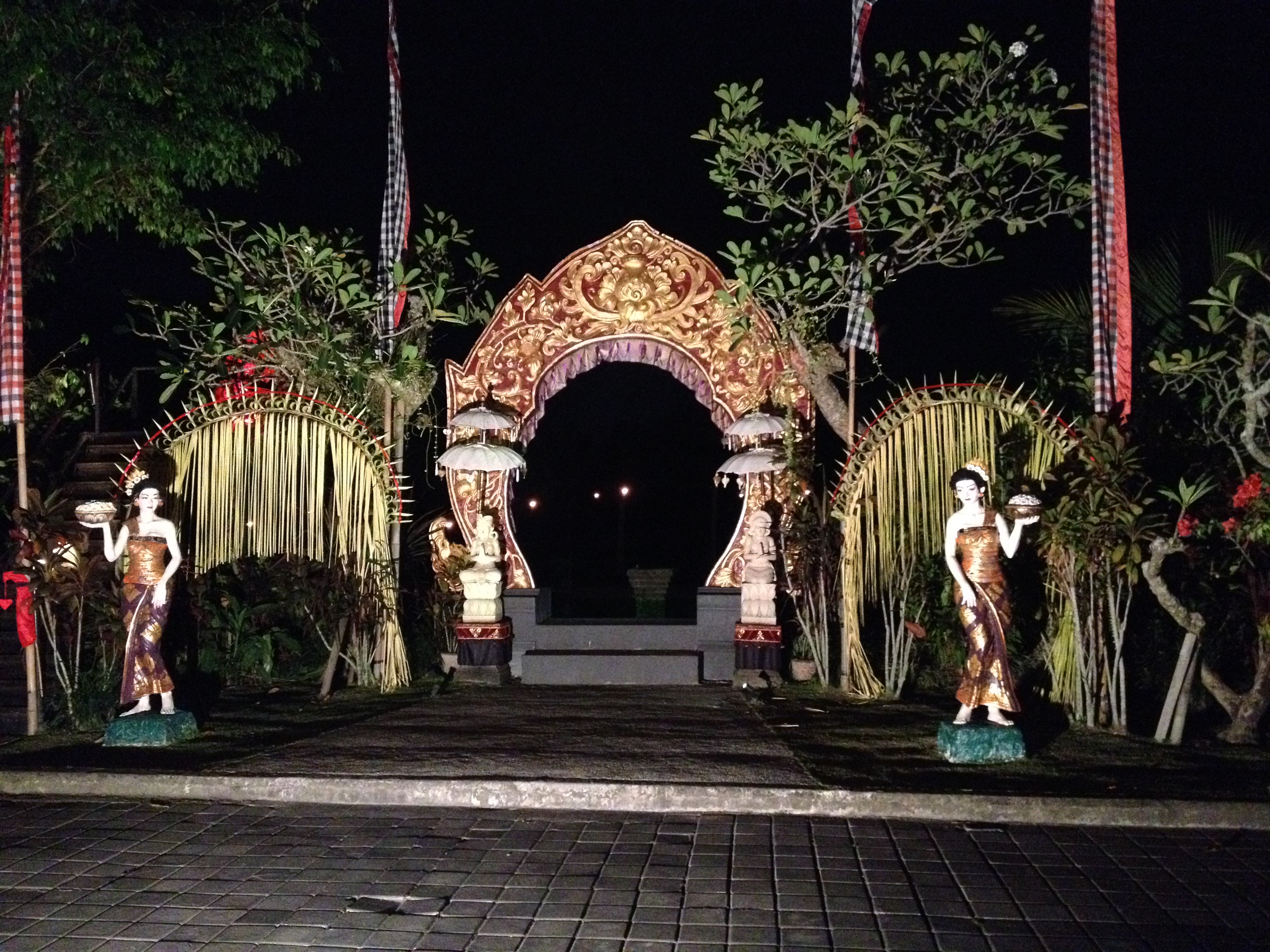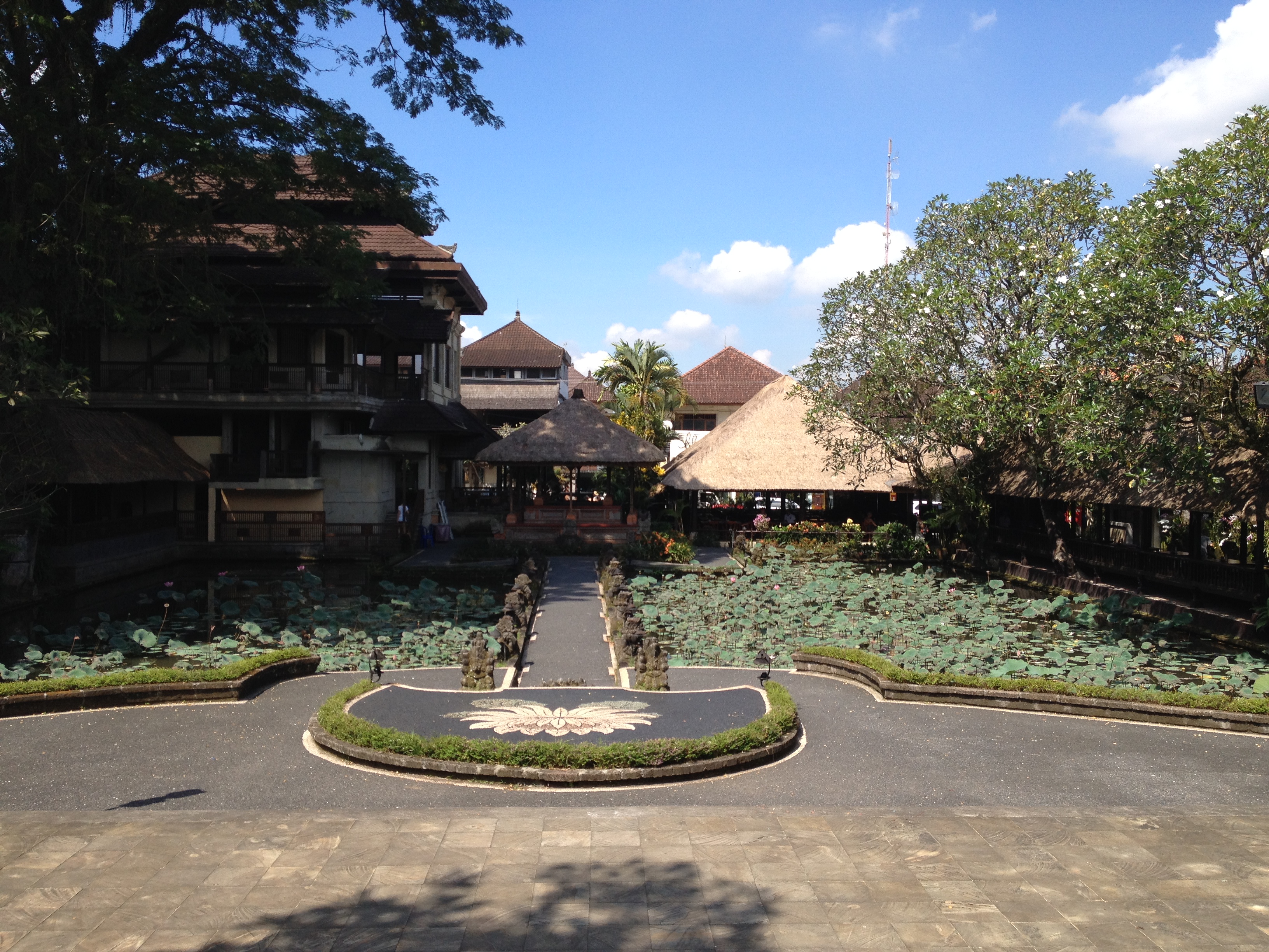 Il va comprendre que nous sommes de bons marcheurs et nous laisse remonter vers le centre d’Ubud où il nous attendra devant le Palace Royal. L’Indonésie est une république mais les îles sont divisées en royaumes; il y a trois ou quatre rois à Bali dont celui de Ubud. Cette semaine est festive, il y a un mariage dans la famille royale. Le Palais en est très décoré de fleurs et d’arrangements tressés en lanières de feuilles de palmiers mais c’est en face, dans la résidence d’une autre branche de la famille royale que Made nous fait pénétrer. Les portails d’entrée sophistiqués, les sculptures et moulures, les statues de pierre, les cours intérieures, les parvis devant les pavillons de briques orangées, les jardins aux fleurs et aux arbres géants intégrés au labyrinthe des allées nous font découvrir le style typiquement balinais des constructions cossues.