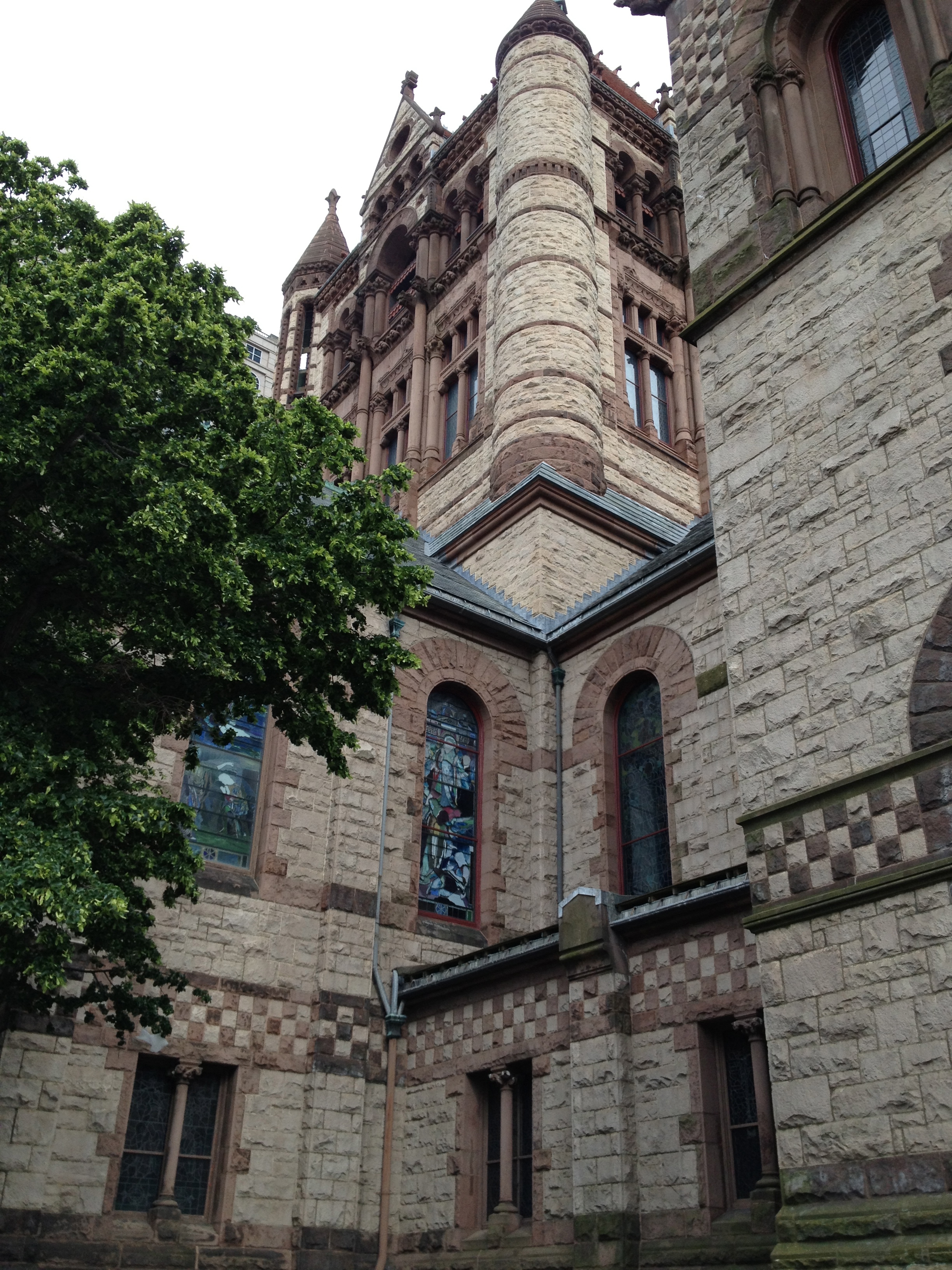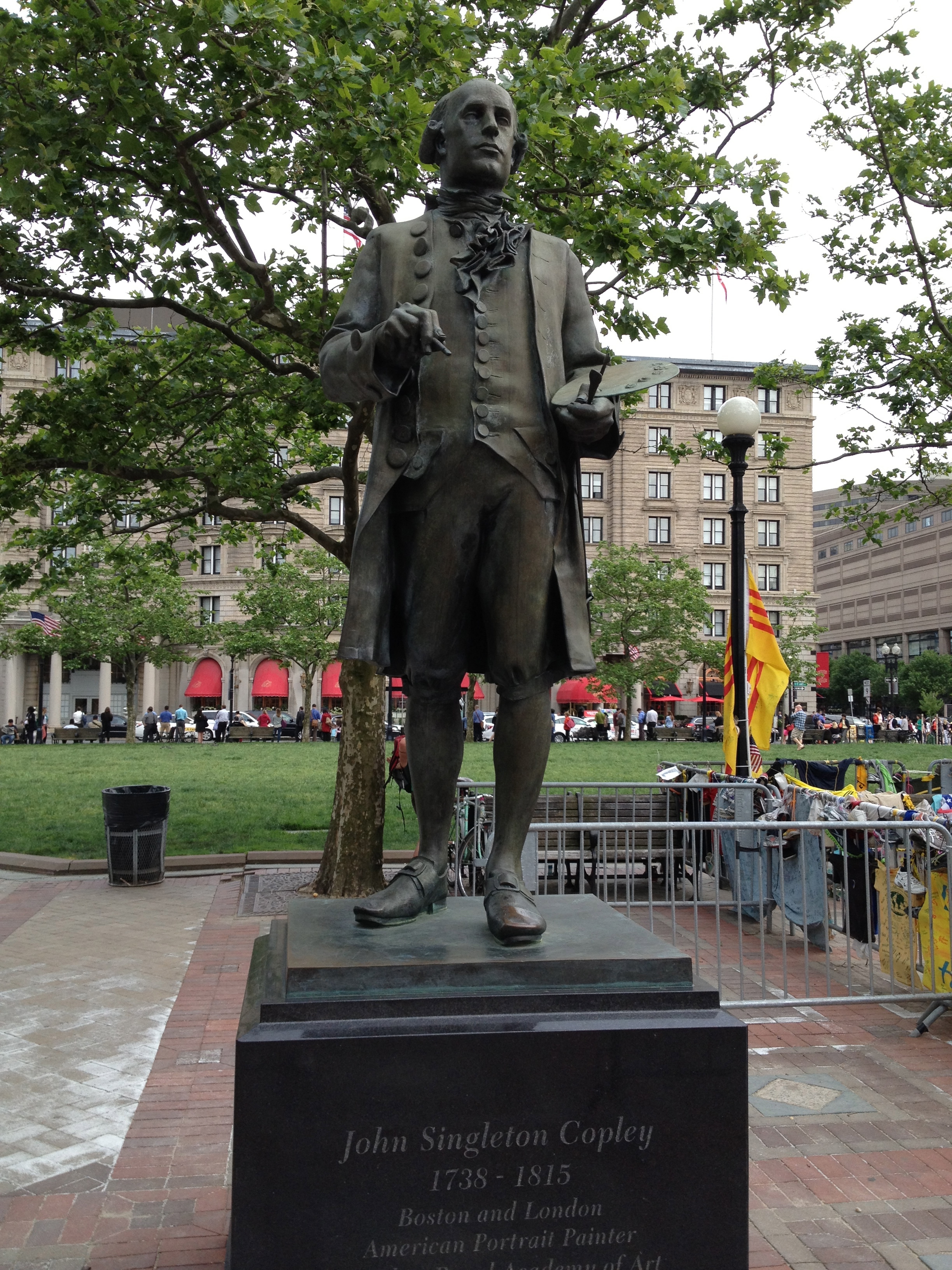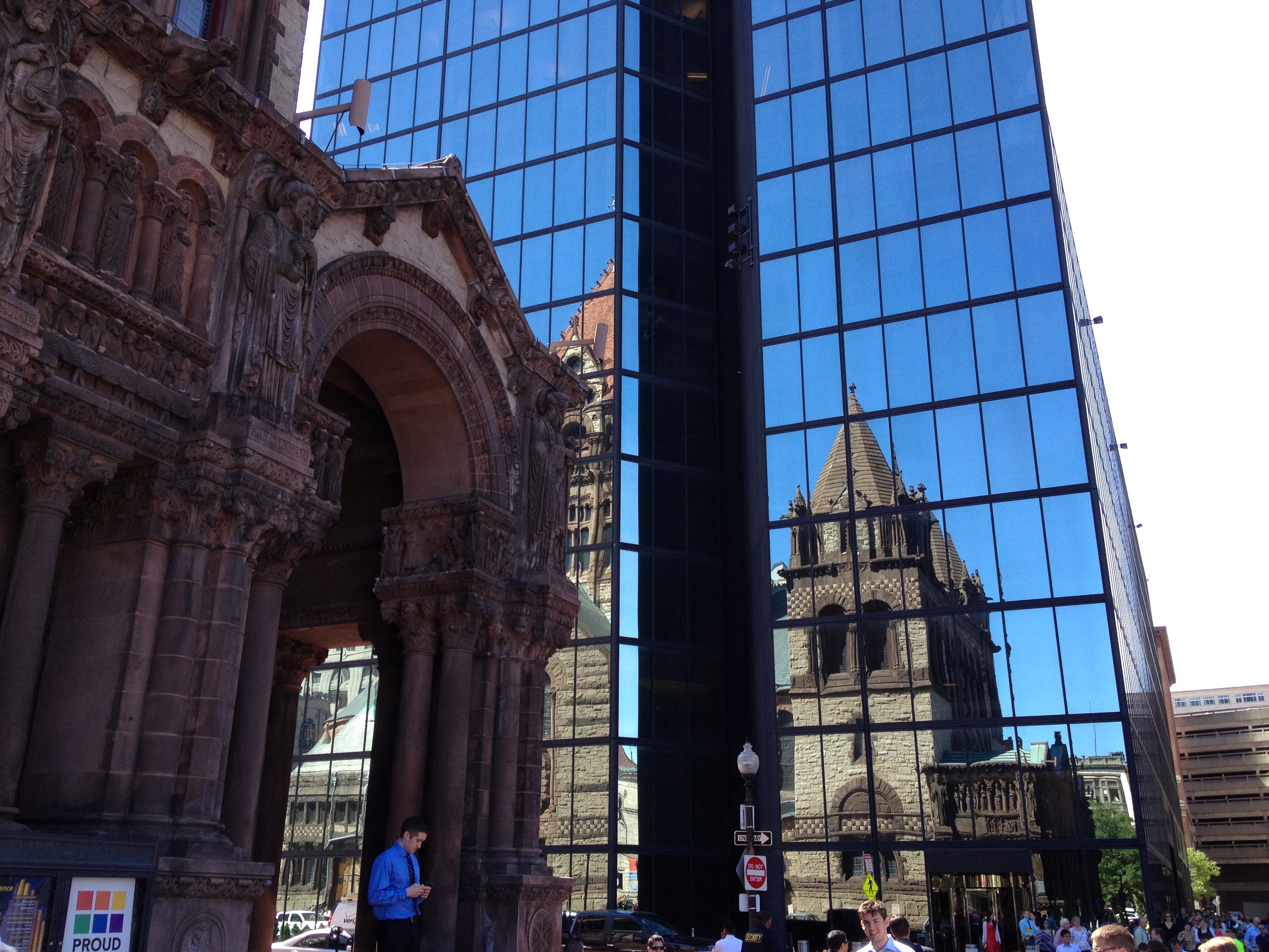 Copley Square – du nom d’un peintre portraitiste né à Boston en 1738 – est le cœur de Back Bay, anciennement un étang vaseux dont le niveau de l’eau dépendait des marées jusqu’au moment où Boston s’étend et où ce quartier est remblayé fin du dix-neuvième siècle pour devenir un quartier de résidence, de rues commerçantes aux façades de grès brun et aussi de beaux espaces verts. La place est dominée par la plus haute tour de la ville – soixante étages -, Hancock Tower toute en verre, dessinée en 1976, par l’architecte sino-américain I. Ming Pei – à qui l’on doit la pyramide du Louvre. Dans cet énorme miroir se reflète la Trinity Church, église anglicane de 1733. Sa façade en grès et granit est déjà spectaculaire en soi mais entrer dans cet édifice religieux inspire le respect, le calme. C’est l’artiste La Farge qui imagina cet intérieur très coloré, assez foncé; des motifs, des fresques et des dessins inspirés de l’église chrétienne, mais aussi un peu de byzantin, de motifs médiévaux et de la Renaissance. Les vitraux, extraordinaires, sont souvent l’œuvre d’artistes européens. L’église fut construite alors que le sol était encore mouvant, ainsi elle repose sur d’énormes pieux et un système de drainage fut mis en place.