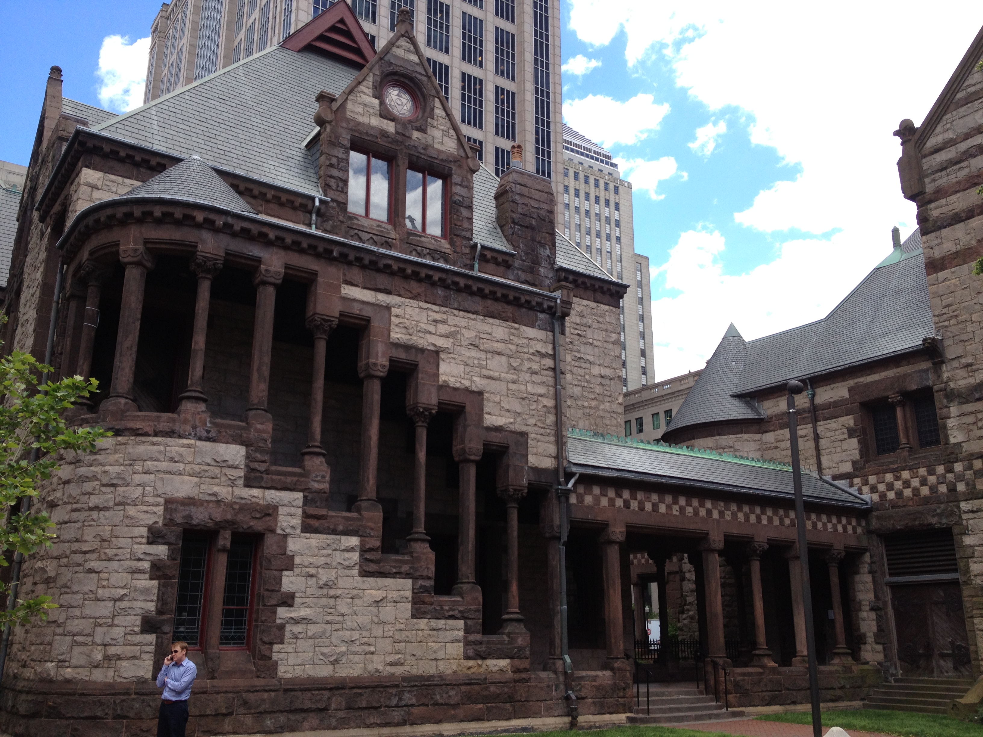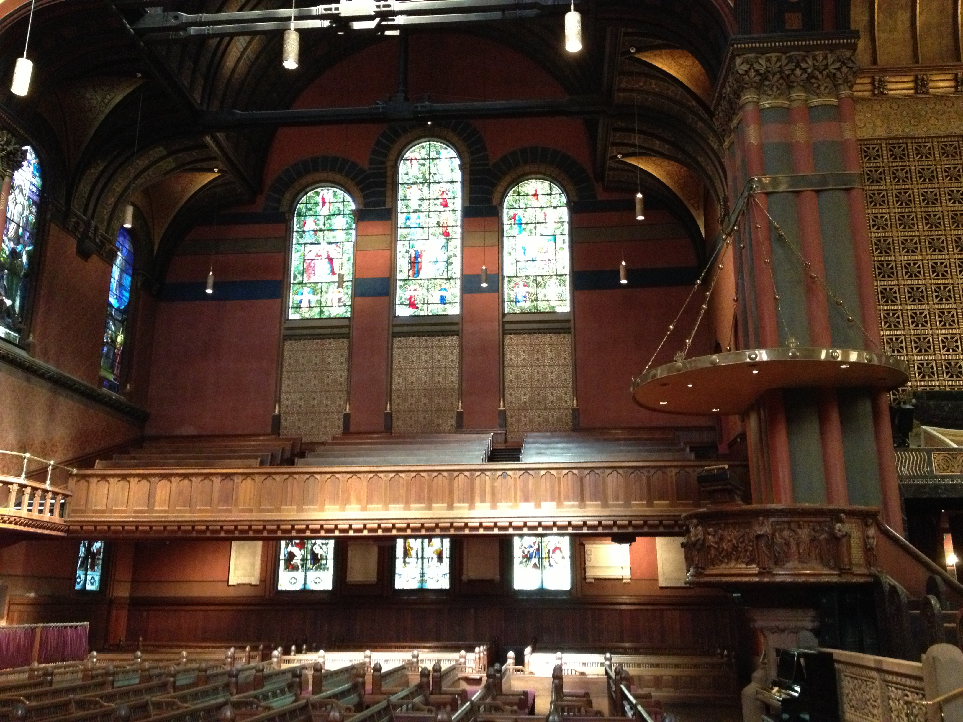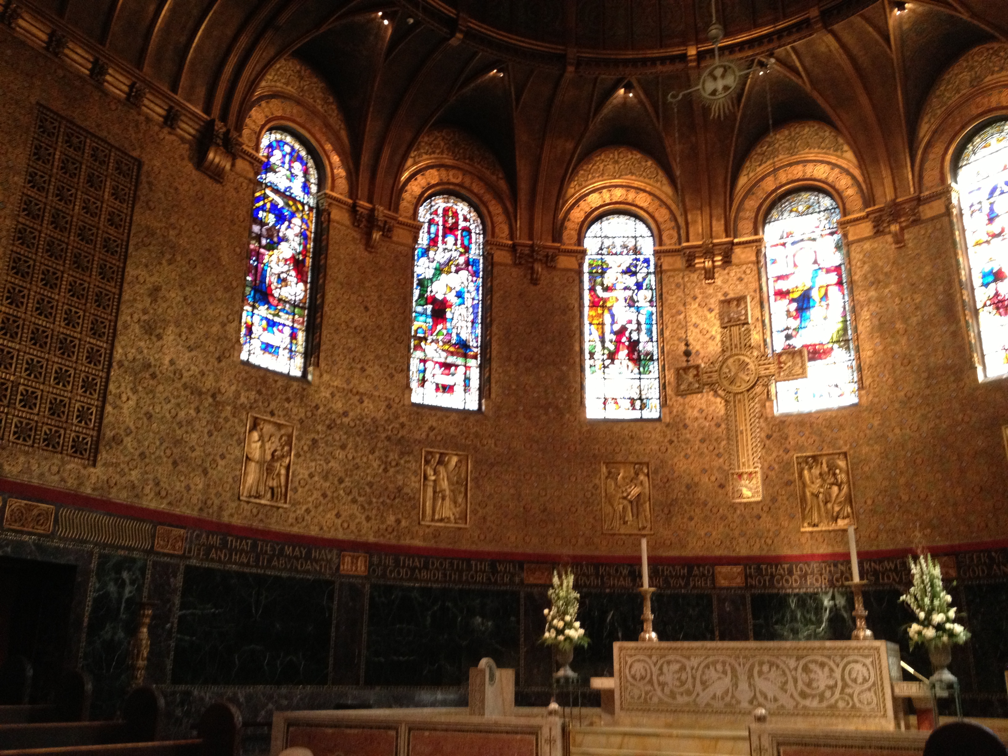 Copley Square – du nom d’un peintre portraitiste né à Boston en 1738 – est le cœur de Back Bay, anciennement un étang vaseux dont le niveau de l’eau dépendait des marées jusqu’au moment où Boston s’étend et où ce quartier est remblayé fin du dix-neuvième siècle pour devenir un quartier de résidence, de rues commerçantes aux façades de grès brun et aussi de beaux espaces verts. La place est dominée par la plus haute tour de la ville – soixante étages -, Hancock Tower toute en verre, dessinée en 1976, par l’architecte sino-américain I. Ming Pei – à qui l’on doit la pyramide du Louvre. Dans cet énorme miroir se reflète la Trinity Church, église anglicane de 1733. Sa façade en grès et granit est déjà spectaculaire en soi mais entrer dans cet édifice religieux inspire le respect, le calme. C’est l’artiste La Farge qui imagina cet intérieur très coloré, assez foncé; des motifs, des fresques et des dessins inspirés de l’église chrétienne, mais aussi un peu de byzantin, de motifs médiévaux et de la Renaissance. Les vitraux, extraordinaires, sont souvent l’œuvre d’artistes européens. L’église fut construite alors que le sol était encore mouvant, ainsi elle repose sur d’énormes pieux et un système de drainage fut mis en place.
