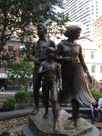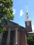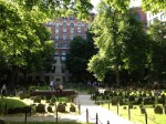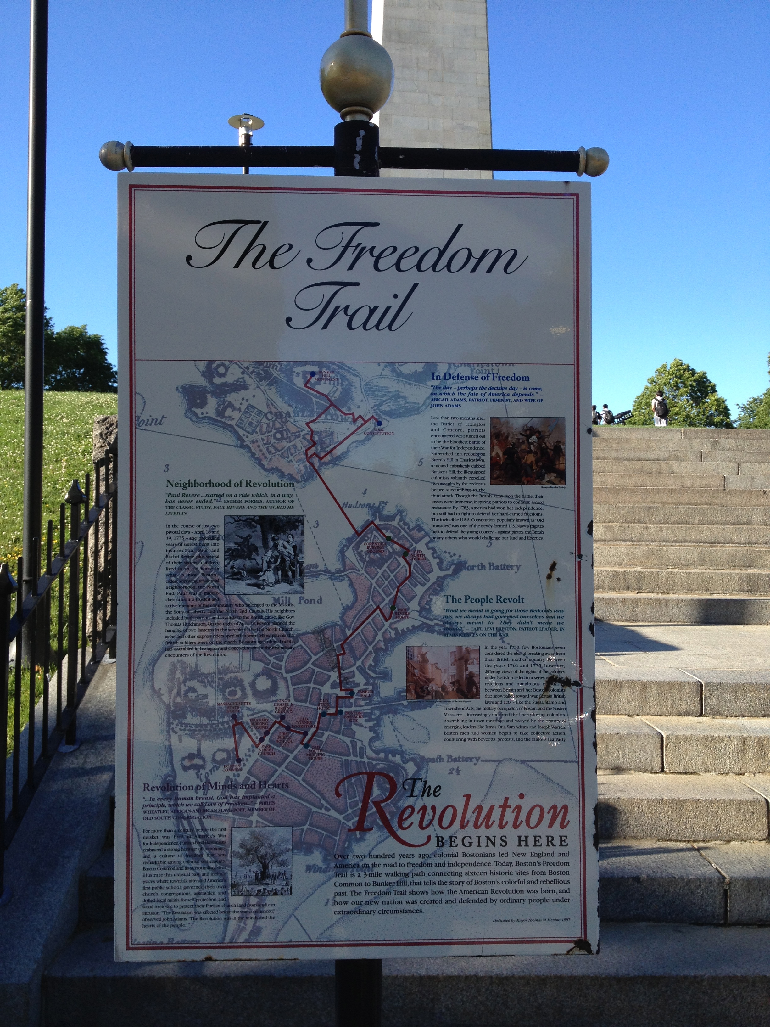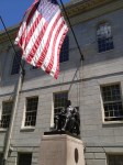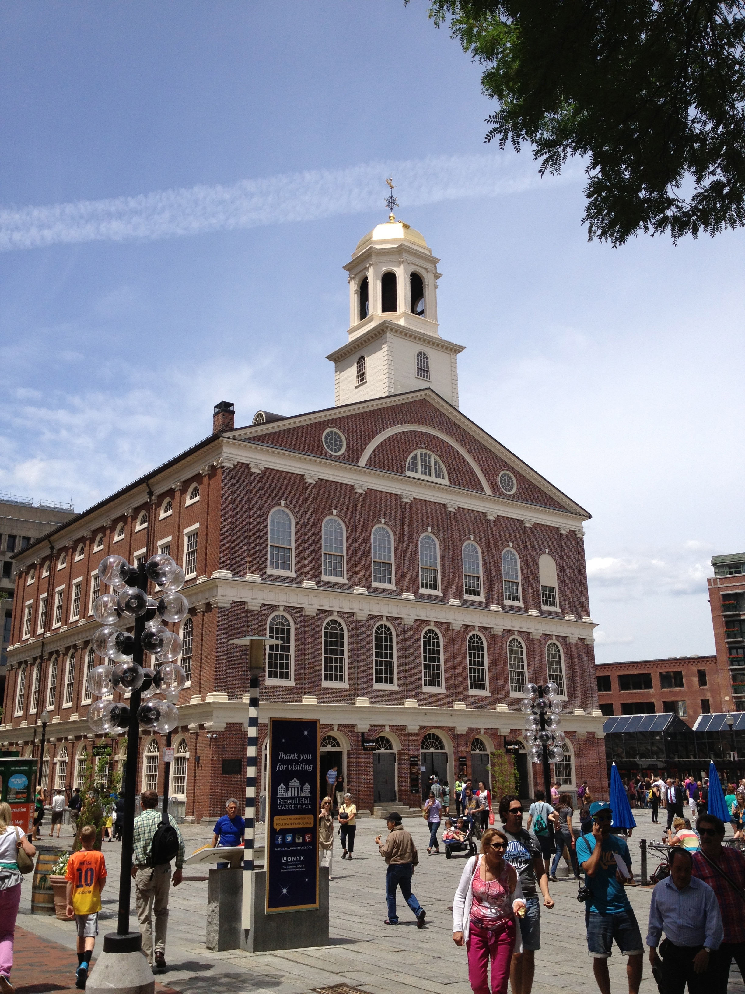 J’entraîne Yves à la découverte de l’histoire de la ville par le Freedom Trail, un parcours piéton de quatre kilomètres, tracé d’une ligne rouge sur les trottoirs, qui se réfère – via seize sites – aux événements, lieux et personnages importants de la guerre d’indépendance des États-Unis. Le parcours débute dans un grand parc public, magnifique, avec des massifs déjà bien fleuris, des gazons superbes, des arbres géants, des étangs où l’eau ici ne fait pas défaut. Ma prise de photos ralentit un peu de rythme de Yves, nous avons une petite brochure qui nous détaille chacun des sites et nous admirons ainsi le nouveau bâtiment du Gouvernement avec son Dôme recouvert de feuilles d’or, des églises de briques rouges au clocher élancé tout blanc, de petits cimetières épargnés dans les ruelles, un des importants salons littéraires du dix-neuvième siècle, le Hall Faneuil – lieu historique de la révolte des colons, la plus ancienne demeure coloniale en bardeaux du centre, celle de Paul Revere, un patriote qui a joué un rôle important au moment de l’attaque des anglais.
