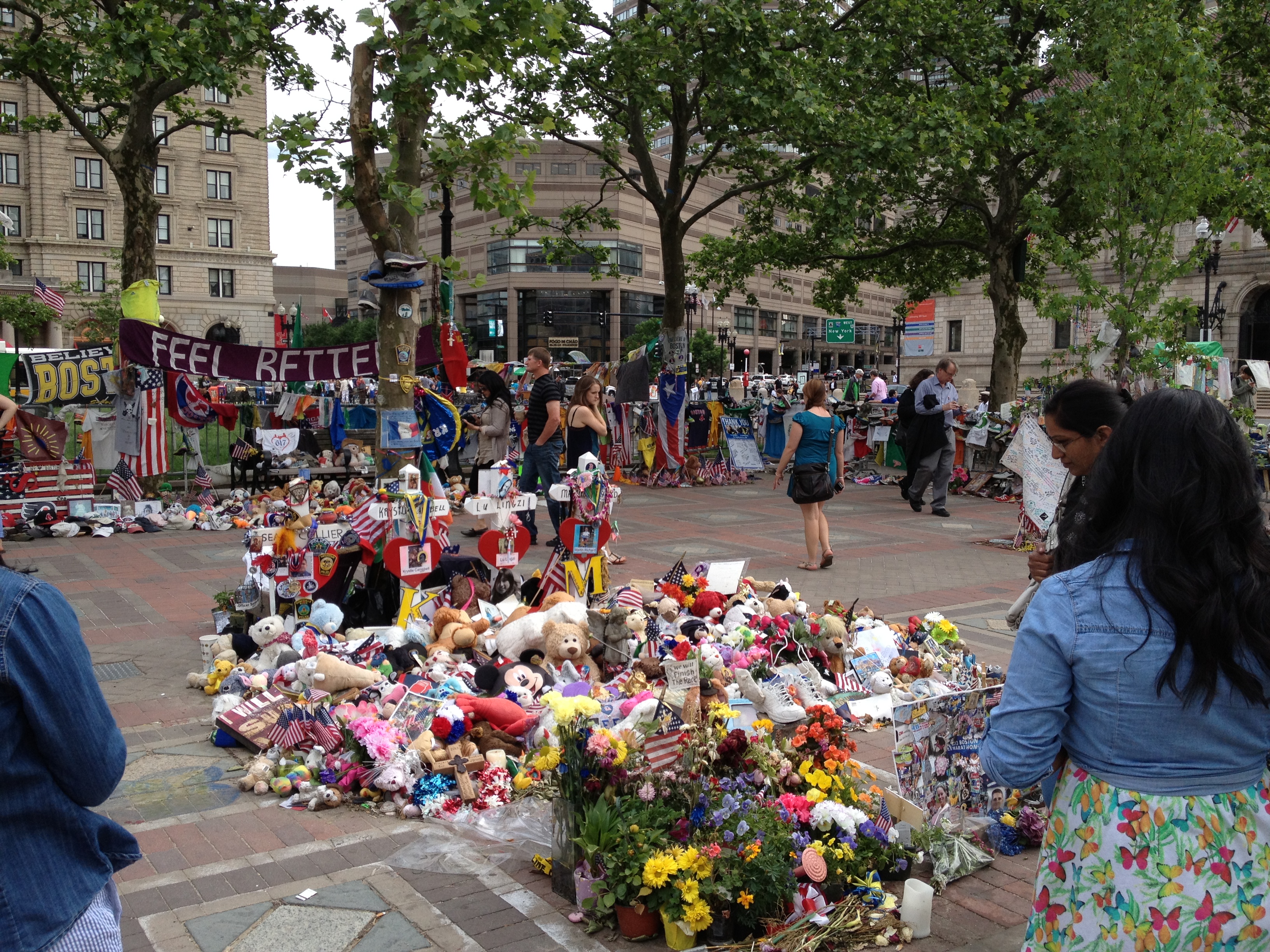 Je me suis fait hier soir un itinéraire précis – avec les stations métro – et complet pour une série incroyable de choses à voir aujourd’hui. Une vraie journée ‘marathon’ et c’est d’ailleurs juste en face de l’hôtel que se trouve la ligne gravée sur le trottoir de cette course célèbre depuis 1897 – avec seulement quinze coureurs pour la première édition alors que de nos jours ils sont plus de vingt mille. Elle fut malheureusement cette année un lieu de tragédie, dont tout le monde ici parle encore; des fleurs, des chaussures, des peluches commémorent ce triste événement. Les professeurs que l’on rencontre et qui habitent sur le campus témoignent de ces jours effrayants à Cambridge, devenue ville fantôme, avec les rues désertes et seuls les bruits des sirènes et des coups de feu.