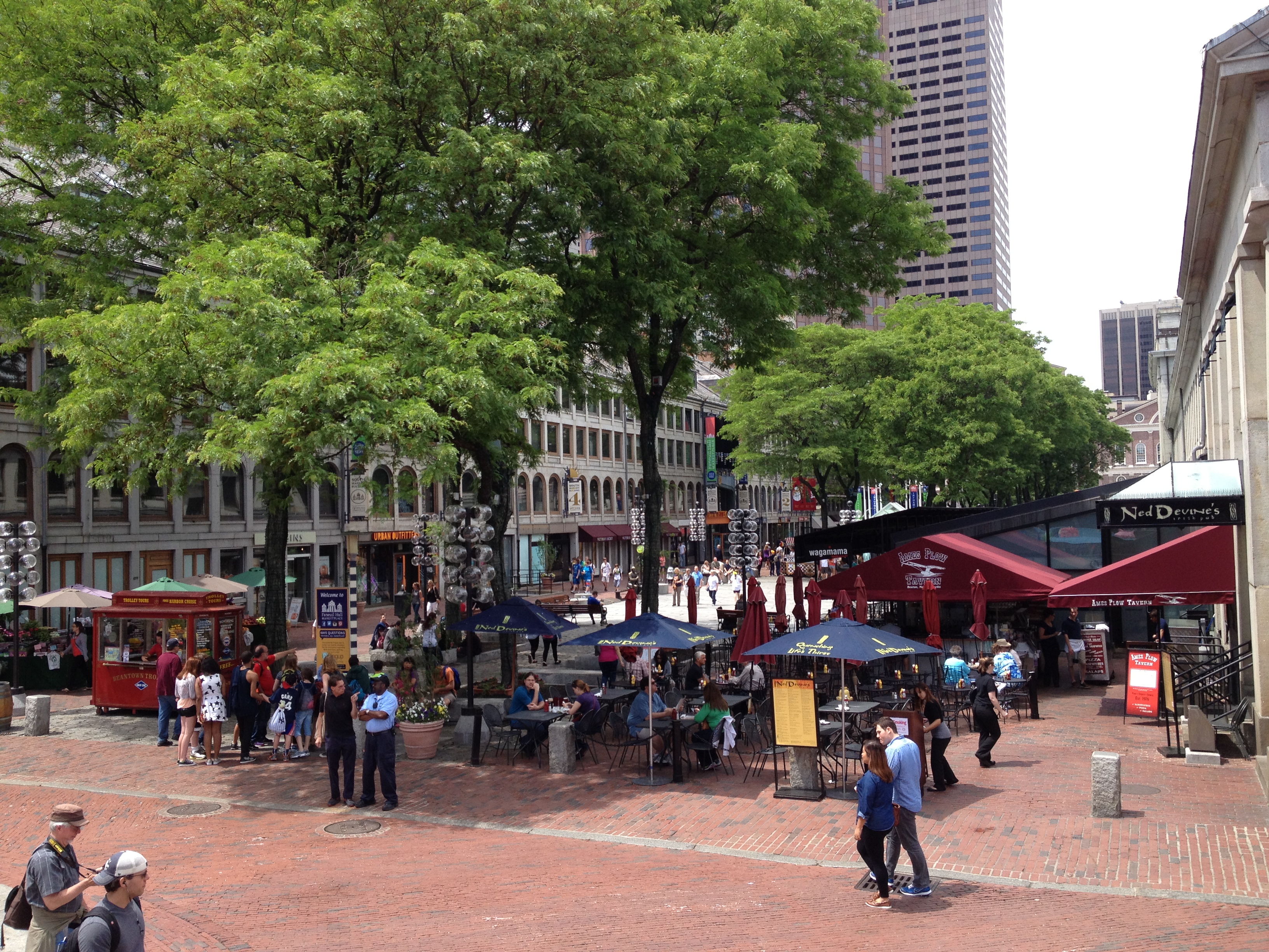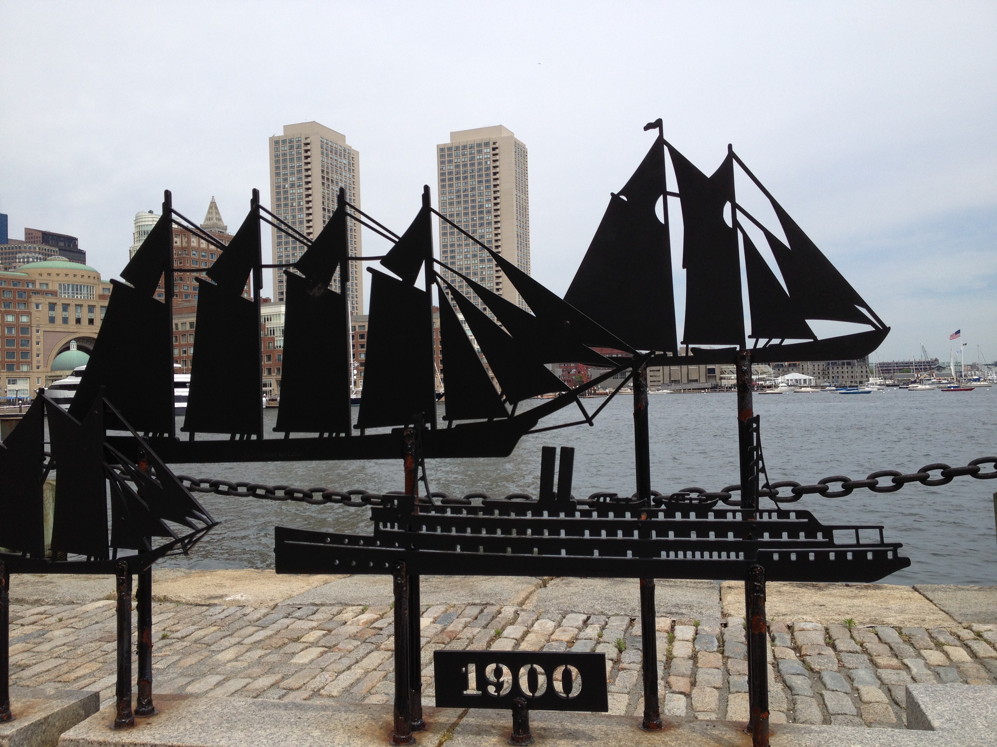 La Custom House Tower, tour carrée avec sa grande horloge, abrite aujourd’hui le Marriott hôtel et elle me signifie que je suis proche de Quincy Market. Trois longs bâtiments à l’arrière du Faneuil Hall où passe le ‘Chemin de la Liberté’, sont un endroit pour le shopping – quelle bonne idée d’avoir emporté deux valises moitié vides – et la bonne table, un quartier piéton où s’en donnent aussi les artistes de rue. C’est ici que l’histoire de la ville a commencé il y a quatre siècles, et l’on ressent le mariage entre l’architecture coloniale qui jouxte dans le paysage élancé des gratte-ciels. Les quais accueillaient dans le temps des navires marchands, chargés de café, de thé, d’épices et ce sont maintenant des ferries et des bateaux de croisières pour passagers.