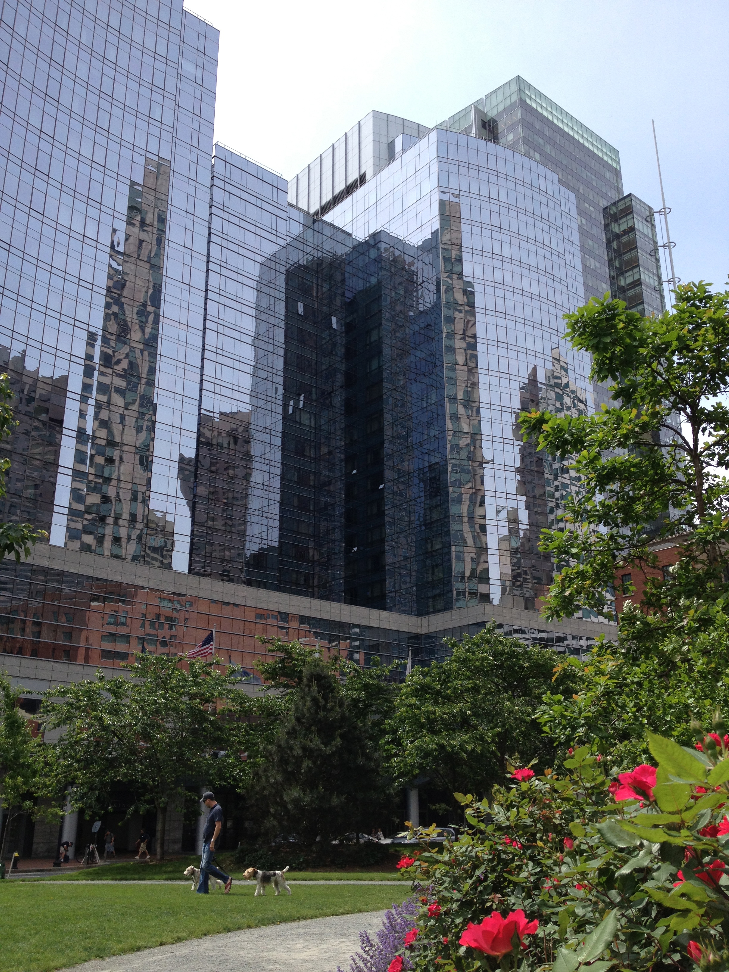 Plusieurs grands espaces verts ont émergé dans la ville; une grosse route qui traversait jadis la ville a été enterrée et transformée ici en une chaîne de parcs et jardins, la Rose Kennedy Greenway. Entre l’eau et les buildings du quartier financier, je m’arrête pour humer, admirer les fleurs et la verdure; une jeune horticultrice discute deux mots et me donne le nom des roses rouges très en fleurs.
