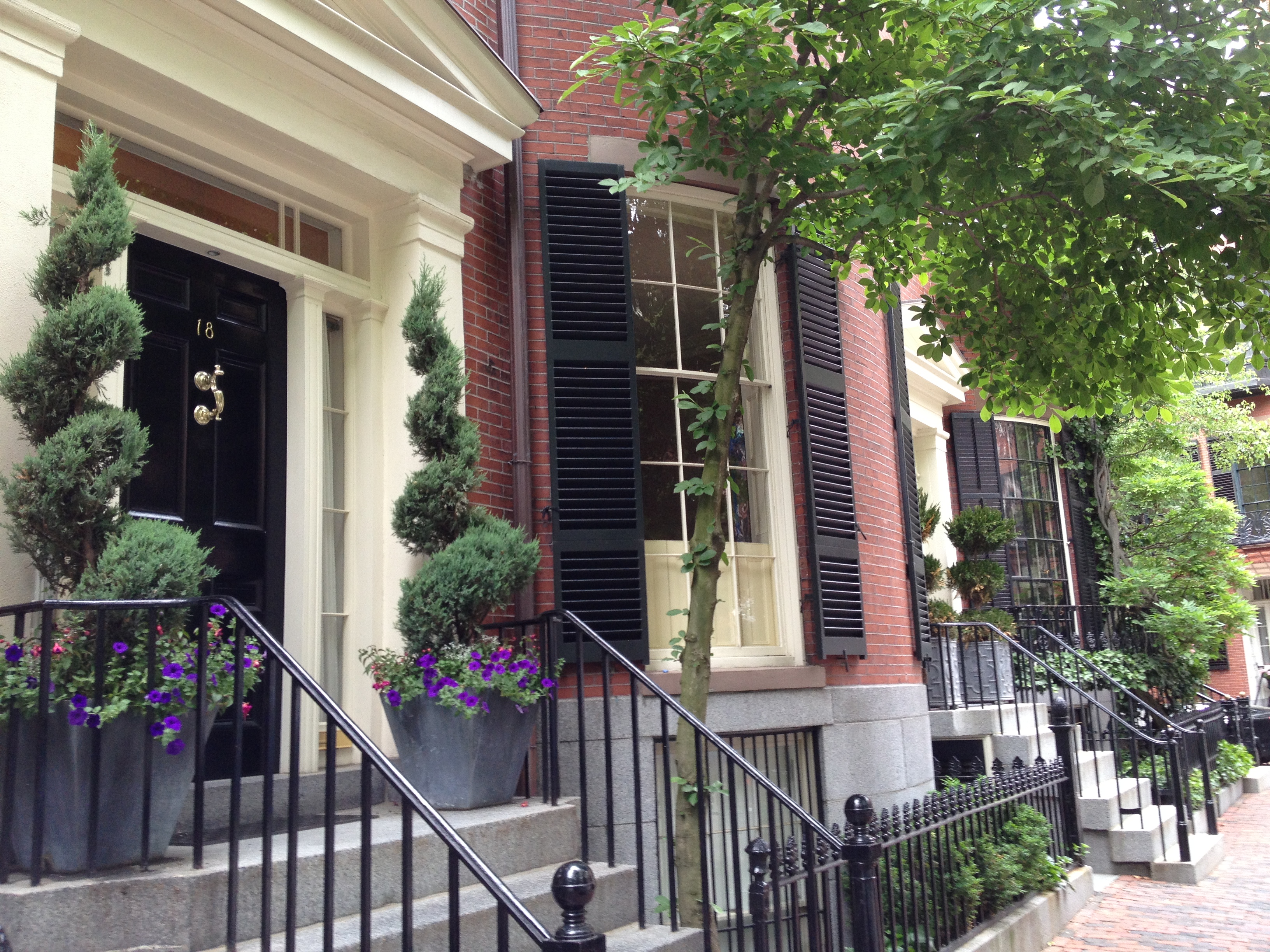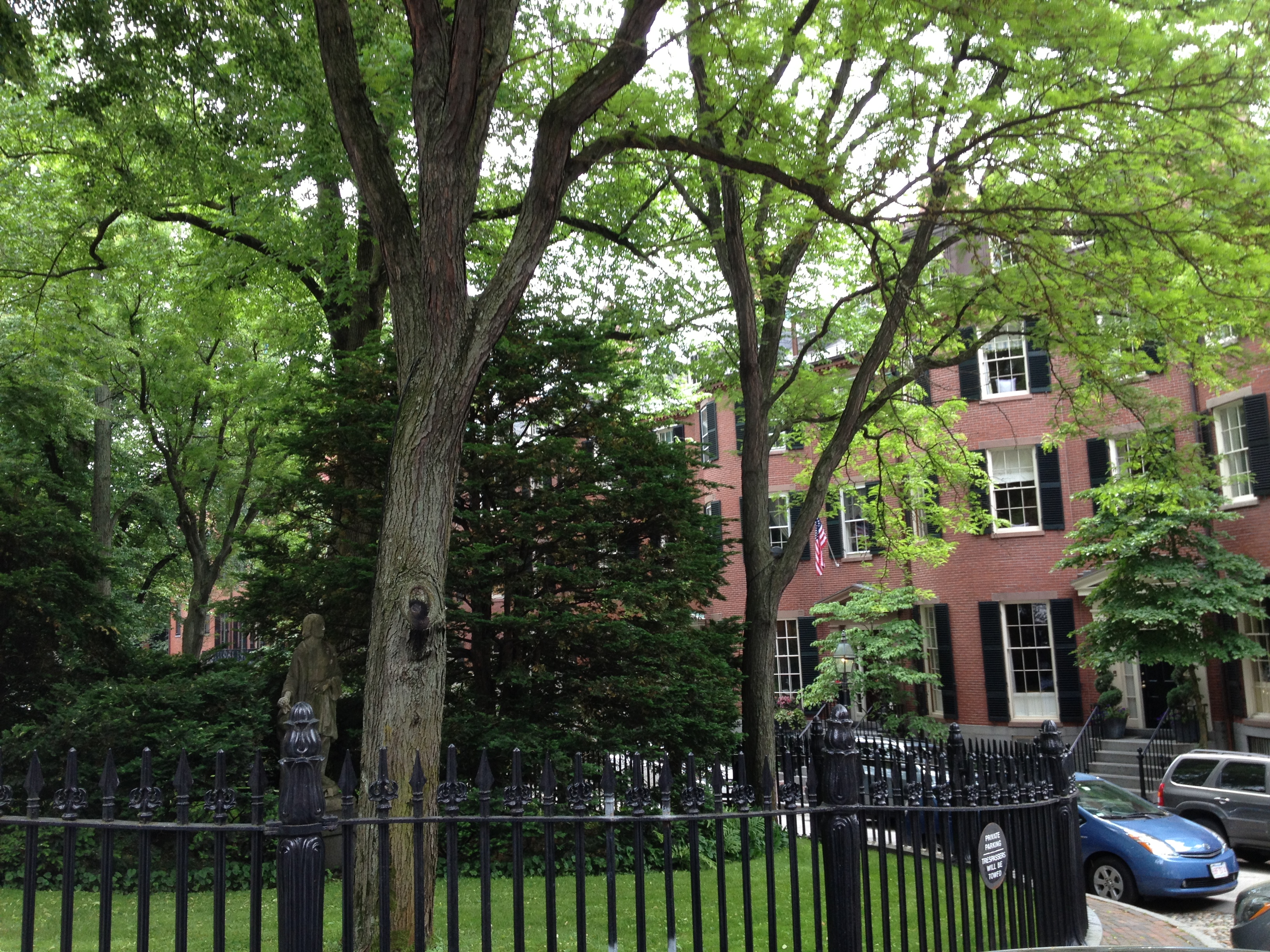 Quelques stations plus loin, je débarque au nord de Charles Street, l’artère qui borde le quartier le plus prisé de la ville, Beacon Hill. Des rues étroites, vallonnées, des maisons et des trottoirs de brique rouge, des réverbères à gaz, des fleurs et de la verdure qui dégringolent des rebords des fenêtres, des boutiques chics et des antiquaires en font un endroit de flânerie tranquille, plein de charme. Et c’est à Louisburg Square, un jardin privé, une enclave pour les élites, que le prix de l’immobilier atteint des sommes folles … c’est magnifique.