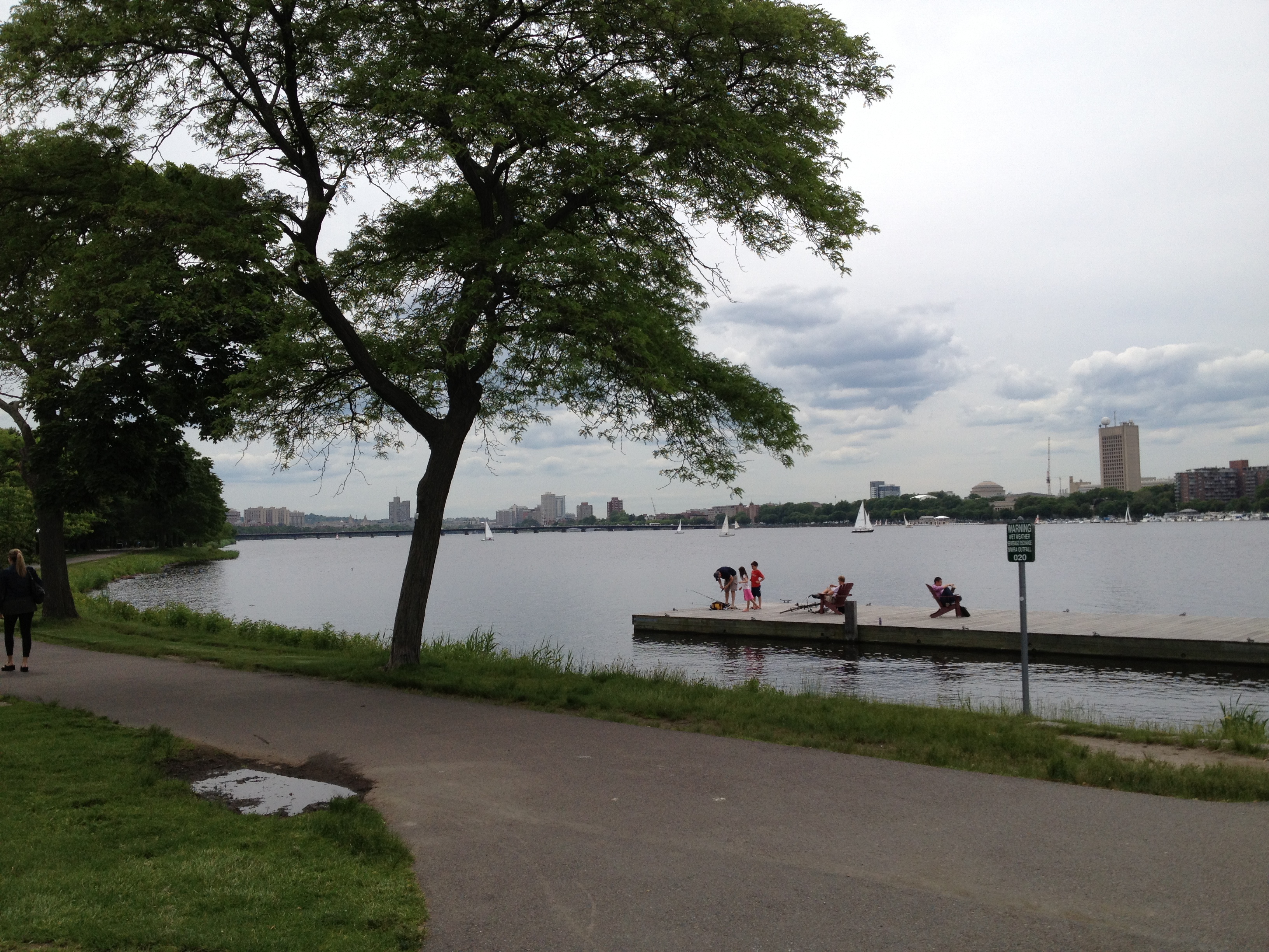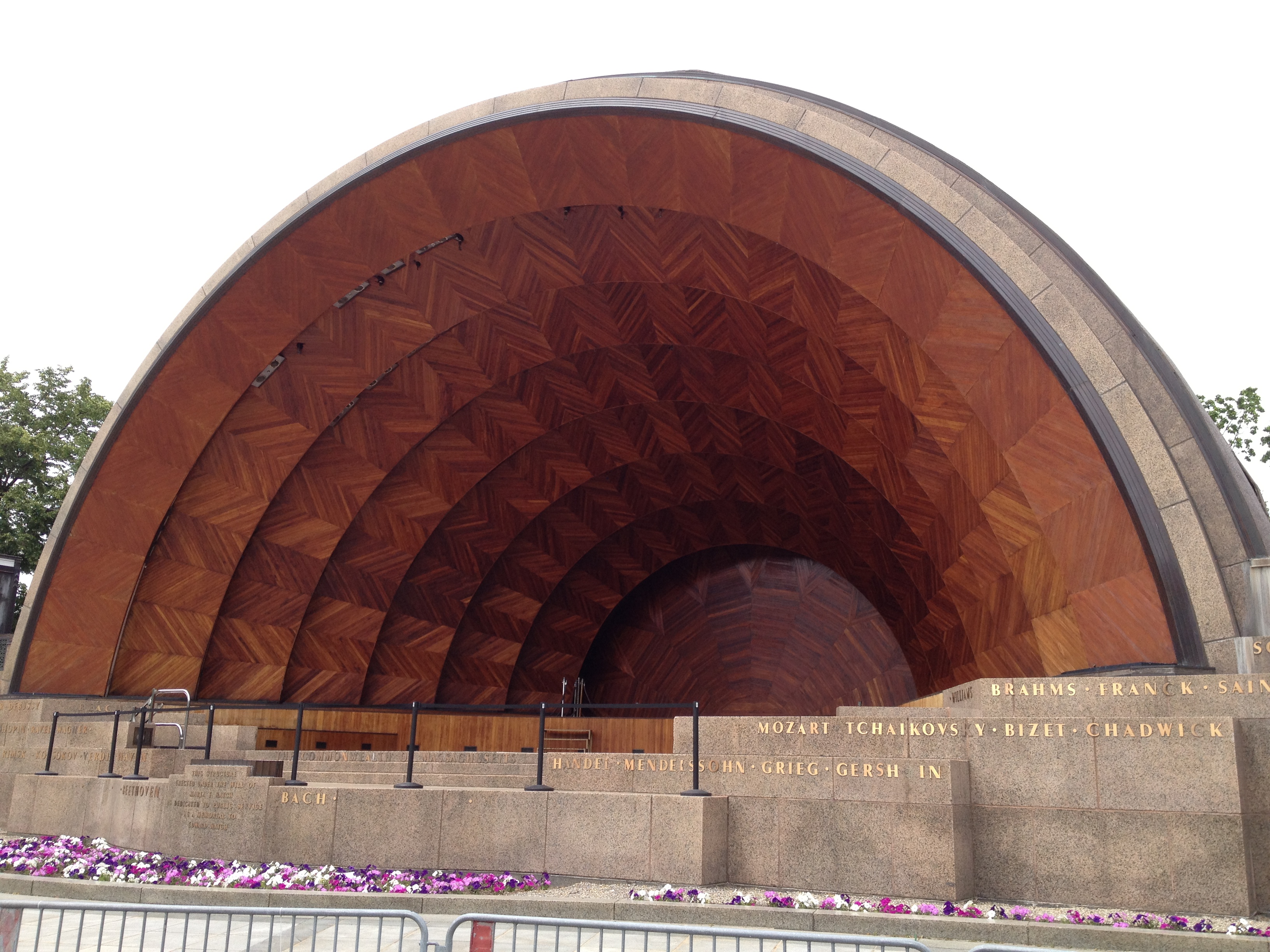 Par une longue passerelle au-dessus des avenues, j’accède au parc qui suit les berges de Charles River Bassin,l’Esplanade, propice à la balade, aux pic-nics, aux siestes au soleil sur une estrade en bois tout en regardant les embarcations sur l’eau et en face le campus du MIT; des sentiers traversent les pelouses où se promènent les écureuils, des lapins, des oies, … des petits ponts, des étangs, des sculptures dont la tête en plaques d’acier de Arthur Fiedler, initiateur du parc et des concerts en plein air alors qu’il jouait dans l’orchestre symphonique. C’est pourquoi sur la grande plaine se trouve une scène très originale en forme de coquillage, en bois sur l’intérieur, où les concerts attirent tout l’été des centaines de milliers de spectateurs, notamment le 4 juillet pour la fête nationale et son feu d’artifice. Arthur Fiedler y a amené la tradition d’un concert du Boston Pop’s Orchestra, qui en 1929 se donna dans une scène temporaire en bois déjà en forme de coquillage.