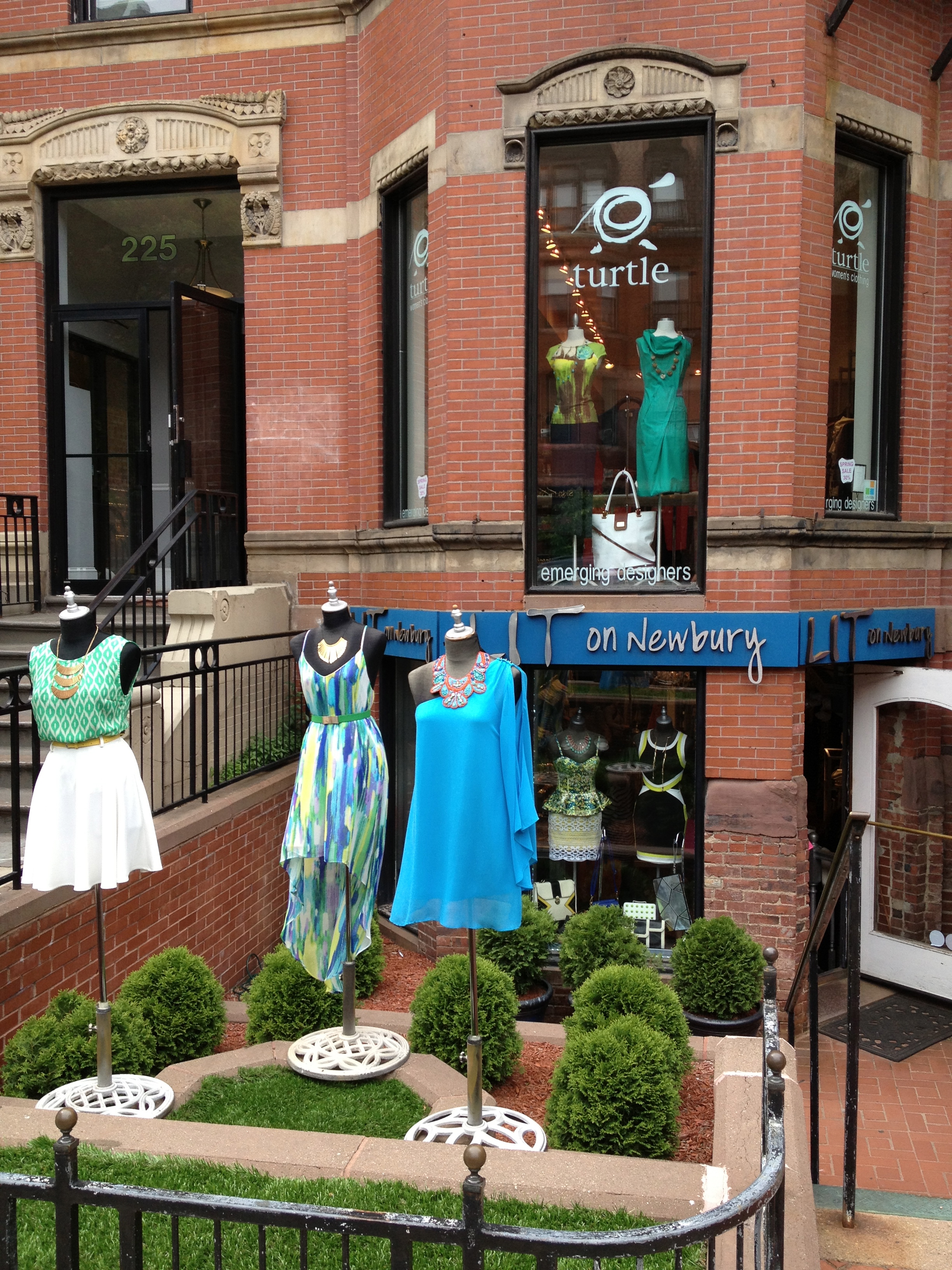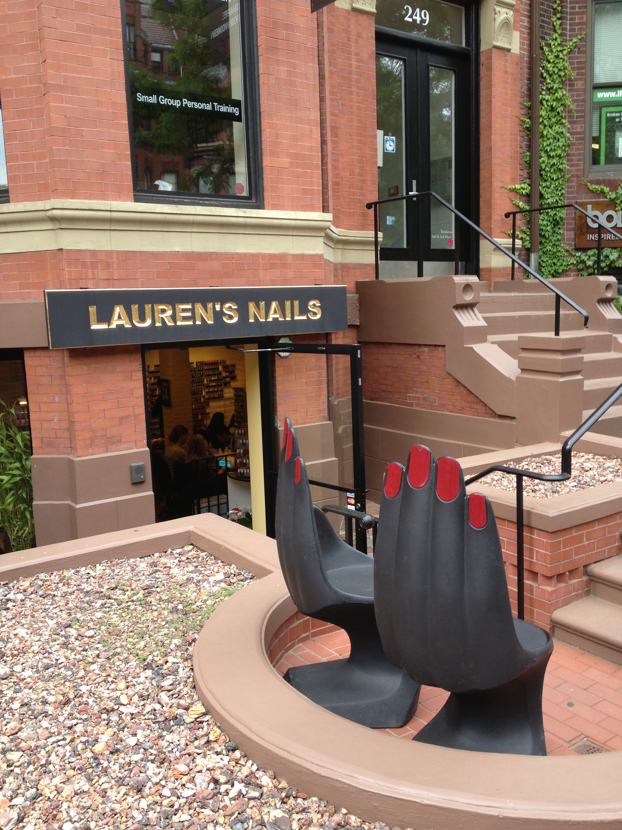 Et je rentre progressivement vers Back Bay, en traversant Commonwealth Avenue Mall, non pas un centre commercial mais une allée harmonieuse de parcs, une artère de verdure où s’échelonnent des statues. Un U-Turn et la ligne droite de Newbury St., longue de deux kilomètres, bordée d’arbres, de jolies boutiques, de terrasses me fait découvrir un petit magasin regorgeant de bonbons, irrésistible. J’aime également ces vitrines extérieures, présentant des vêtements dans les cours devant l’entrée de la boutique ou ces sièges en forme de main manucurée pour signaler un Nail Beauty.