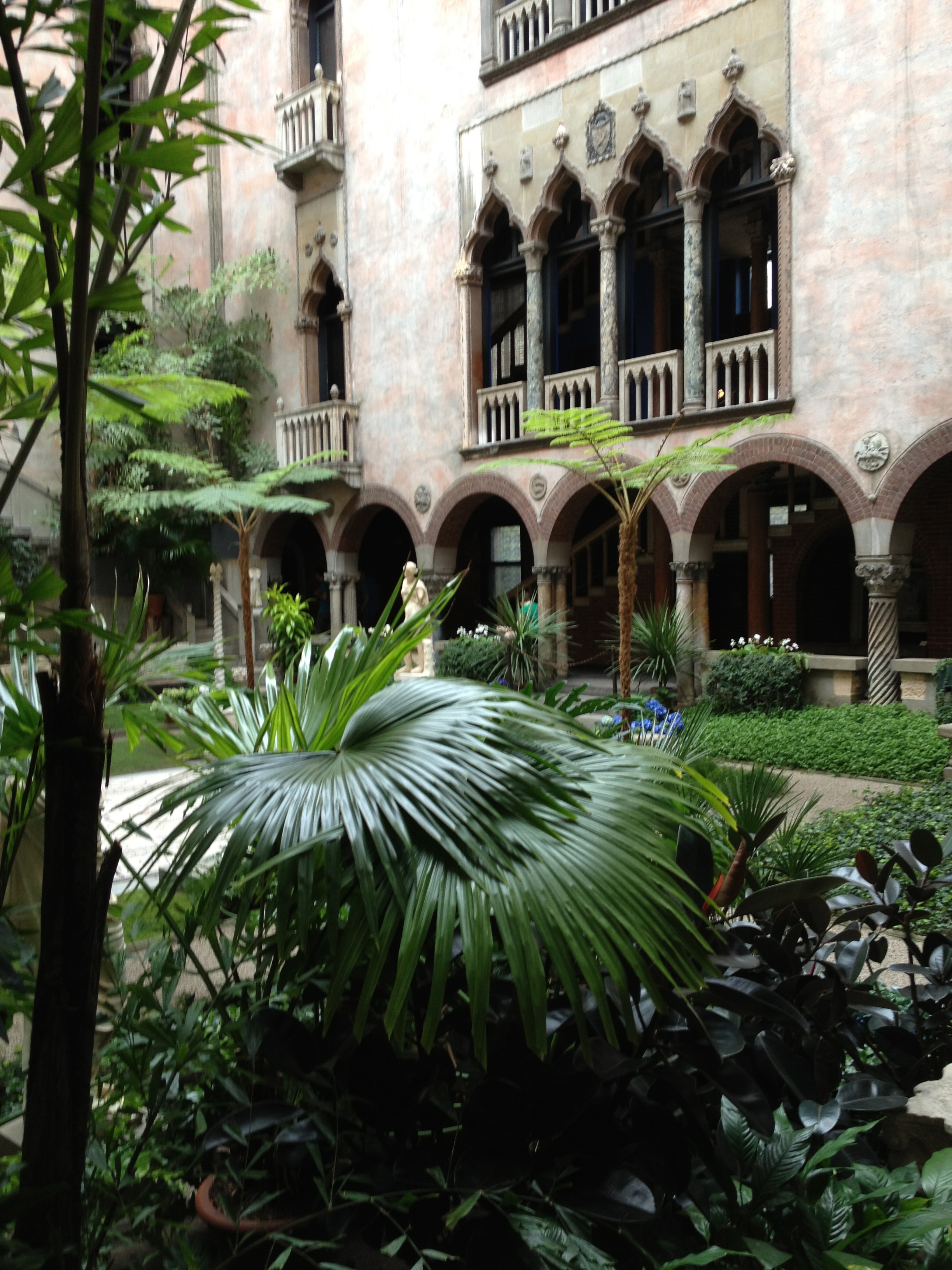 Le timing est parfait, nous nous retrouvons à l’hôtel vers 16 heures; Yves, après avoir rencontré un collègue de Babson College s’est dirigé vers Harvard pour se plonger dans l’ambiance et travailler à son aise, dans une librairie ou un café. Et c’est ensemble que nous partons vers le sud-ouest, en direction du Musée des Arts, agrandi il y a peu d’une aile moderne mais c’est un autre musée qui nous tente ce soir, le Isabella Steward Gardner Museum. Cette riche dame bostonienne, collectionneuse d’art et globe-trotteur pour acheter des œuvres, fit construire ce palais de pur style vénitien, sur trois étages pour y exposer ses quelques deux mille pièces. Elle fonde le musée en 1903 et y présente sa collection de peintures, de sculptures, d’objets d’art décoratif dans des pièces ouvrant sur une superbe cour intérieure plantée de fleurs et de plantes. Sa collection comprend des Rembrandt, Titien, Boticelli, Vermeer … certains tableaux ont été volés en 1990 et jamais retrouvés, est-ce pour cela que les gardiens sont si nombreux et que toute photo est interdite. En 2012, Renzo Piano conçoit une nouvelle aile, toute moderne celle-ci, aérée avec un salon, un restaurant, un jardin et sur la façade un portait d’un homme africain, imprimé sur un maillage, réalisé par Adam Pendleton, un artiste noir américain connu, ayant déjà exposé au MoMA et au Tate. Cette façade change tous les six mois, invitant des artistes à créer une œuvre pour cet endroit précis.