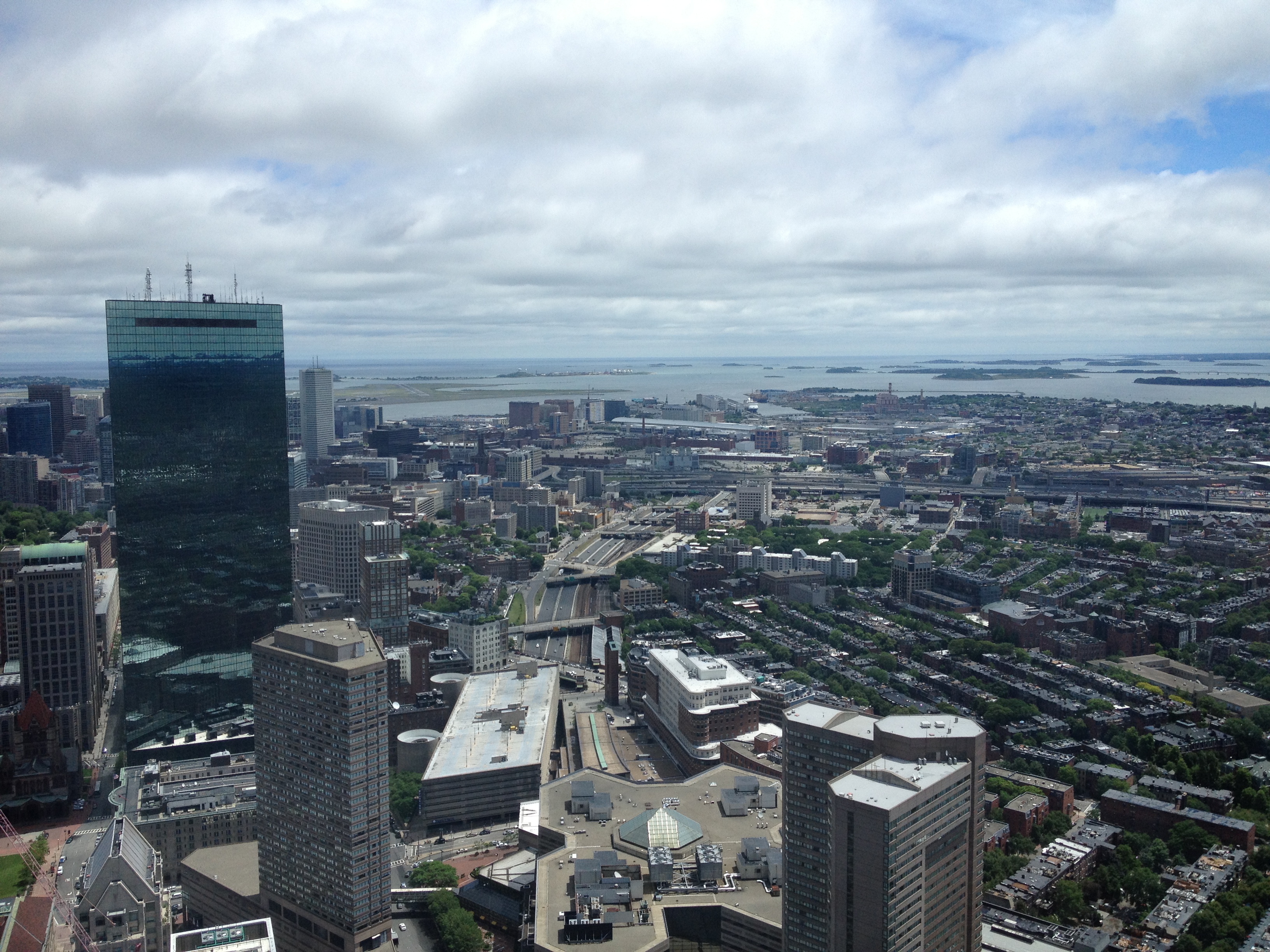 Nous avons réservé le lunch au restaurant panoramique qui se trouve dans Prudential Tower. Ainsi nous finissons notre séjour en beauté, au Top of the Hub, au cinquante-deuxième étage, attablés face à la Charles River et au MIT. En faisant le tour, nous reconnaissons les différents quartiers visités, sur un relief très plat jusque bien loin à l’horizon.