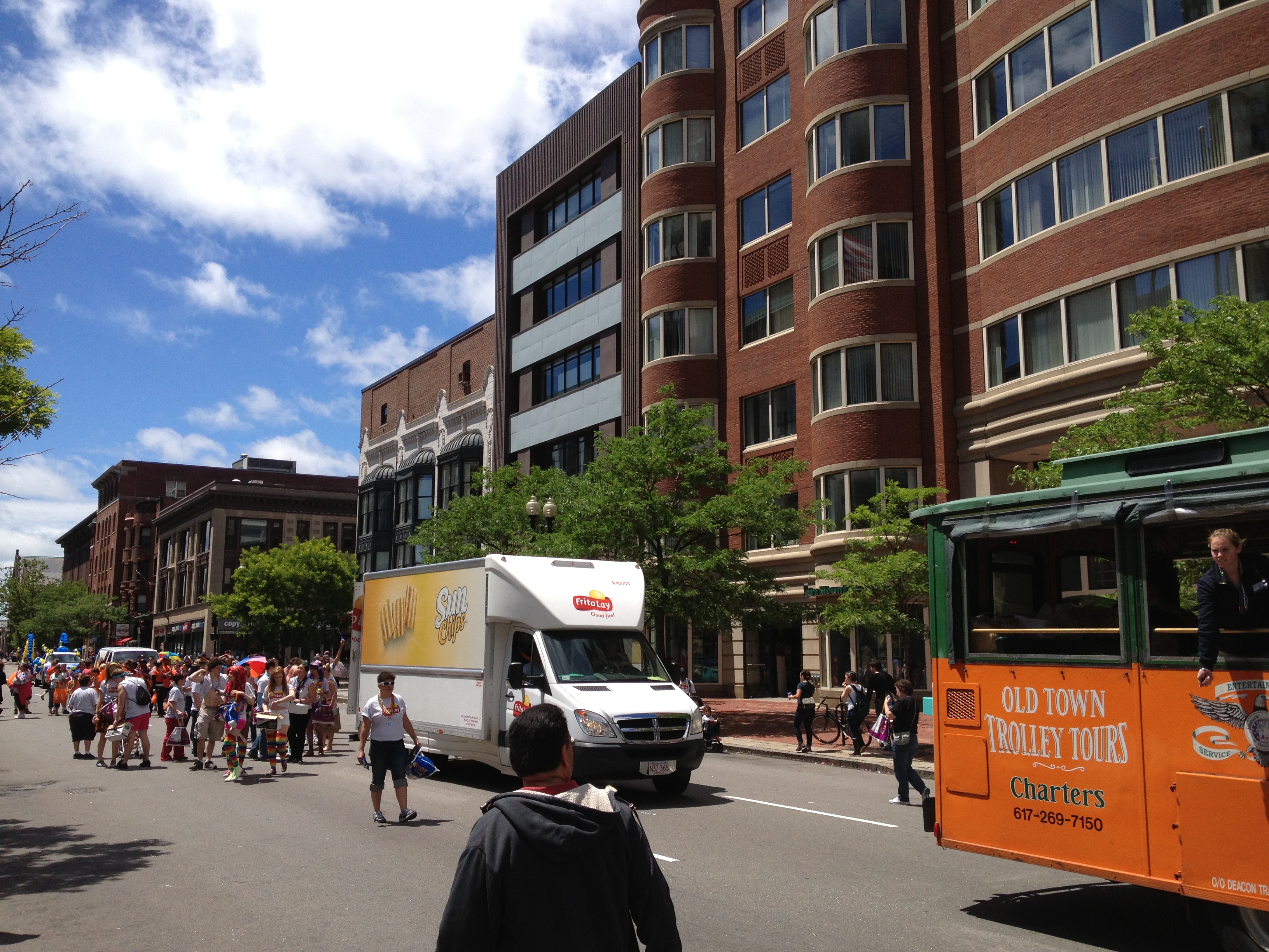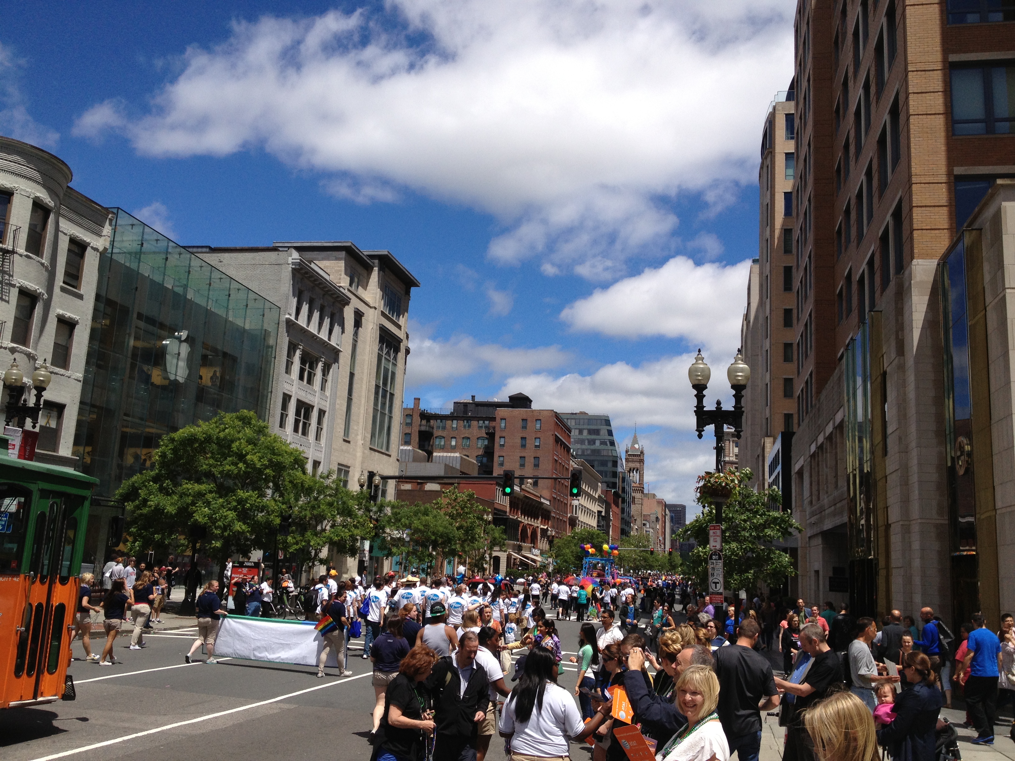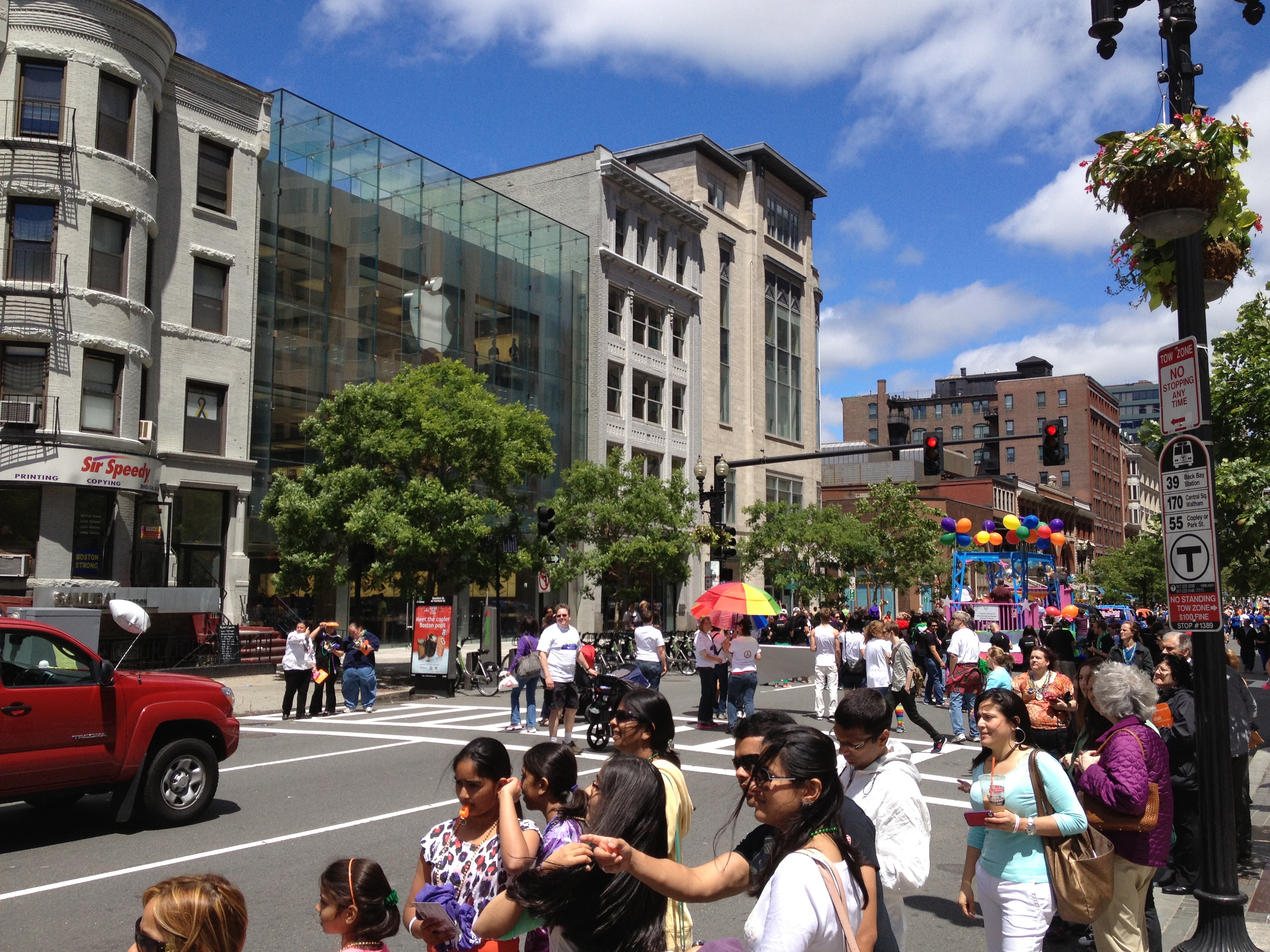 C’est la Gay Pride Parade aujourd’hui, il y a de l’animation pour le rassemblement sur Copley Square ; les voitures de police contrôlent le quartier et bloquent certaines rues.