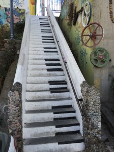 Aujourd’hui nous nous sentons déjà plus familiers à l’environnement et nous osons des divergences d’itinéraire pour rejoindre le Puerto – cette fois non pas pour monter à bord d’un bateau mais plutôt pour emprunter la ligne de métro qui longe la côte – d’ailleurs sur des terres reprises à l’océan. Notre destination est Viña del Mar dont plusieurs personnes nous ont vanté la beauté. Le parcours en métro est agréable, entre autres avec les distractions d’une joueuse de violon, puis d’un guitariste latino ou même d’un jeune rappeur en espagnol bien sûr. D’autres personnes vont passer dans les rames pour proposer soit des chocolats, soit des bouteilles d’eau fraîche … des petits boulots, pour de petites recettes dont de nombreux chiliens semblent avoir besoin.