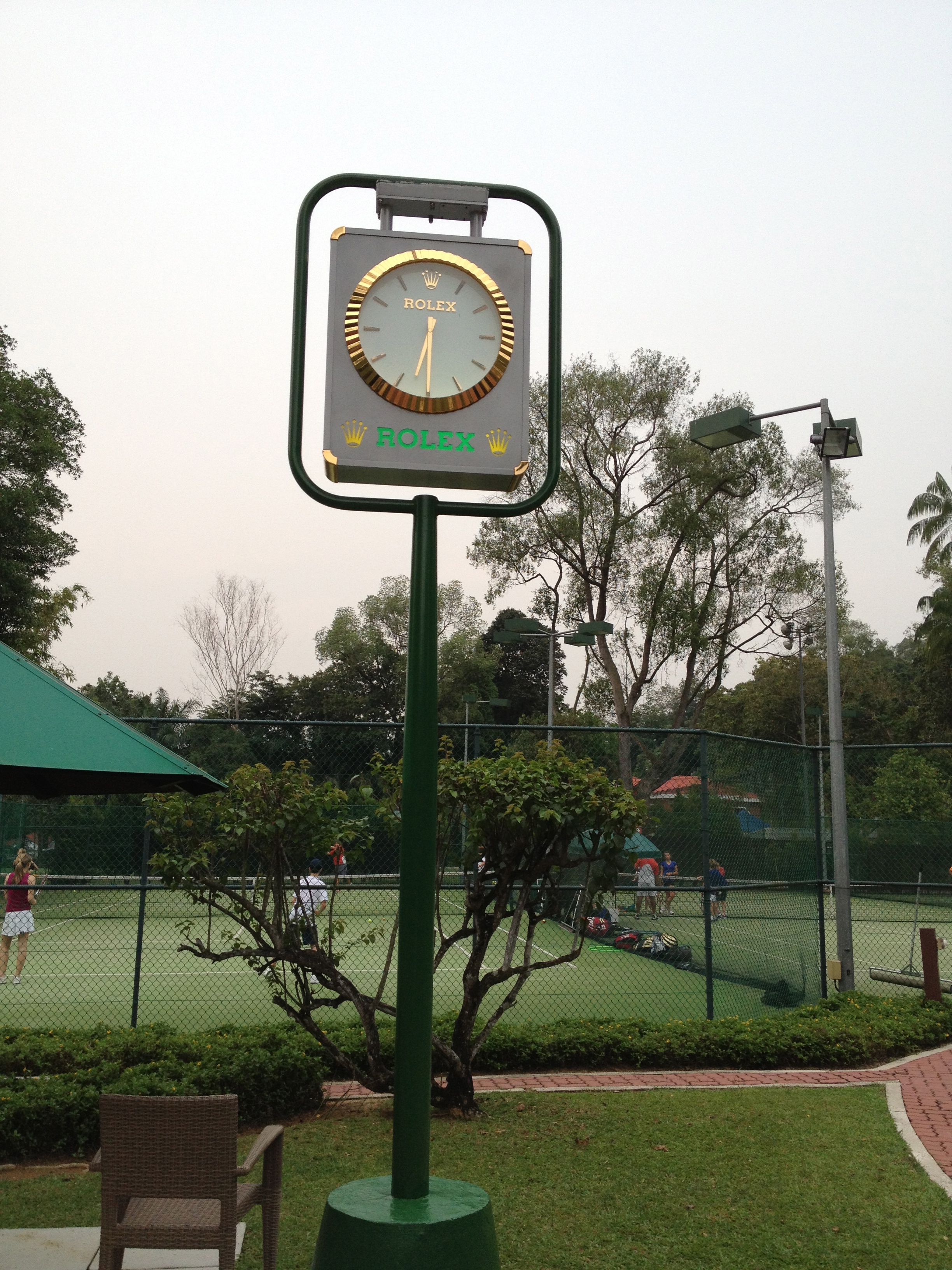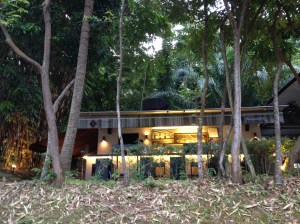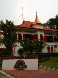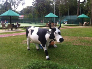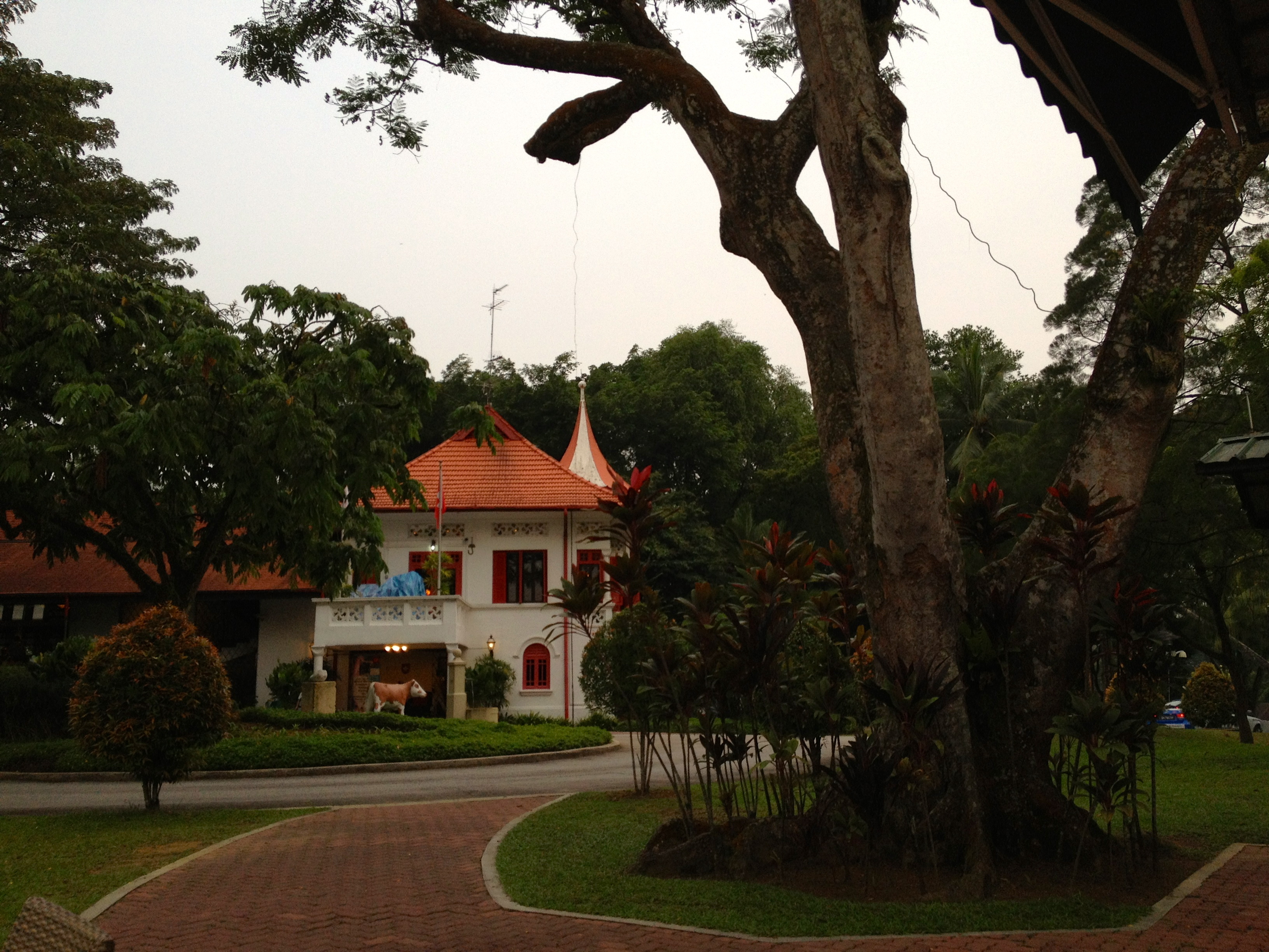 En fin d’après-midi, le bus me dépose en bas de la Swiss Club Road, rue qui monte, pas étonnant puisque nous avons rendez-vous ce soir avec la Suisse. Les maisons sont grandes, magnifiques et leurs propriétaires sans aucun doute de riches bourgeois de Singapour. Je montre patte blanche au garde à l’entrée du Swiss Club, un des clubs de la ville les plus appréciés, selon nos informations (un peu biaisées, je l’avoue). Une jolie bâtisse datant de 1927 et qui fut créée à l’origine pour servir de stand de tir aux suisses expatriés … pas question d’échapper aux tirs militaires obligatoires à l’époque ! La propriété se situe sur une petite hauteur et au milieu de la forêt, dont on reconnaît typiquement les bruits … et Yves a même vu passer un « dinosaure » tranquillement. Se trouvent ici aussi l’ambassade, une école suisse, des installations sportives comme les courts de tennis et la piscine, sans oublier le petit chalet en bois aux volets rouges et quelques vaches ! En attendant le début des « festivités », nous croisons par hasard Yin Yin … quelle coïncidence, c’est pratiquement ma seule amie locale (elle est membre du club et attend son garçon qui suit ici des leçons de tennis).