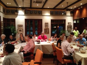 Yves est convié par l’association Swissnex, à faire une présentation pour les alumni HEC Lausanne, en position à Singapour ; ensuite un souper « fondue fromage » nous est offert pour ne pas nous permettre d’oublier nos racines. L’ambiance est hyper conviviale ; Yves reconnaît pratiquement tous les visages de ses anciens élèves. On parle beaucoup français, voire même vaudois mais aussi anglais avec des tous jeunes gens de Lugano. Par contre dans les bars et restaurants du club, c’est le suisse-allemand qui domine. Nous sommes une vingtaine et les contacts se font rapidement ; on échange, en fait pour nous c’est plutôt recevoir, des informations sur la vie à Singapour et en Asie. Plusieurs couples se sont installés il y a une dizaine d’années et n’envisagent pas du tout un retour en Europe ; ici ils apprécient le climat, la nature, le statut qui leur permet d’avoir une maison et du personnel. Par contre à l’âge des études universitaires, la jeunesse s’échappe aux Etats-Unis ou en Europe, par besoin de liberté et aussi de connaissance de leurs racines. Et c’est ainsi que dans la conversation, Arne, mon voisin, me parle de Claude et de Daniel, deux amis très proches … et soudain le monde se rétrécit ! Ou alors, après avoir papoté un bon moment avec Alexandra, nous nous apercevons que nous avions fait connaissance, il y a plus de vingt-cinq ans, lors de grillades à La Forclaz, chez Isabelle, la première assistante de Yves. Elle nous demande des nouvelles de Gabor, d’Alex, etc. La soirée se passe ainsi dans une ambiance excellente et les cartes de visite s’échangent de-ci de-là … on se reverra !