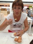 Le petit-déjeuner au Toast Box est surprenant ce matin par le fait tout d’abord que les œufs mollets nous sont donnés ainsi dans une petite coupelle … un peu chaud pour les doigts … ne connaissent-ils pas les coquetiers? Ils sont toutefois savoureux, même si on n’a jamais vu de poules ici, tout comme les toasts et buns au beurre parfumé provenant d’une jolie montagne sous cloche réfrigérée et aussi le café et thé latte dont la préparation est amusante, rappelant aux nostalgiques singapouriens le Nanyang coffee fraîchement grillé ; la serveuse transvase x fois le mélange d’une grande cruche à une autre, ajoutant lait, cacao Nestlé, sirop de sucre, en soulevant bien haut son geste, comme pour le thé marocain. Le résultat nous surprend en bien, c’est délicieusement doux et sucré.