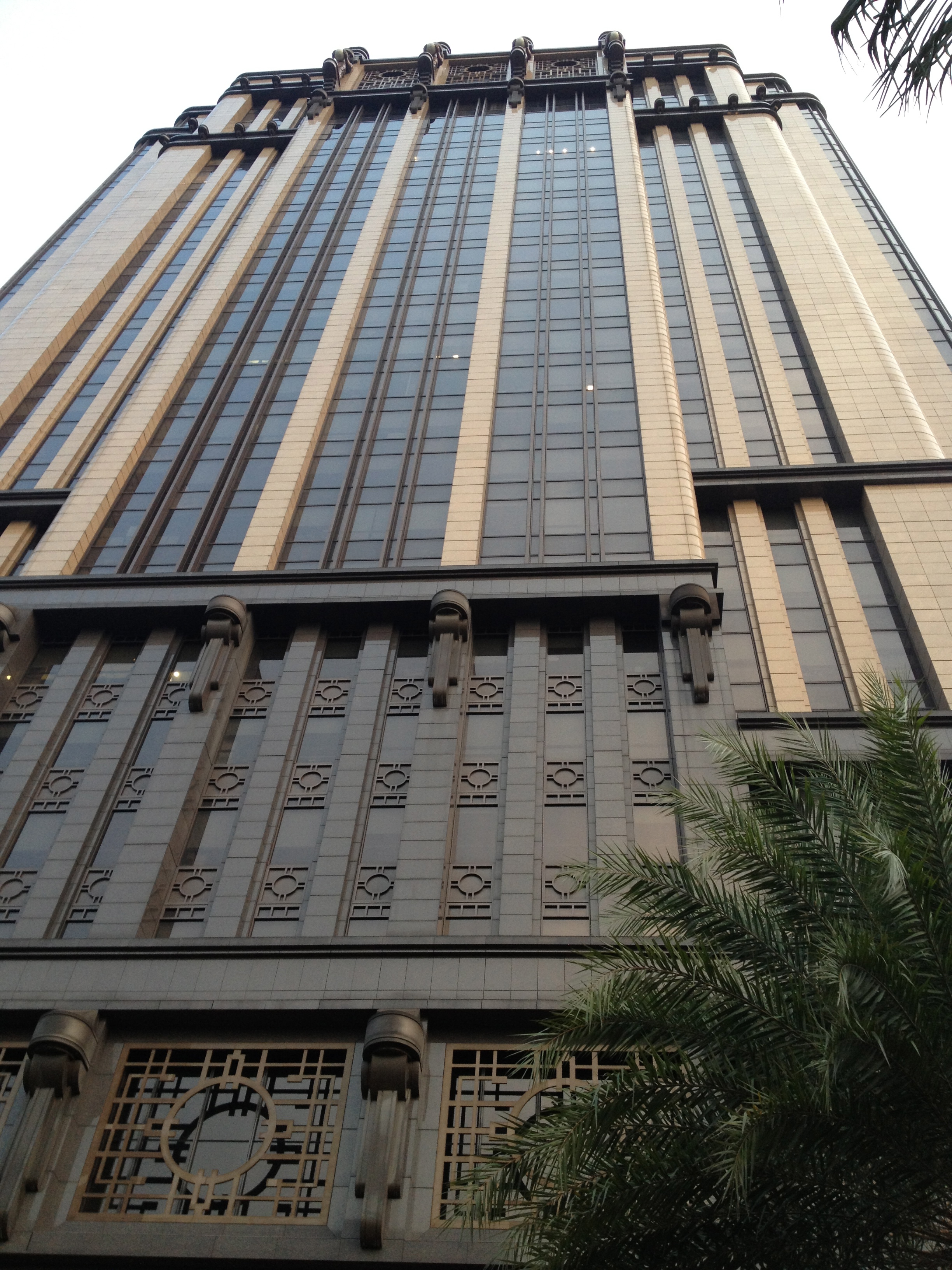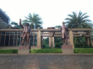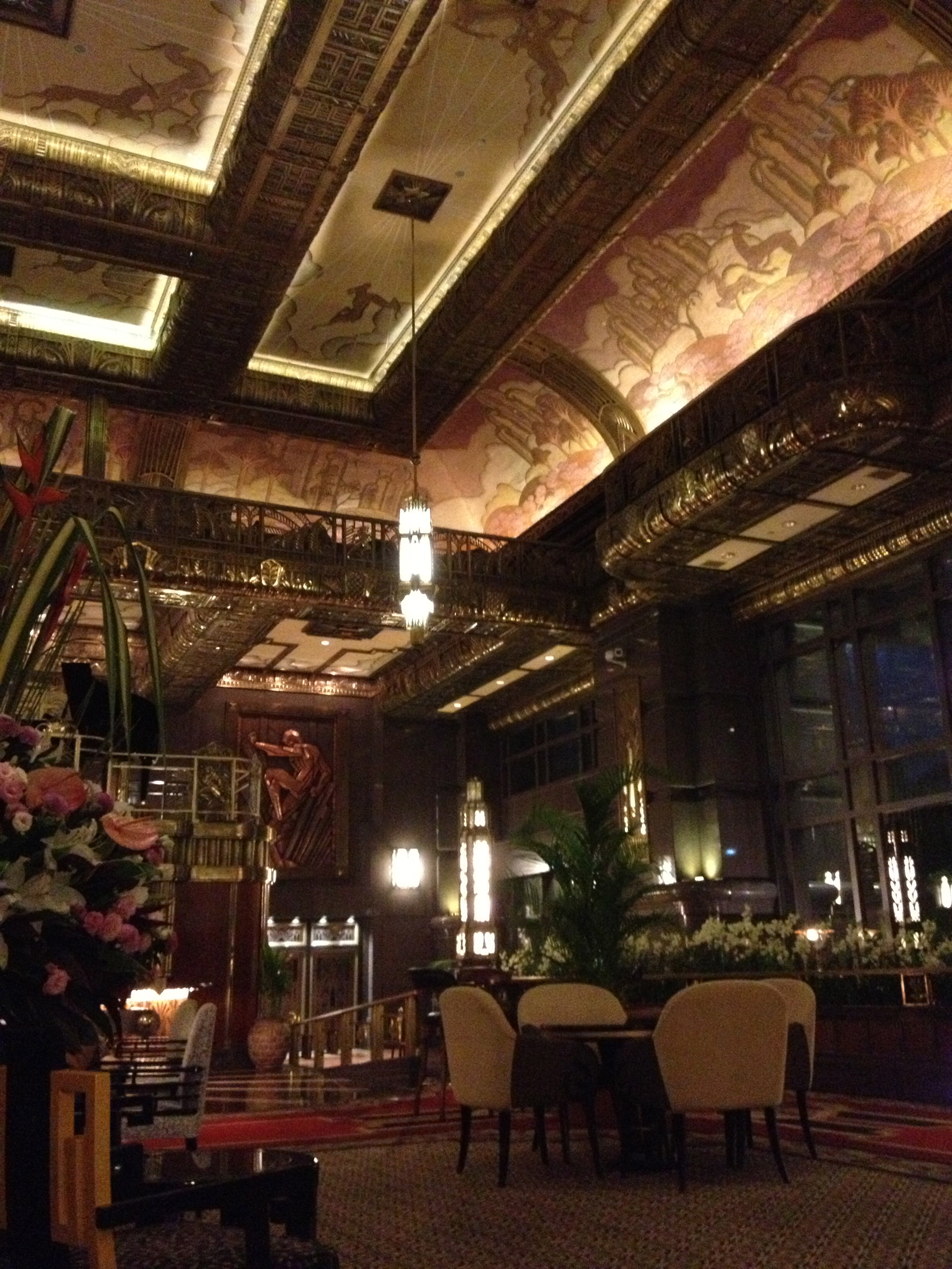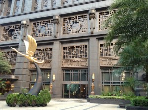 Il fait bon se promener la nuit dans Singapour illuminée, animée, sans agressivité et aussi prendre un dernier verre dans un bar, pourquoi pas ? Celui de ParkView Square est réellement extraordinaire comme architecture, aménagement et décoration. Le bâtiment est relativement récent (une dizaine d’années), construit sur le modèle du Chanin Building de New York, pour un chinois de Taiwan par un groupe d’architectes locaux , comme Office Building le plus remarqué de son époque. Le rez de l’immeuble est un immense bar, complètement « art déco » des années 1920, une hauteur de plafond à quinze mètres, avec des bouteilles rangées sur une hauteur de trois étages, auxquelles les serveuses accèdent agrippées à une corde et hissées par un treuil (malheureusement pas de démonstration ce soir, nous n’avons sans doute pas choisi le bon breuvage;-). Chaque pièce de mobilier, table, fauteuil, lustre, statue, revêtement de mur, de plafond est une œuvre originale d’artistes internationaux et d’une sophistication et un luxe incroyables parfois, mélange de verre, de marbre, de bronze, de bois, de cuir. Des statues de grands hommes comme Churchill, Platon, Chopin, Dali, etc gardent le parvis de ce building imposant et une énorme grue dorée pointe vers la Chine. Et voilà comment notre curiosité nous mène parfois dans un endroit insolite, auquel les guides ne font pas référence.