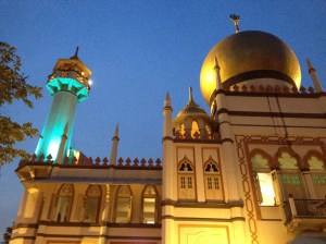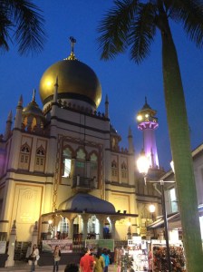 Ce samedi j’ai encore un coin de la ville à montrer à Yves; il s’agit du quartier arabe avec ses ruelles de petites boutiques design, le Blue Jazz Cafe dont les graffitis colorés sur les façades créent la polémique auprès des autorités, ses chichas au parfum agréable, Bussorah street et ses restaurants turques, marocains ou égyptiens. La magnifique mosquée du Sultan, avec ses éclairages nocturnes, séduit Yves comme je l’ai été dans la semaine; c’est réellement un petit quartier très plaisant.