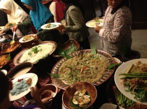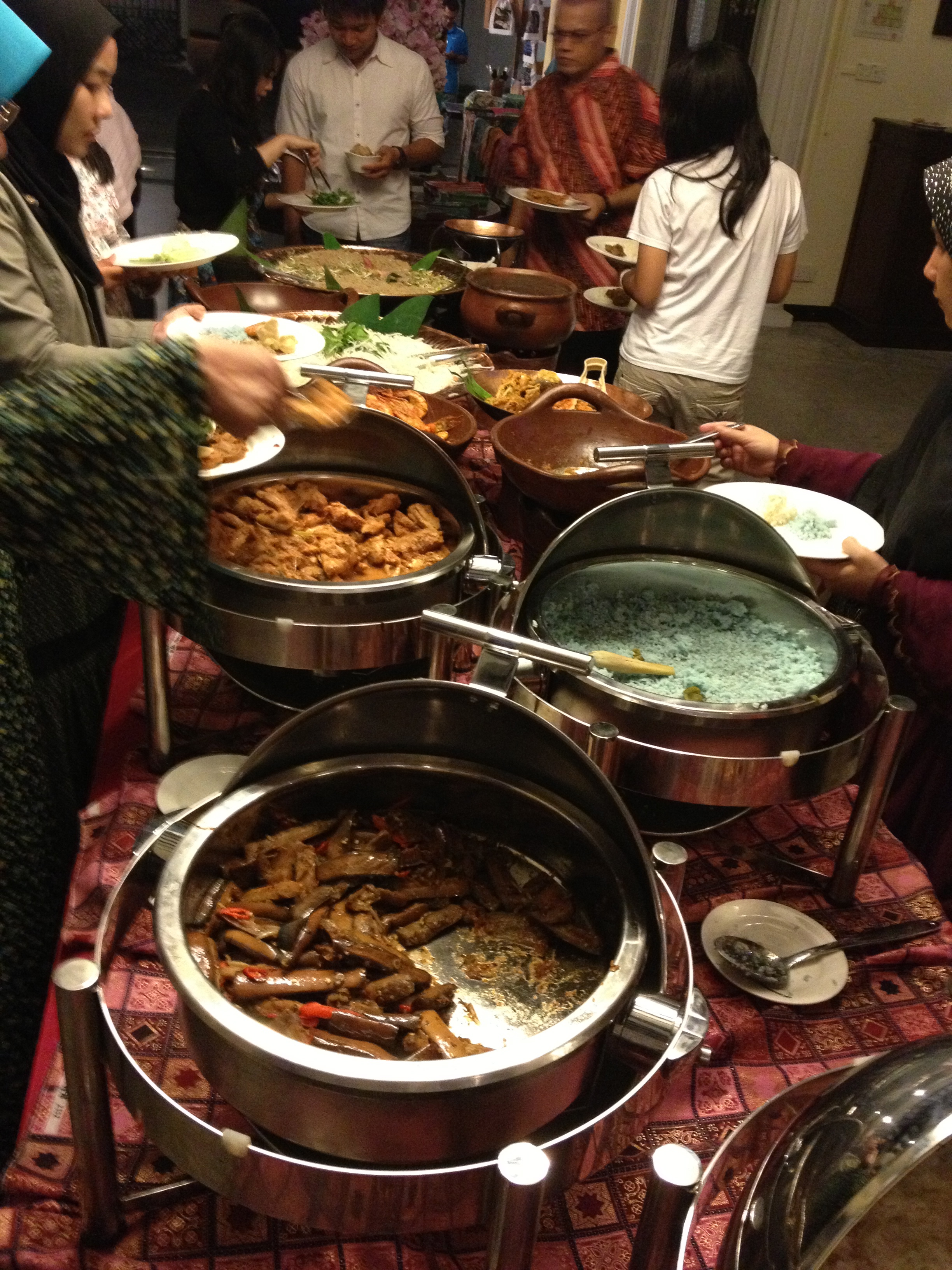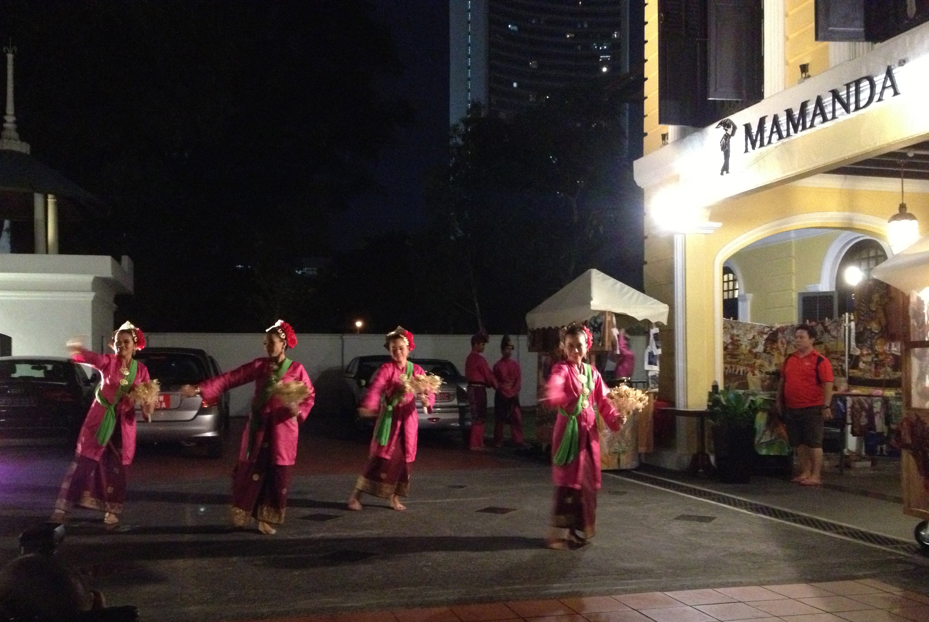 Le Mamanda propose ces jours un Food Festival pour promouvoir la Malaisie. Nous sommes installés dans la cour, avec une jolie vue sur le parc et le musée et nous dégustons des mets délicieux d’un buffet où couleur, odeur, saveur sont les maîtres mots. Pas d’alcool dans le monde musulman, je me hasarde à une boisson rouge pensant que c’est une sorte de grenadine probablement et j’y retourne plusieurs fois, à la pompe de cette boisson aromatisée à la rose, un régal! Nous sommes aussi aux premières loges pour les danses folkloriques qui animent la soirée; rythme, couleurs, fleurs, or, soies, sourires, séduction … nous sommes sous le charme. L’ambiance est très conviviale, les dames engagent la conversation facilement alors que nous n’avons pas du tout le look des musulmans présents ce soir. Au final, chaque danseur et danseuse vient chercher un nouveau partenaire pour l’accompagner dans une dernière danse; je vous laisse deviner qui reste assis et qui est entraînée! Je m’y amuse et passe une soirée magique. Cela donne envie d’aller découvrir leur pays, leur but est atteint… et on reçoit des cds de musique et de reportages sur la Malaisie. Nicole nous a d’ailleurs donné cet après-midi un beau conseil pour un éventuel voyage.