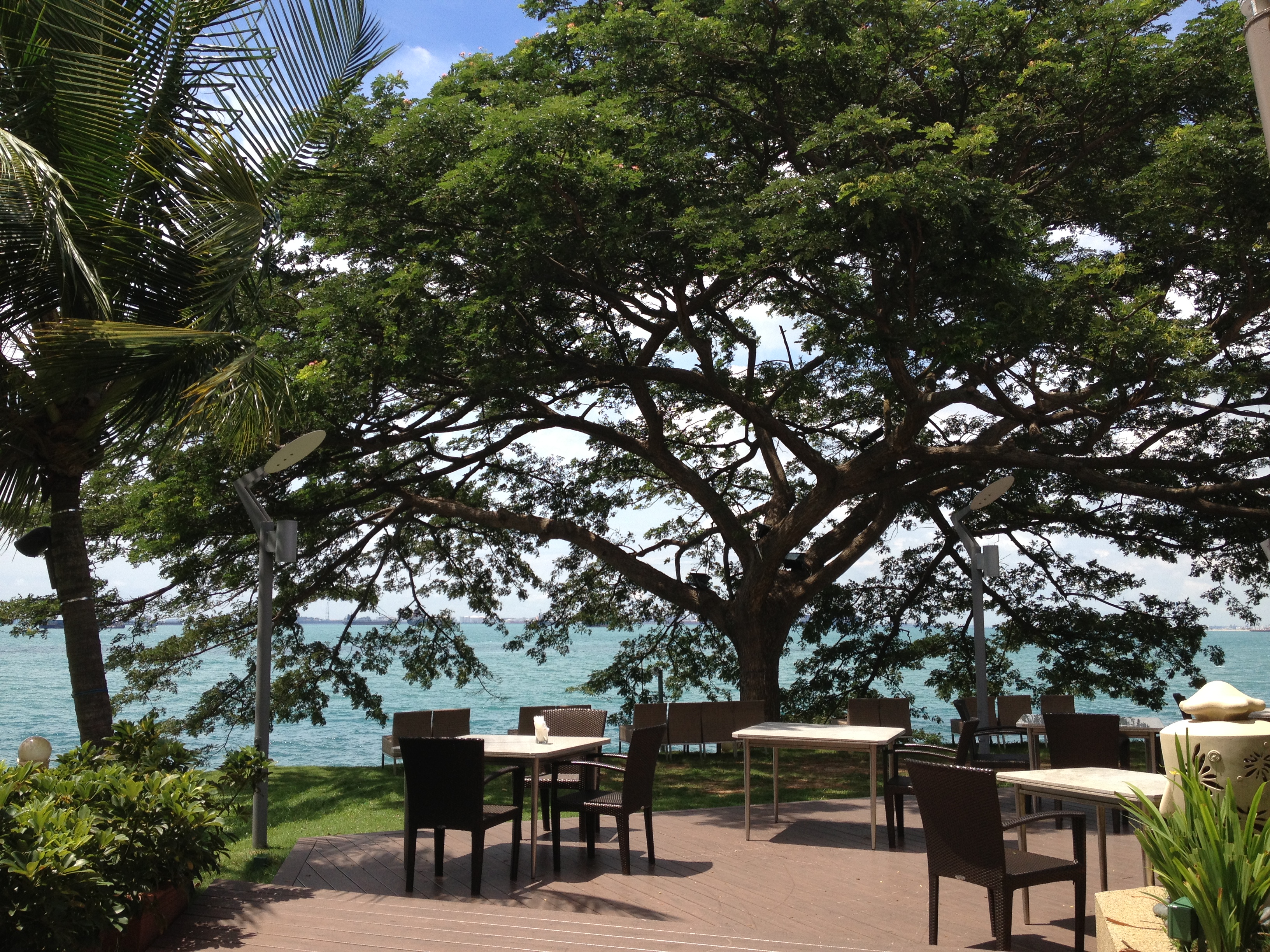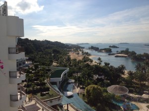 Yves a envie d’évasion ; quoi de plus simple que de se retrouver au paradis de Sentosa pour le week-end … et la connexion y est excellente pour mon travail de bloggeuse. Le samedi démarre par des fortes pluies, qui nous font presque rire … pour autant que l’on puisse s’abriter ou trouver un taxi. L’odeur de cette humidité équatoriale est très caractéristique ; on s’y fait et les ventilations font tout leur effet. Les paons sont toujours nos compagnons sur la terrasse du Shangri La et notre chef coq marocain nous reconnaît aussi ; son couscous royal est succulent ainsi que l’assiette de fromages français qu’il nous offre à présent chaque fois !