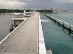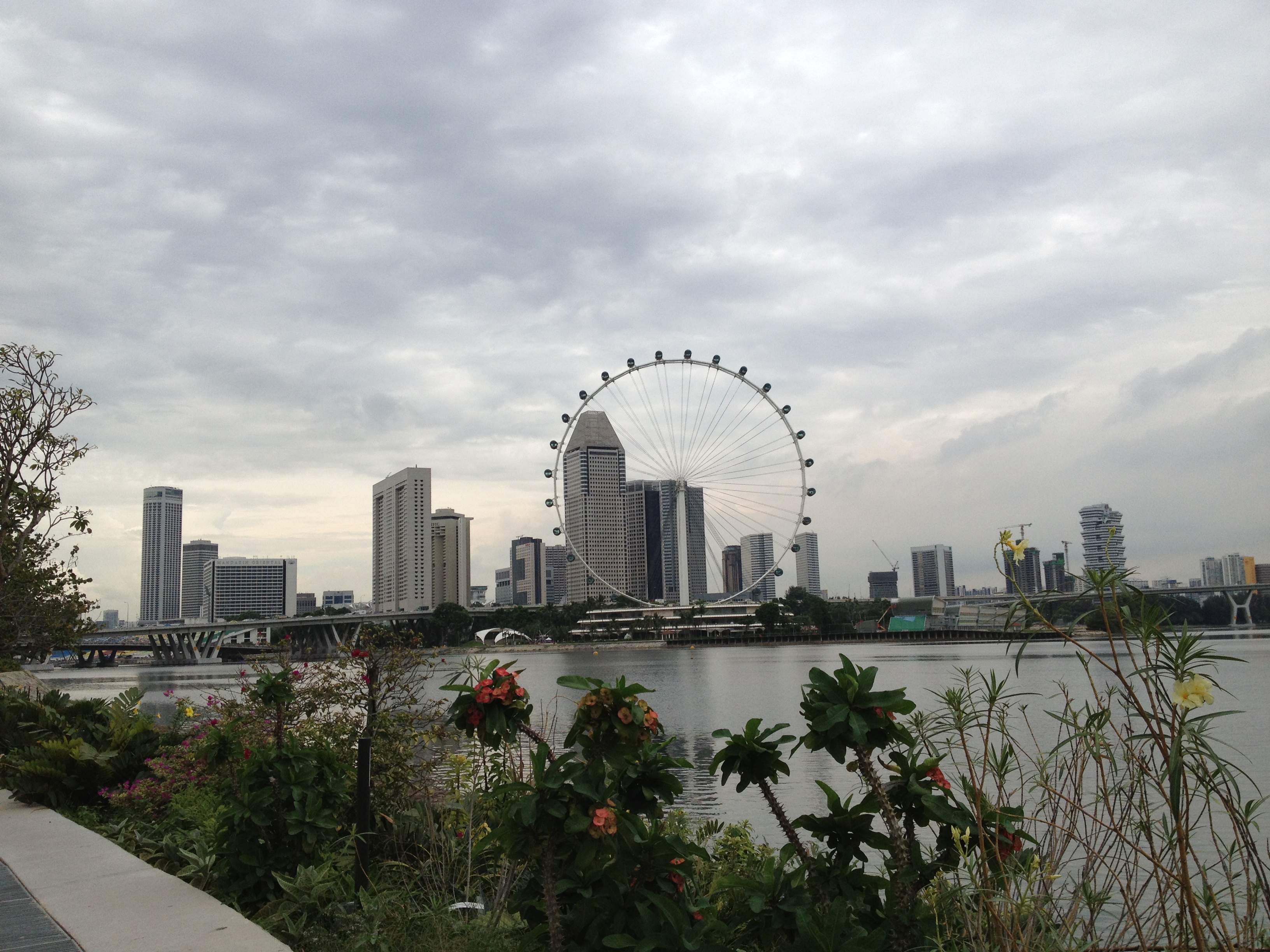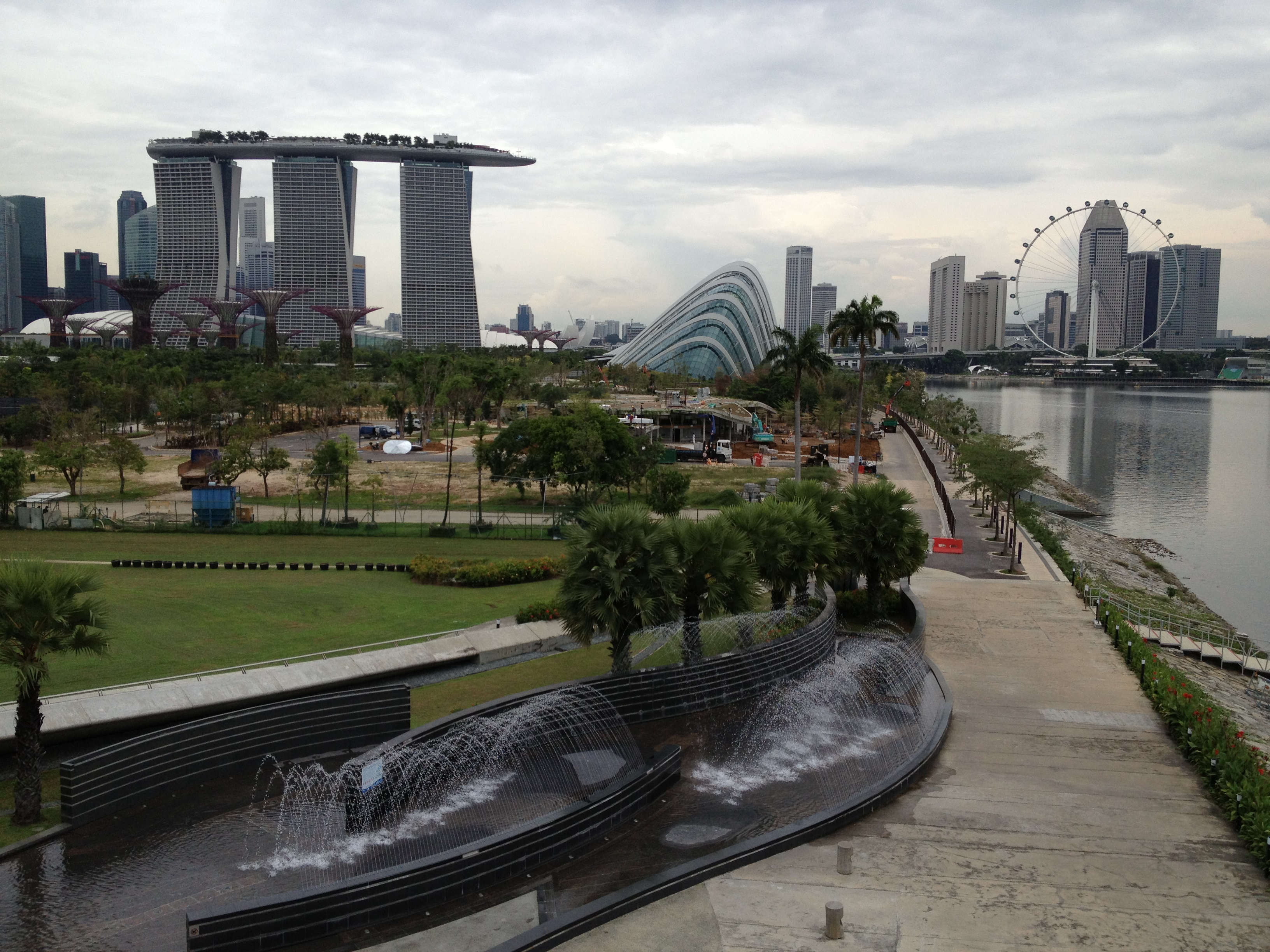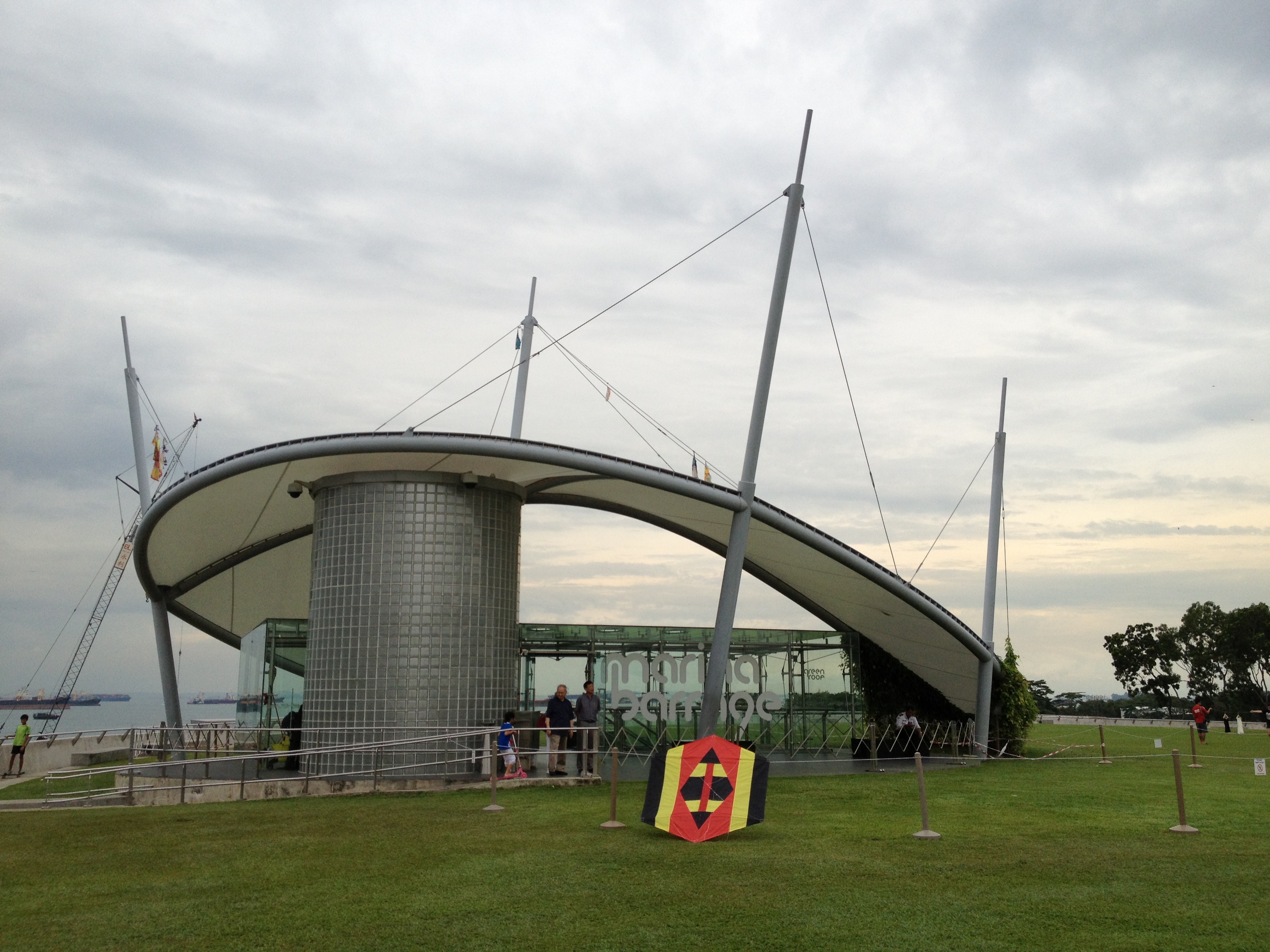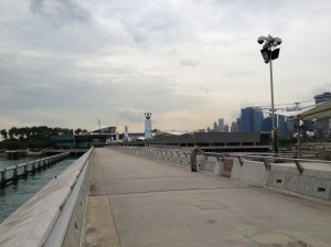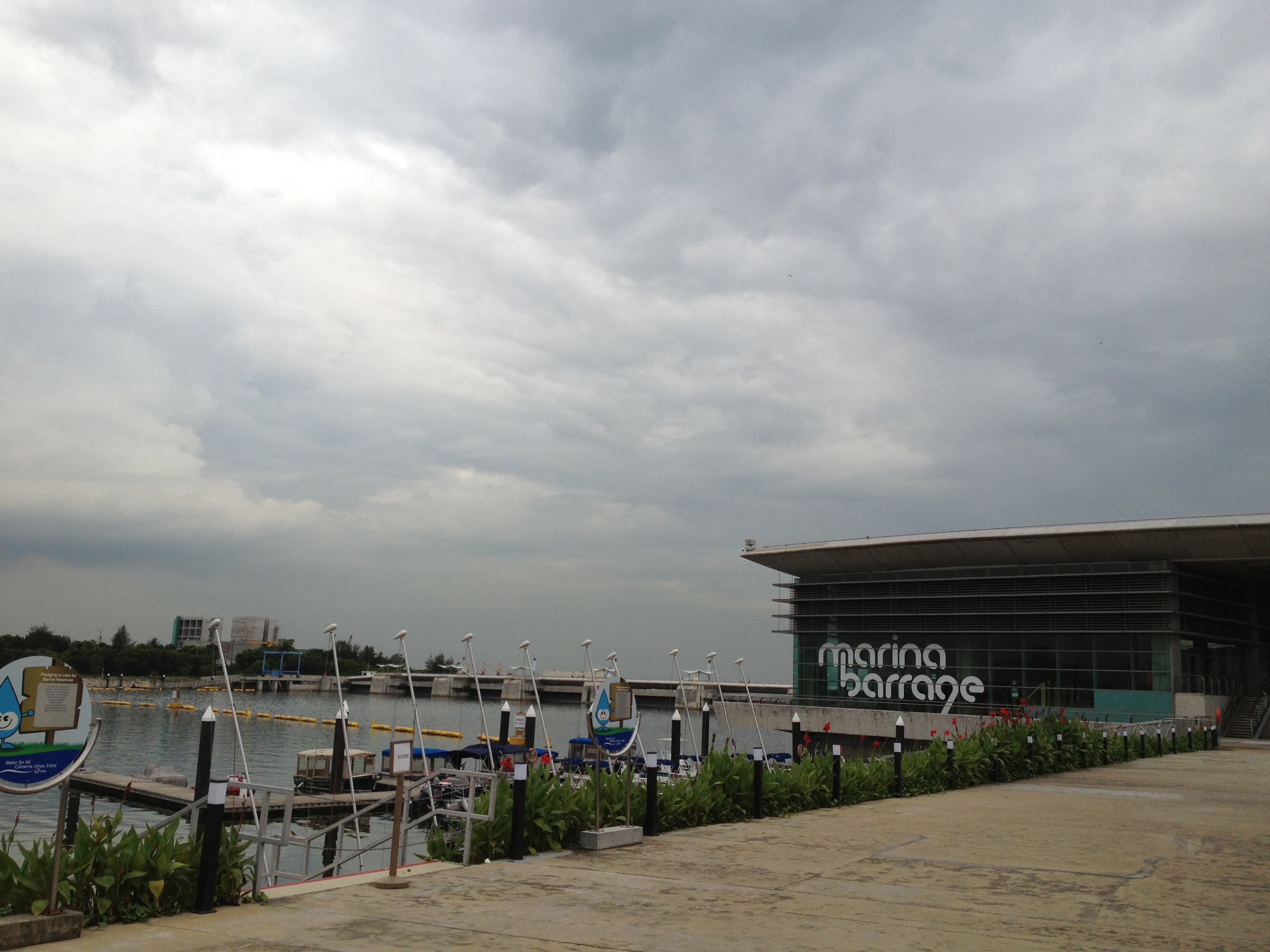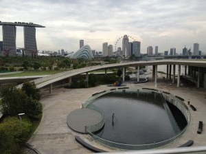 Le ciel est couvert mais pas trop sombre, je profite de me trouver dans le quartier des affaires pour contourner la baie, regarder les premiers petits sapins de Noël offerts par les sociétés pour des œuvres caritatives et rejoindre les Dômes des Gardens avec l’objectif de parvenir au barrage. Je croise peu de monde sur la balade le long de l’embouchure de la ‘river’ … c’est beau, c’est paisible. J’aperçois le barrage et non seulement celui-ci mais également un énorme espace et bâtiment en forme d’anneau, de spirale qui s’élève. Oh! comme c’est impressionnant … et en me retournant je découvre un autre point de vue de Marina Bay. La plaine au-dessus de l’édifice, couverte de gazon, a la superficie de quatre terrains de football ; c’est un endroit privilégié pour les cerfs-volants. On aperçoit les turbines du barrage dans une grande salle aux parois vitrées et il y a également un joli musée sur la thème ‘SustainableSingapore’ … l’eau est un sujet de première importance pour la ville. Le barrage s’étend sur 350 mètres, que l’on parcourt sans autre, à pied ou à vélo.