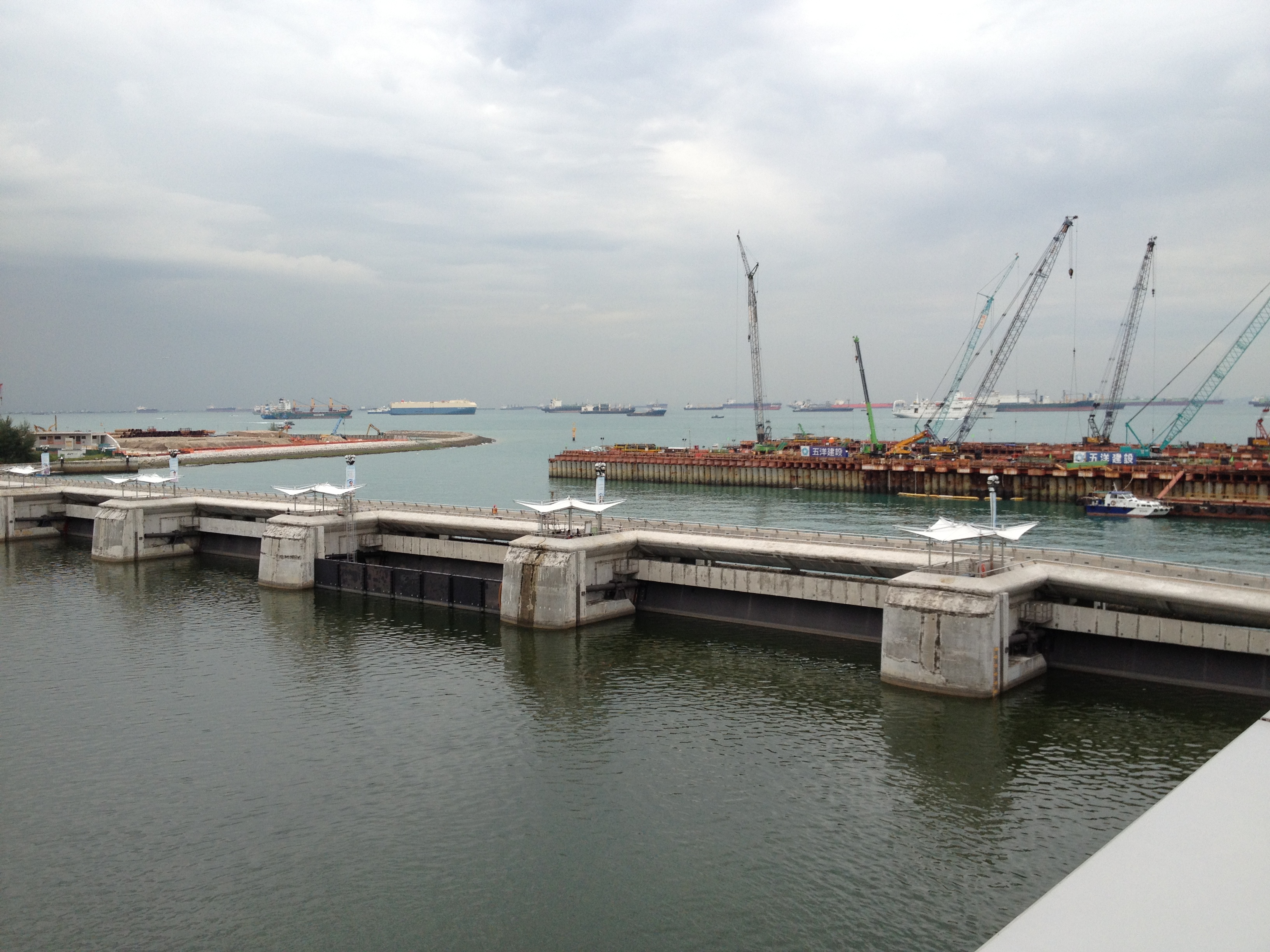 Je n’avais pas vu figurer le site sur les guides touristiques et ma surprise en est d’autant plus belle. Sur le toit du bâtiment et aussi sur le barrage lui-même, le vent marin fait rêver, la vue se porte au loin soit vers la ville, soit vers l’océan et ses gros porte-containers en stagnation.