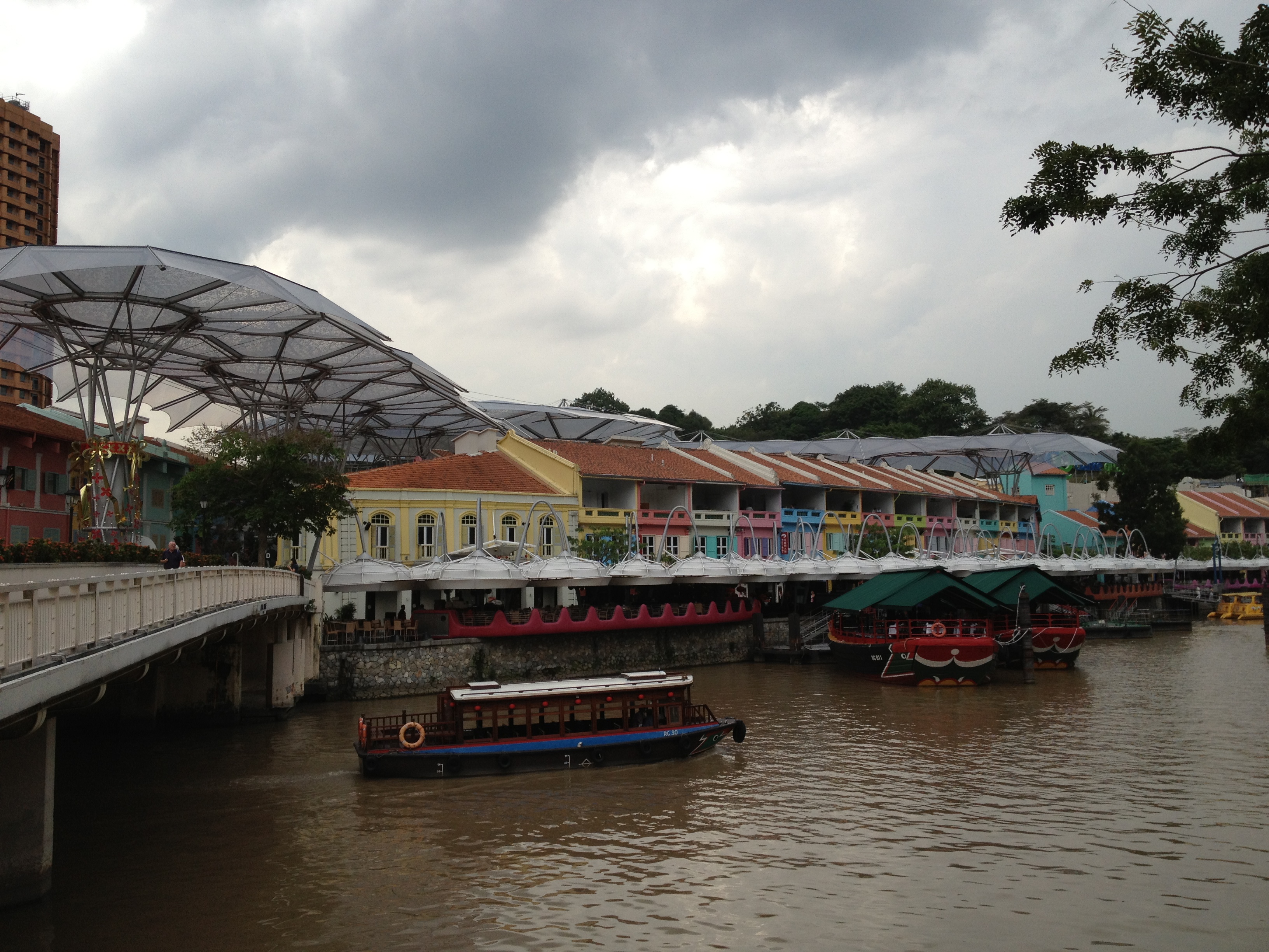 Après un passage rapide à l’appartement, je repars avec Yves en ville pour un souper au Grand Shanghai, offert par Virginia Cha, une de ses collègues originaire de Shanghai elle-même mais élevée en Thaïlande, ayant étudié à Hawaï, lancé des entreprises en Chine et installée à Singapour où elle a fait un Doctorat à l’âge de cinquante ans ! Selon elle, c’est le seul vrai restaurant chinois, typique « old fashion » avec un groupe de musique live mais surtout « it is the place to be » pour faire du business avec les chinois ; les touristes ne fréquentent pas l’établissement ! Nous la laissons choisir pour nous une quantité de plats qui viendront garnir notre table ; tout est très très bon et comme c’est l’habitude souvent, elle a apporté sa bouteille de vin ! Le maître d’hôtel et les serveuses sont très attentionnés ; normal, nous dit-elle, je les « arrose » d’un gros pourboire une fois par année (c’est la coutume). Soirée très agréable que nous terminons par une balade en amoureux sur les trottoirs éclairés de Robertson Quay, un des trois quais animés de la River.
