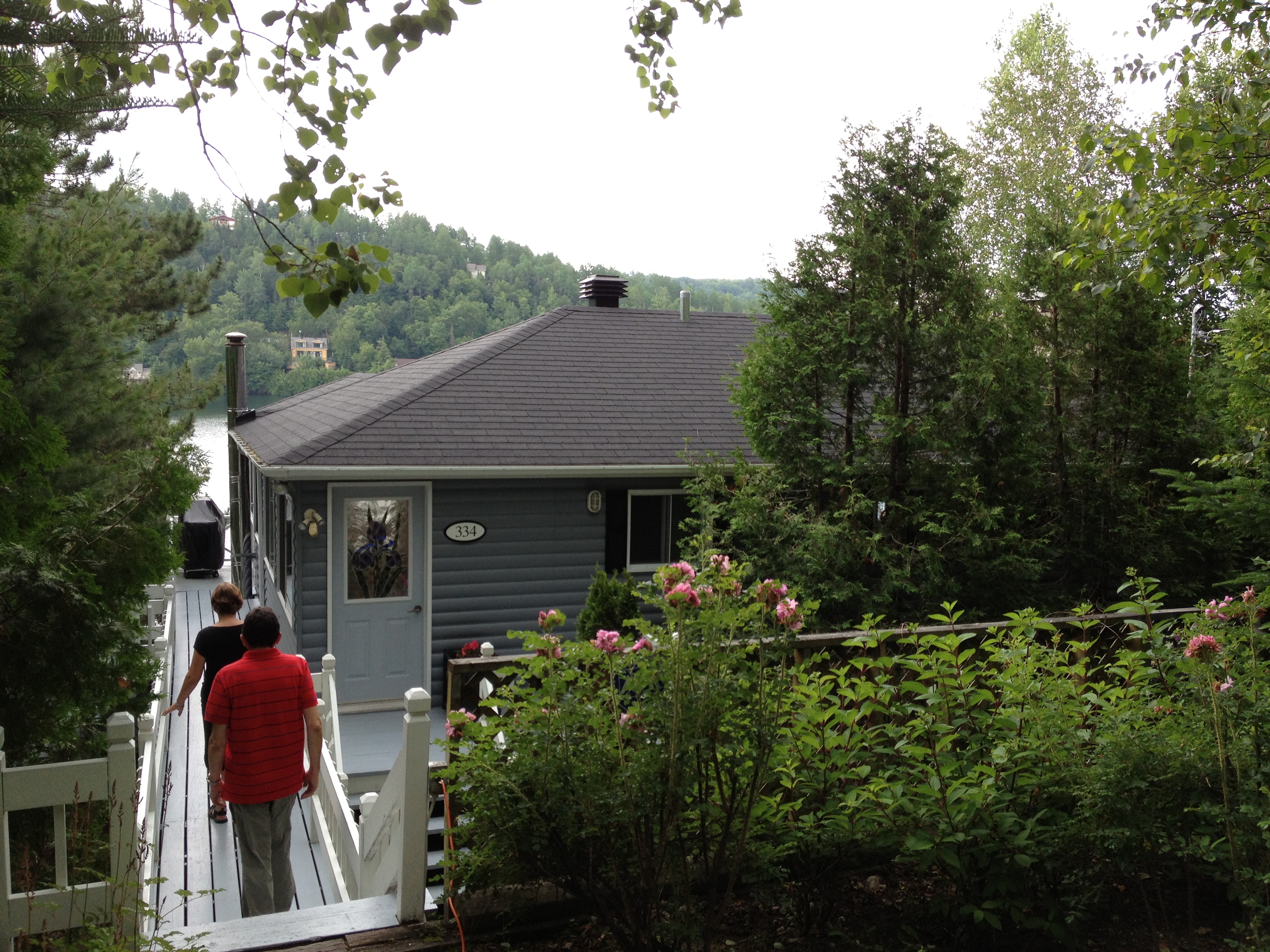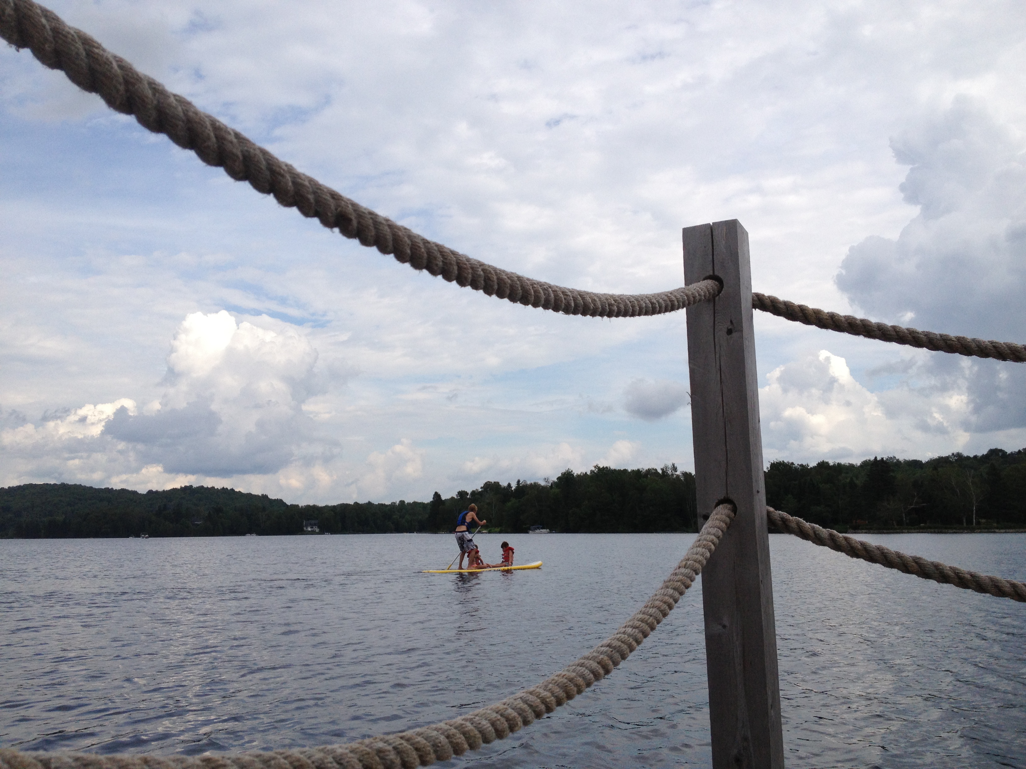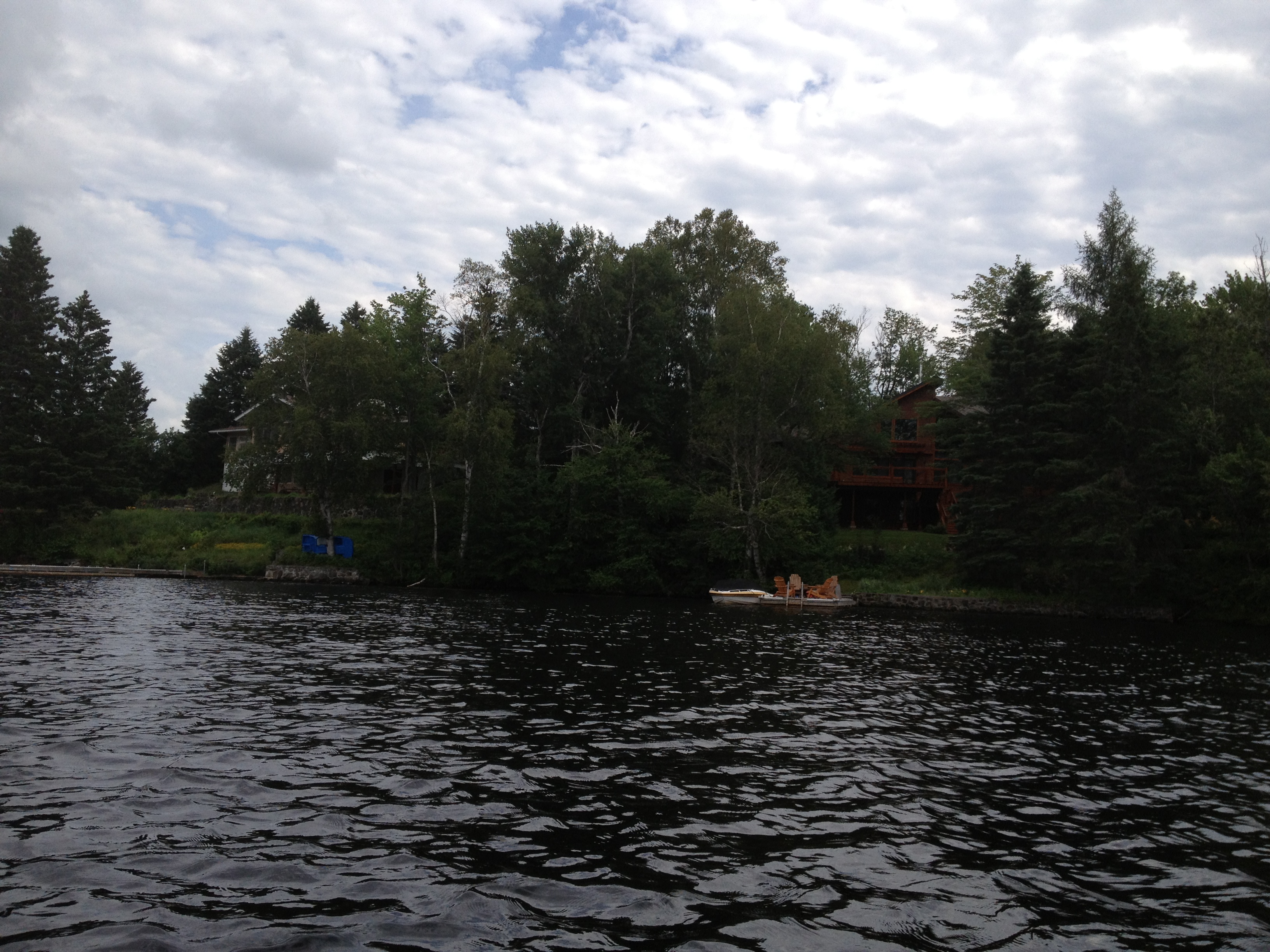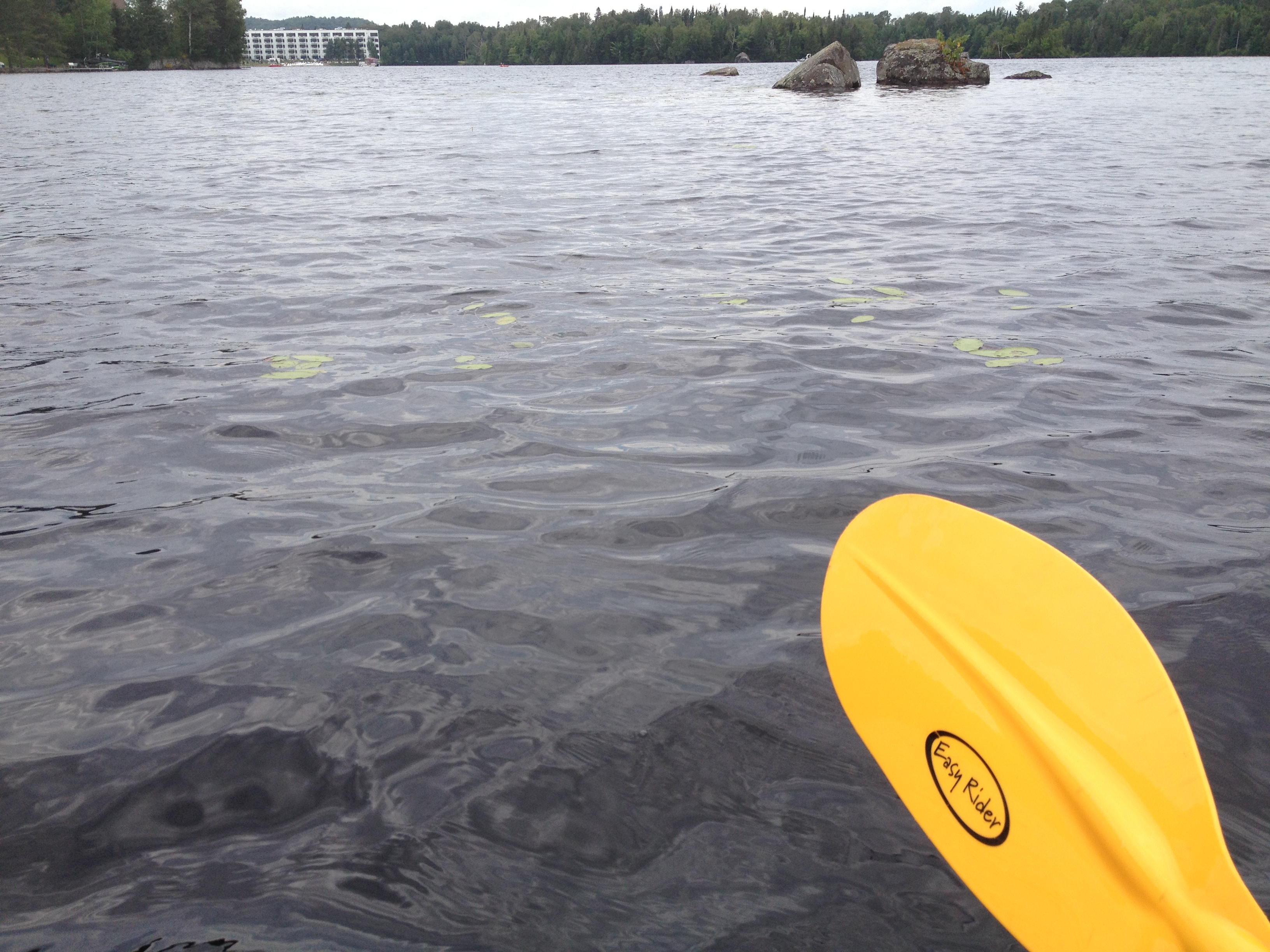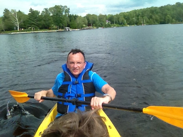 Nous resterons ‘fit‘ car l’ascenseur est en panne. De plus, nous nous lançons dans une randonnée en kayak double, sur ce lac Dupuis; il s’agit de faire attention aux petites îles et aux rochers. C’est très amusant et physique pour les bras … nous nous faisons parfois secouer par la vague de poupe d’un plus gros bateau à moteur, nous traversons un tapis de nénuphars. Isabelle perturbe pas mal son mari, elle est difficile à suivre car son rythme est loin d’être régulier – un coup à droite, deux à gauche! Nous nous sentons à présent de vrais canadiens; tout le monde nous parle ici de kayak, un sport vraiment proche de la nature. La fin de journée est douce, calme, inondée de quiétude.