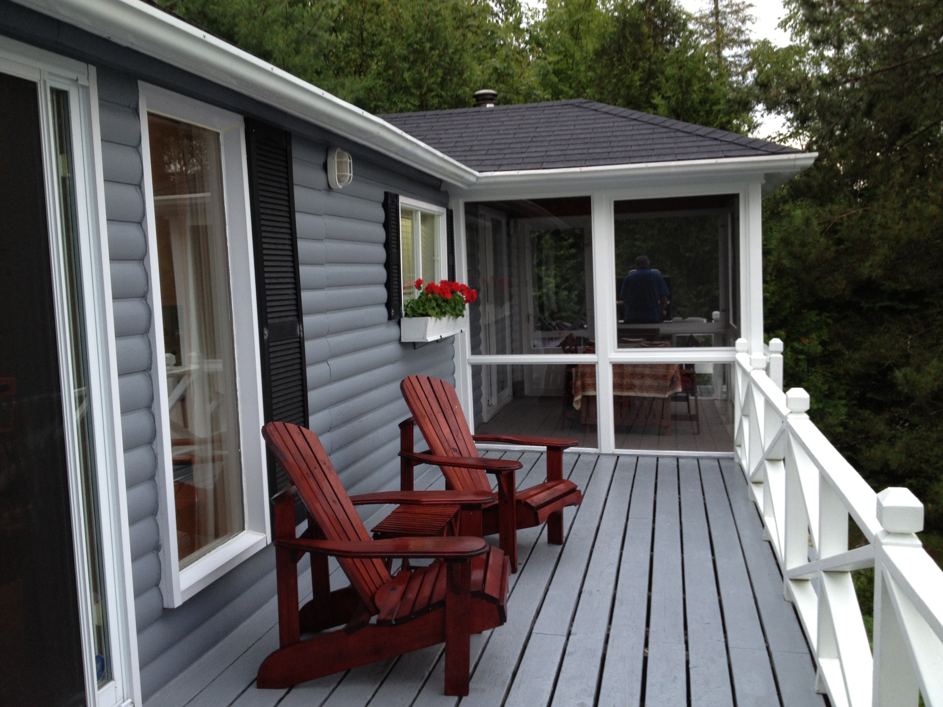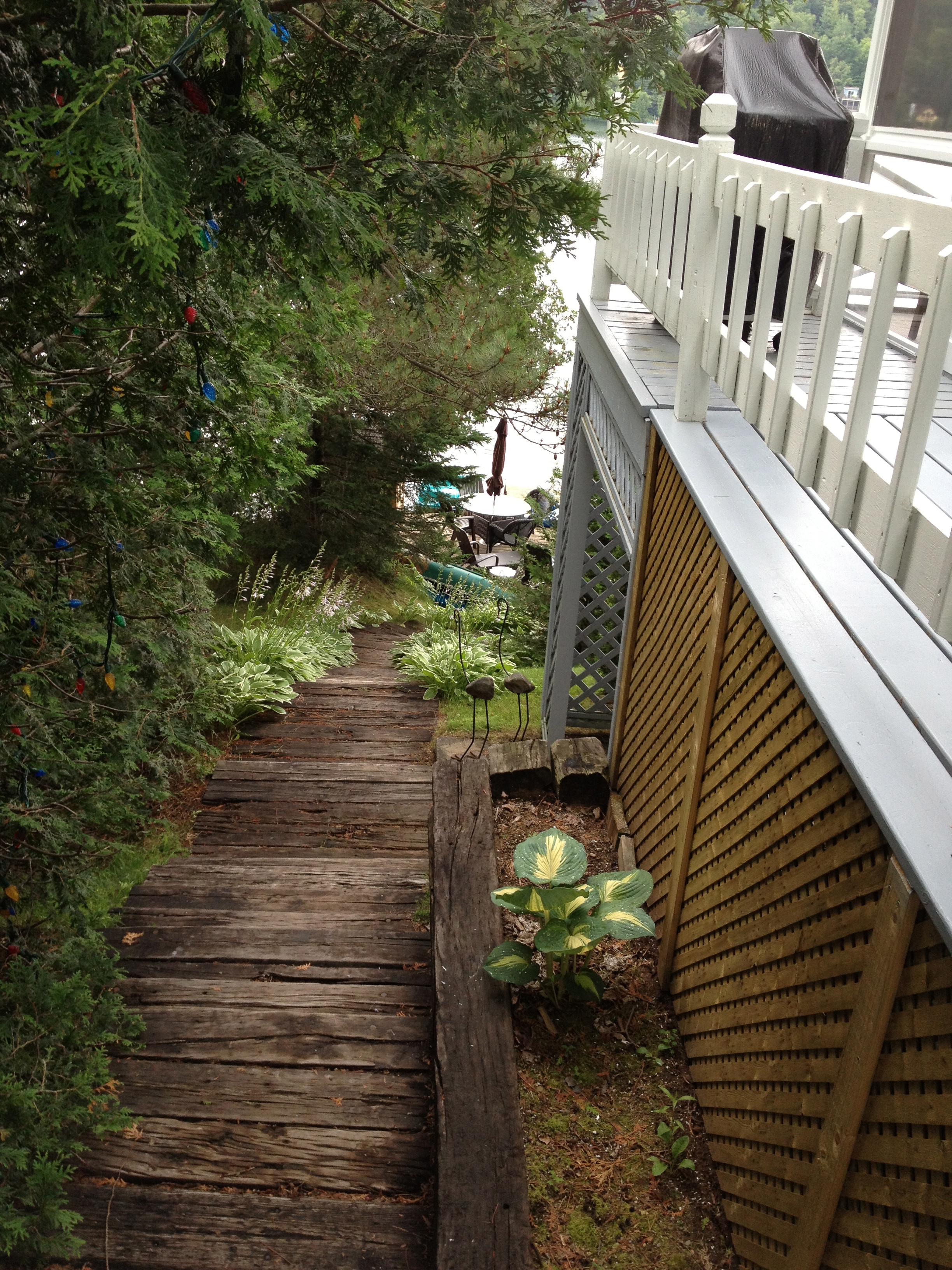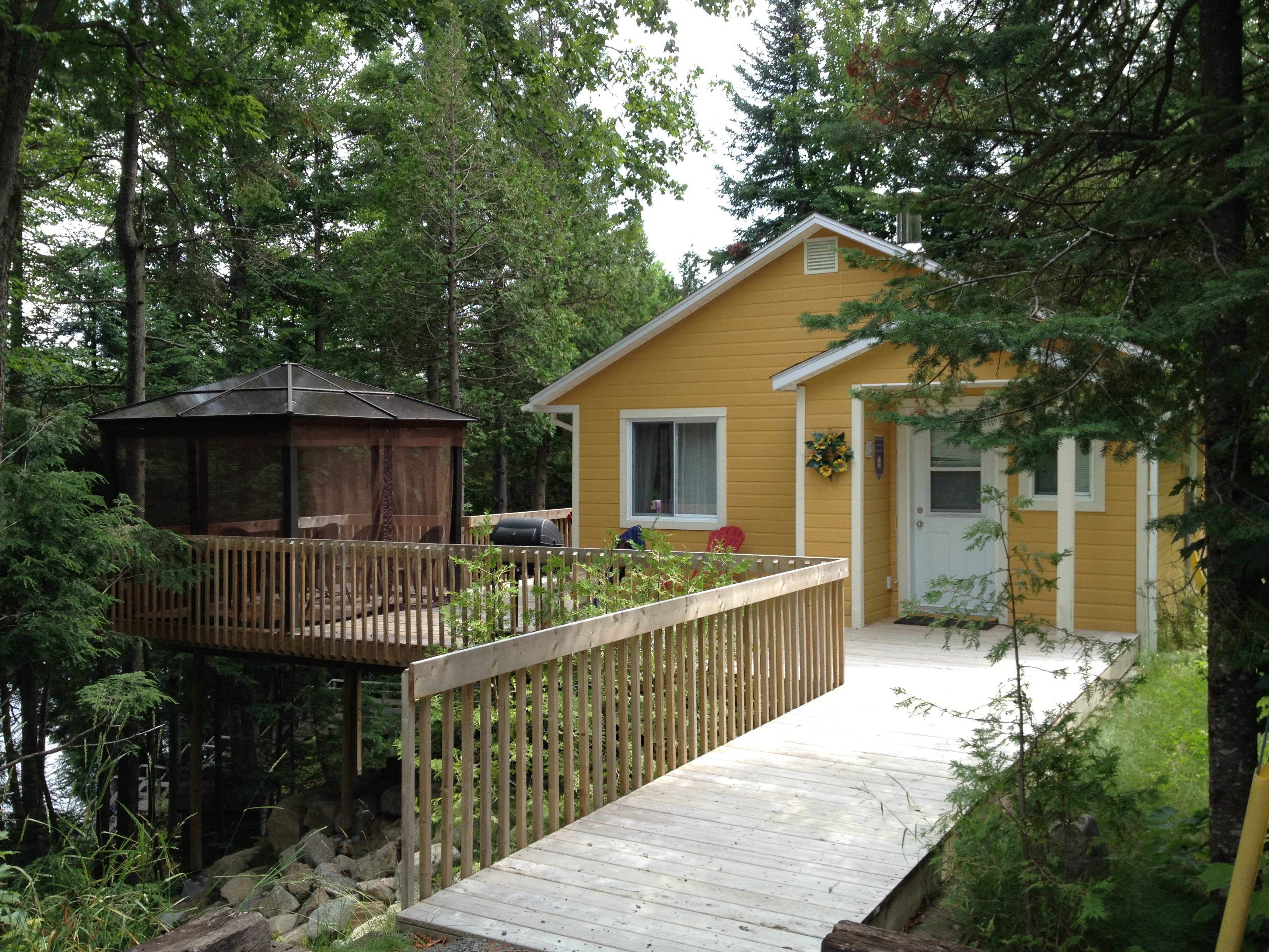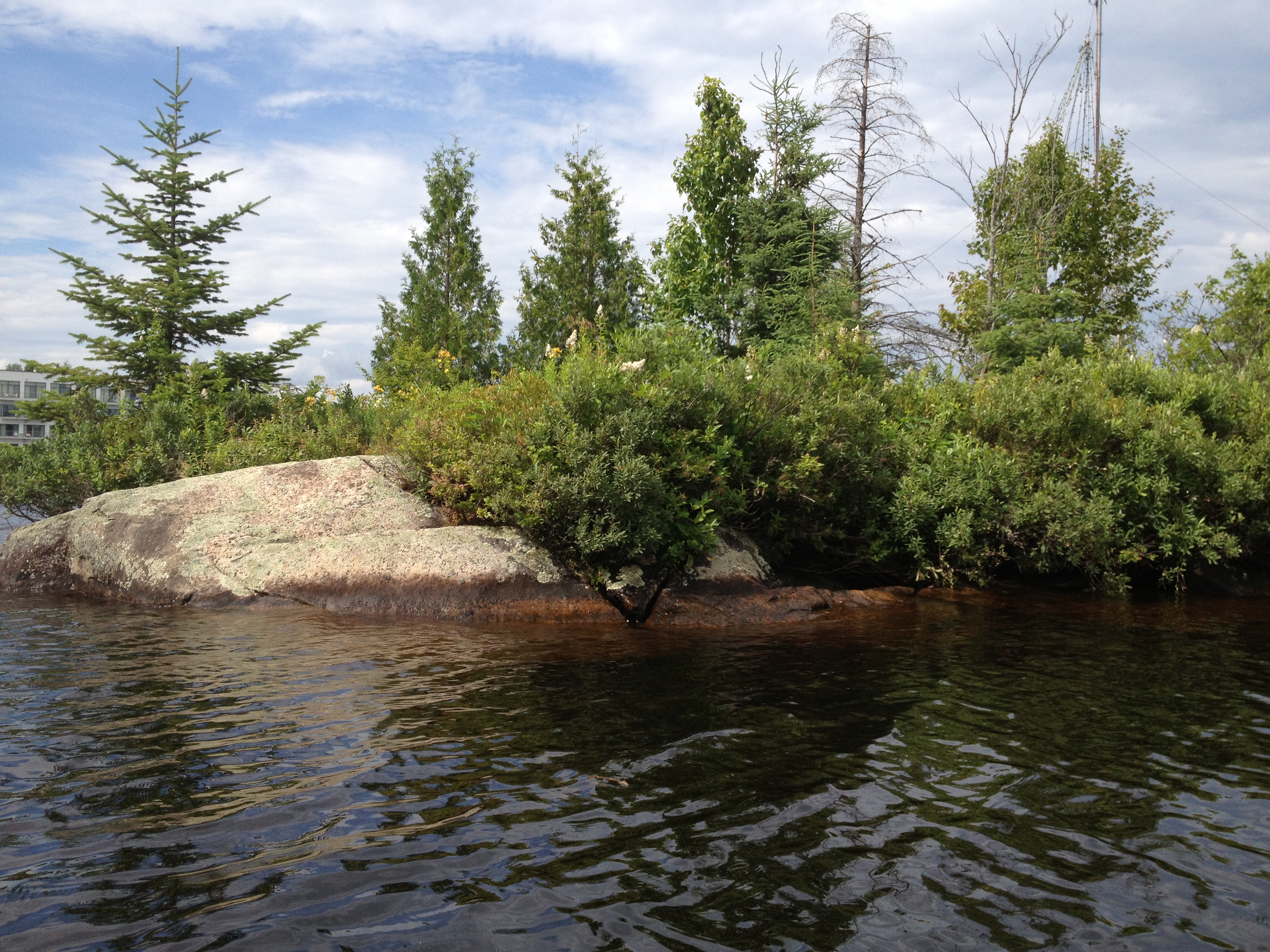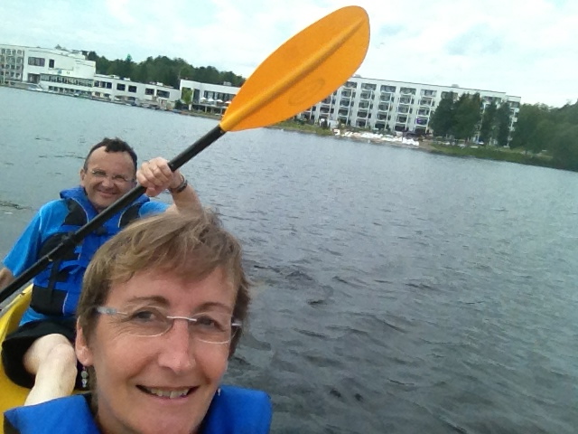 Nous resterons ‘fit‘ car l’ascenseur est en panne. De plus, nous nous lançons dans une randonnée en kayak double, sur ce lac Dupuis; il s’agit de faire attention aux petites îles et aux rochers. C’est très amusant et physique pour les bras … nous nous faisons parfois secouer par la vague de poupe d’un plus gros bateau à moteur, nous traversons un tapis de nénuphars. Isabelle perturbe pas mal son mari, elle est difficile à suivre car son rythme est loin d’être régulier – un coup à droite, deux à gauche! Nous nous sentons à présent de vrais canadiens; tout le monde nous parle ici de kayak, un sport vraiment proche de la nature. La fin de journée est douce, calme, inondée de quiétude.
