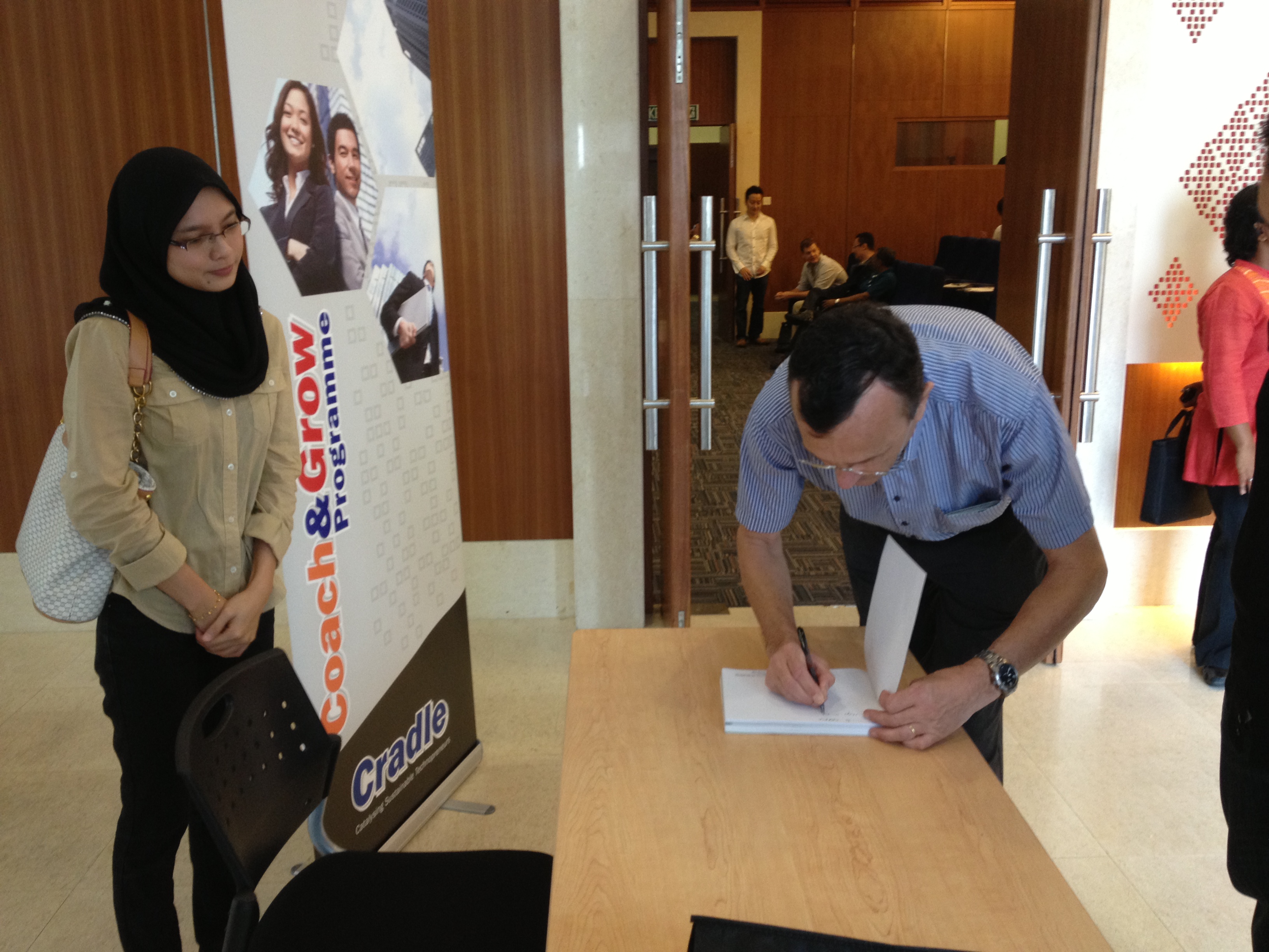 La circulation est un peu plus aisée ce matin, il y a beaucoup de bus, de klaxons et il me semble que les feux sont parfois une histoire de décoration. Le centre ville est un mélange de buildings modernes et aussi de superbes bâtisses de style oriental, comme cet hôtel Heritage, qui doit correspondre à notre ‘Raffles‘. Dans un hôtel du centre, proche de Little India, une table pour douze personnes nous attend. Nous connaissons tous les convives, à l’exception de Nasrim, le directeur de Cradle qui était souffrant hier. C’est comme si nous étions des amis de toujours, les discussions sont animées, autour du football, de la nourriture, de Chinese New Year qui se fête bien évidemment ici aussi. A cette occasion il y aura des représentations de la ‘danse du lion’; les malais sont champions en Asie pour ces acrobaties sur des hauts poteaux – comme nous en avions regardé, émerveillés, en Thaïlande. Les artistes ont souvent pratiqué le Kung-fu auparavant. Les malais sont visiblement de bons vivants et eux-mêmes se comparent aux italiens pour leur passion de la nourriture – il faut voir les assiettes qu’ils dévorent ce matin – et aux espagnols pour leur engouement modéré pour le travail!