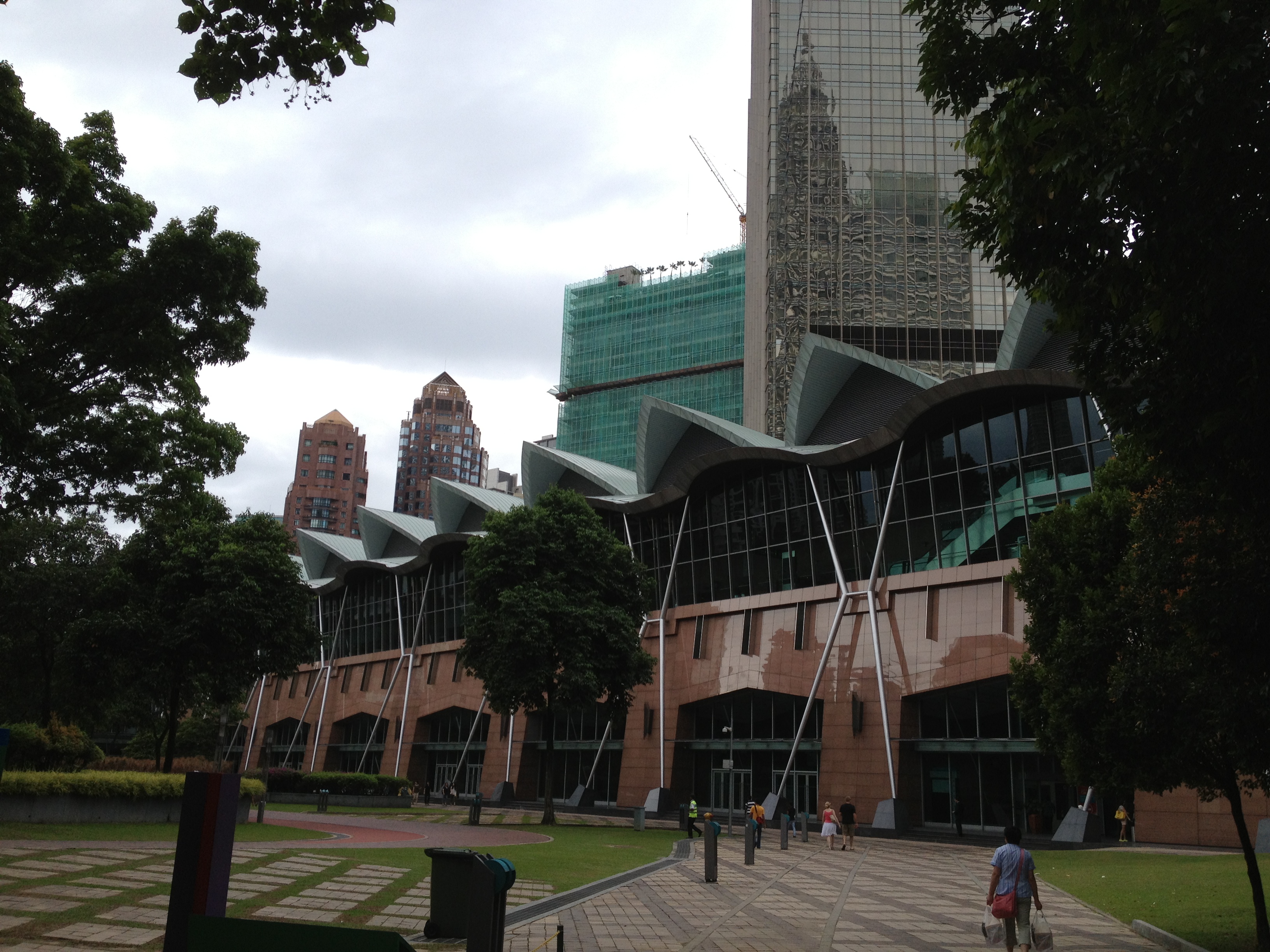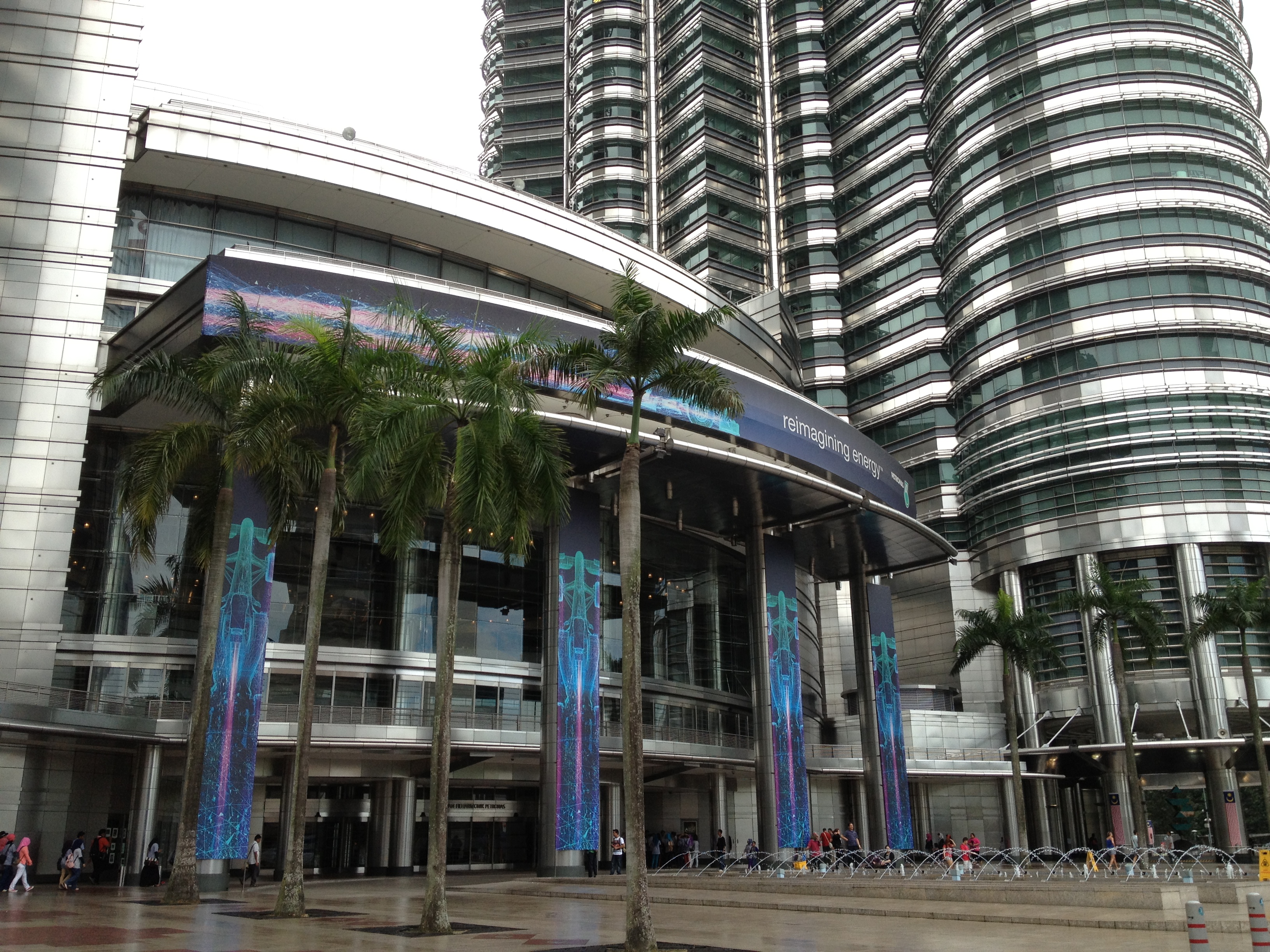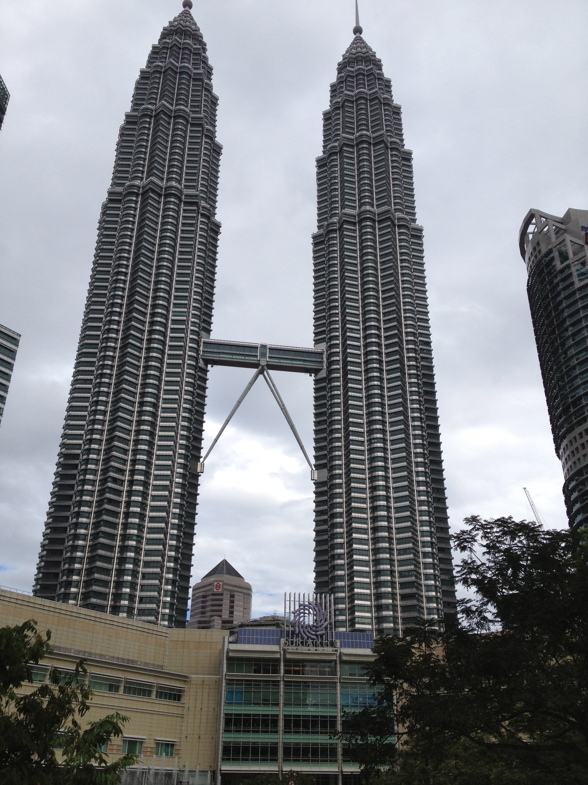Le centre de Kuala Lumpur est principalement le siège des entreprises, des commerces et les malais préfèrent habiter à l’extérieur de la ville, dans des quartiers plus calmes, plus verts, moins onéreux. Ainsi ce sera aussi un peu une découverte pour Linda aujourd’hui, à qui chacun ce matin a voulu donner des conseils! Nous allons souvent nous déplacer en taxi et elle se fait un plaisir en négociant le prix de la course – les touristes peuvent toujours demander de payer au compteur. Les tours jumelles Petronas sont le fleuron de l’économie, le symbole du 21ième siècle pour la ville. Elles renferment un centre commercial flambant de marbres, des étages de bureaux dont ceux de la société Petronas et également une salle de concert, où se produira cet après-midi Hélène Grimaud … Les tours s’élèvent imposantes à 88 étages et une passerelle intermédiaire les relie; malheureusement il n’y a déjà plus de possibilité d’y monter aujourd’hui. Le parc aux alentours est très agréable, avec des fontaines, une pataugeoire où les enfants s’amusent, des arbres centenaires et comprend aussi un centre des congrès.