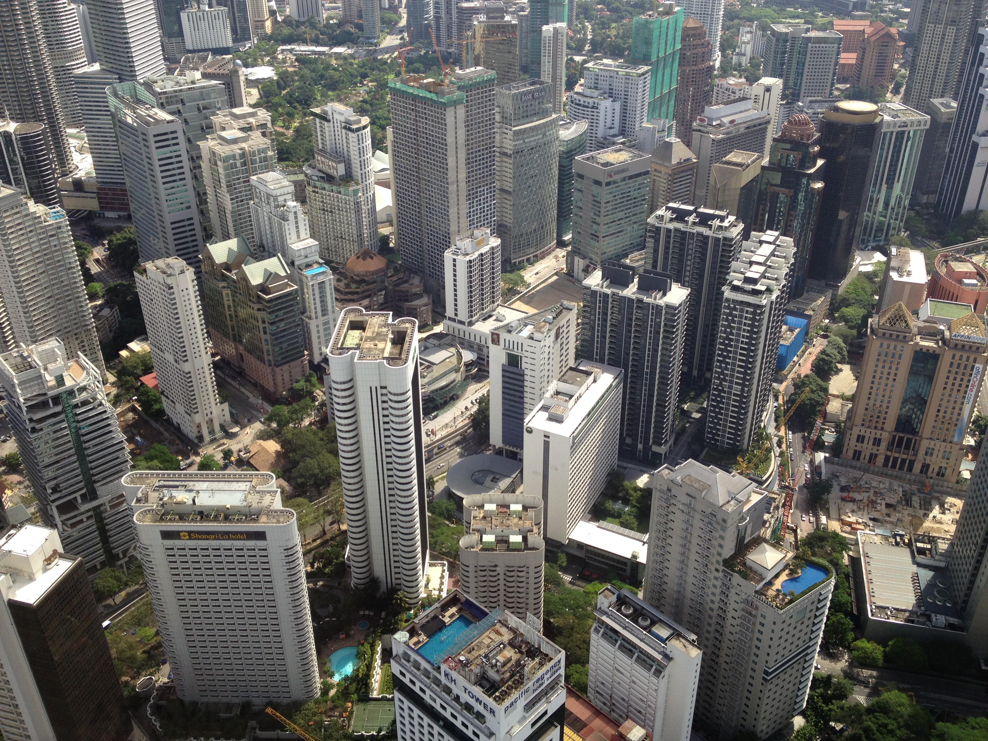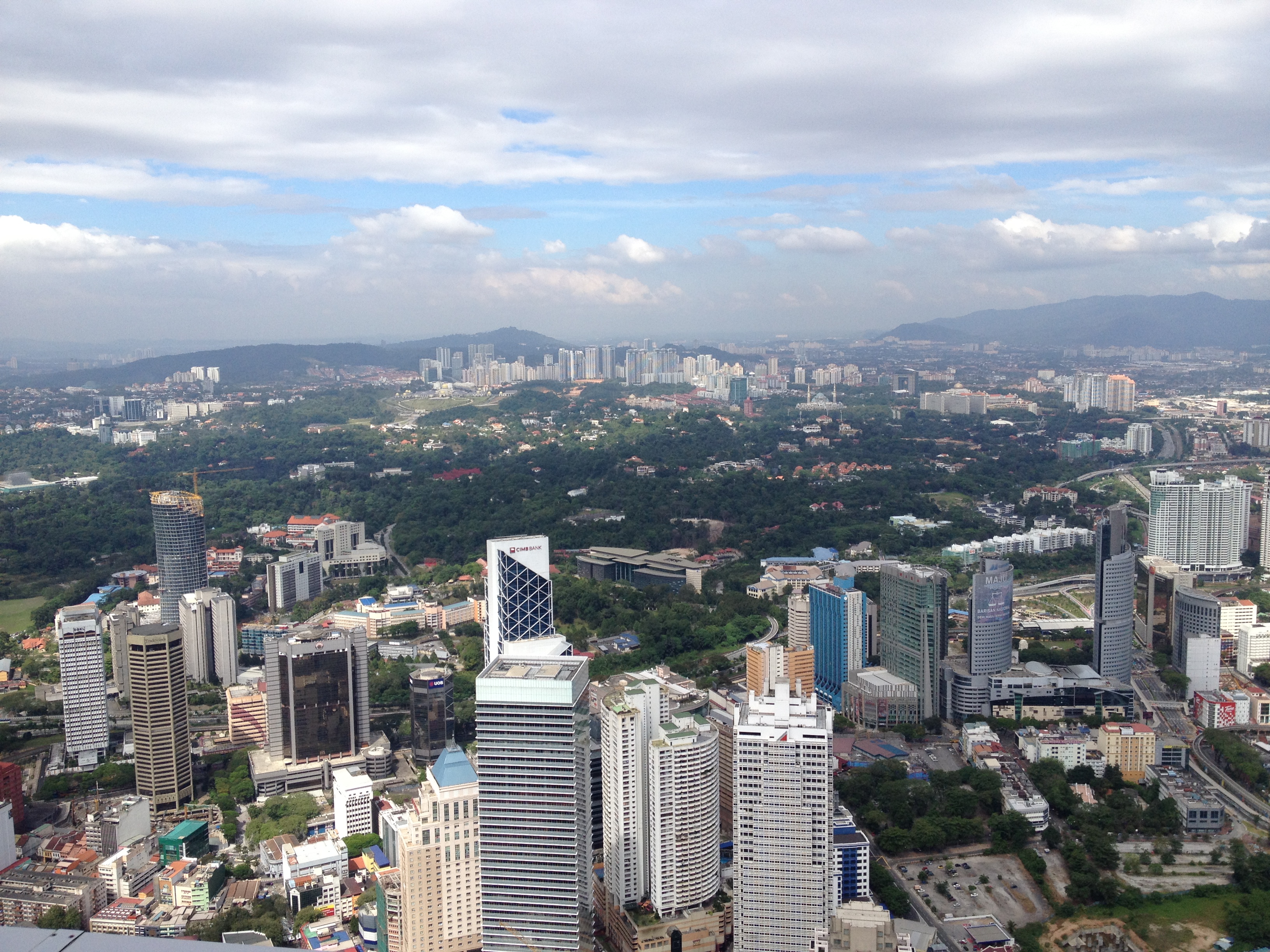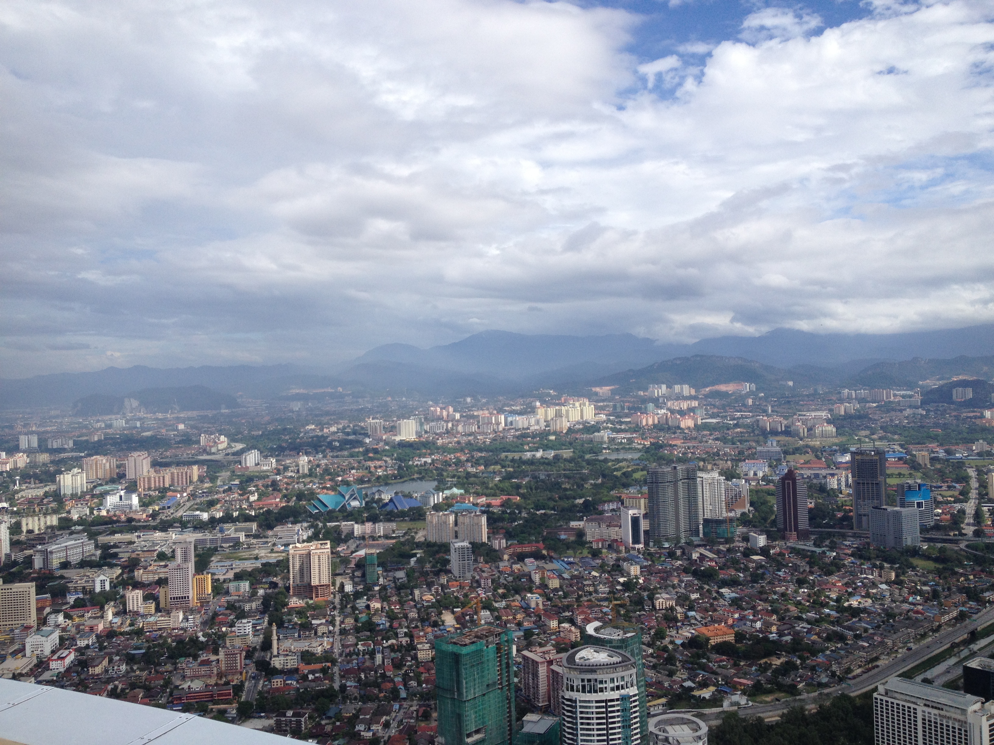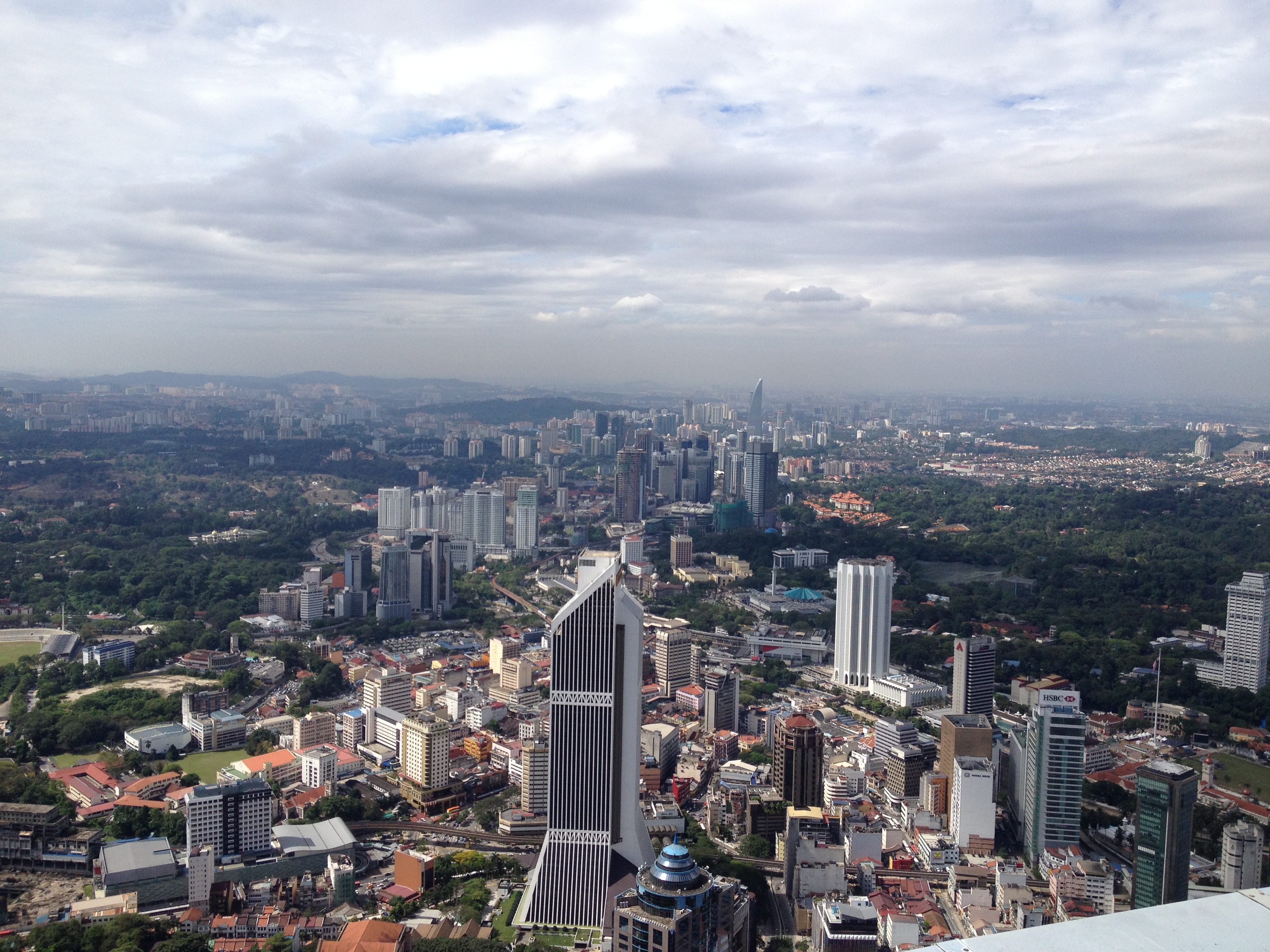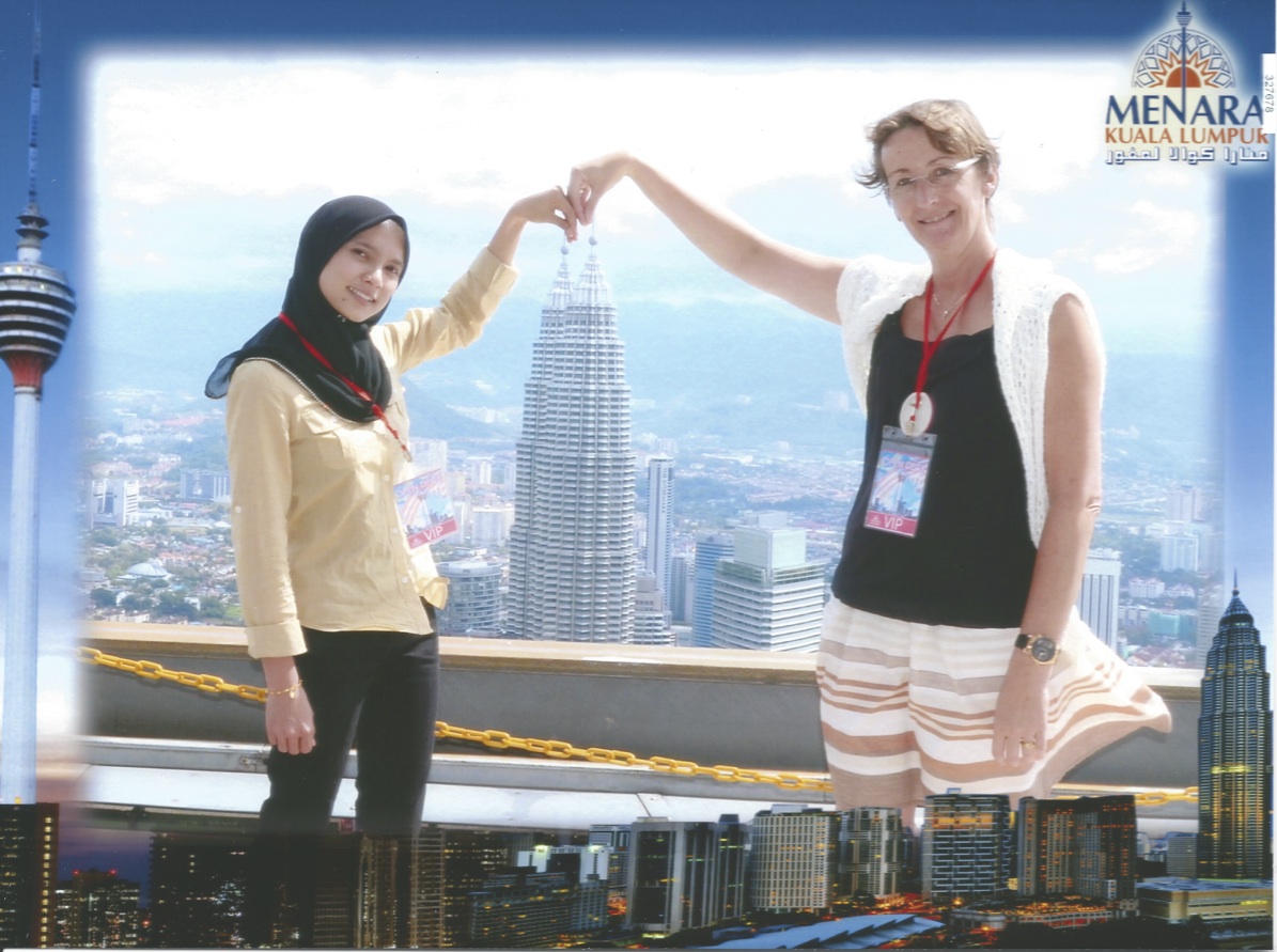 A défaut de pouvoir accéder à la passerelle, nous optons pour la KL Tower – ou Menara en malais – qui logée sur une colline nous offre une vue éblouissante sur toute la région, bien au-delà de la ville. C’est une des hautes tours de télécommunications comme il en existe dans plusieurs pays, celle-ci mesure 421 mètres. Linda est ravie d’y grimper avec moi, elle y est venue étant enfant et à l’époque elle ne se souvient pas de l’open deck. Le vent souffle, le soleil est chaud, nous tournons tout autour et elle tente de reconnaître et me décrire les différents quartiers et bâtiments, le marché, le nouveau palais royal, la mosquée nationale, etc. Avec mon ticket d’entrée en tant que touriste étrangère, j’ai moi droit à une photo prise de tout là-haut, un beau souvenir.