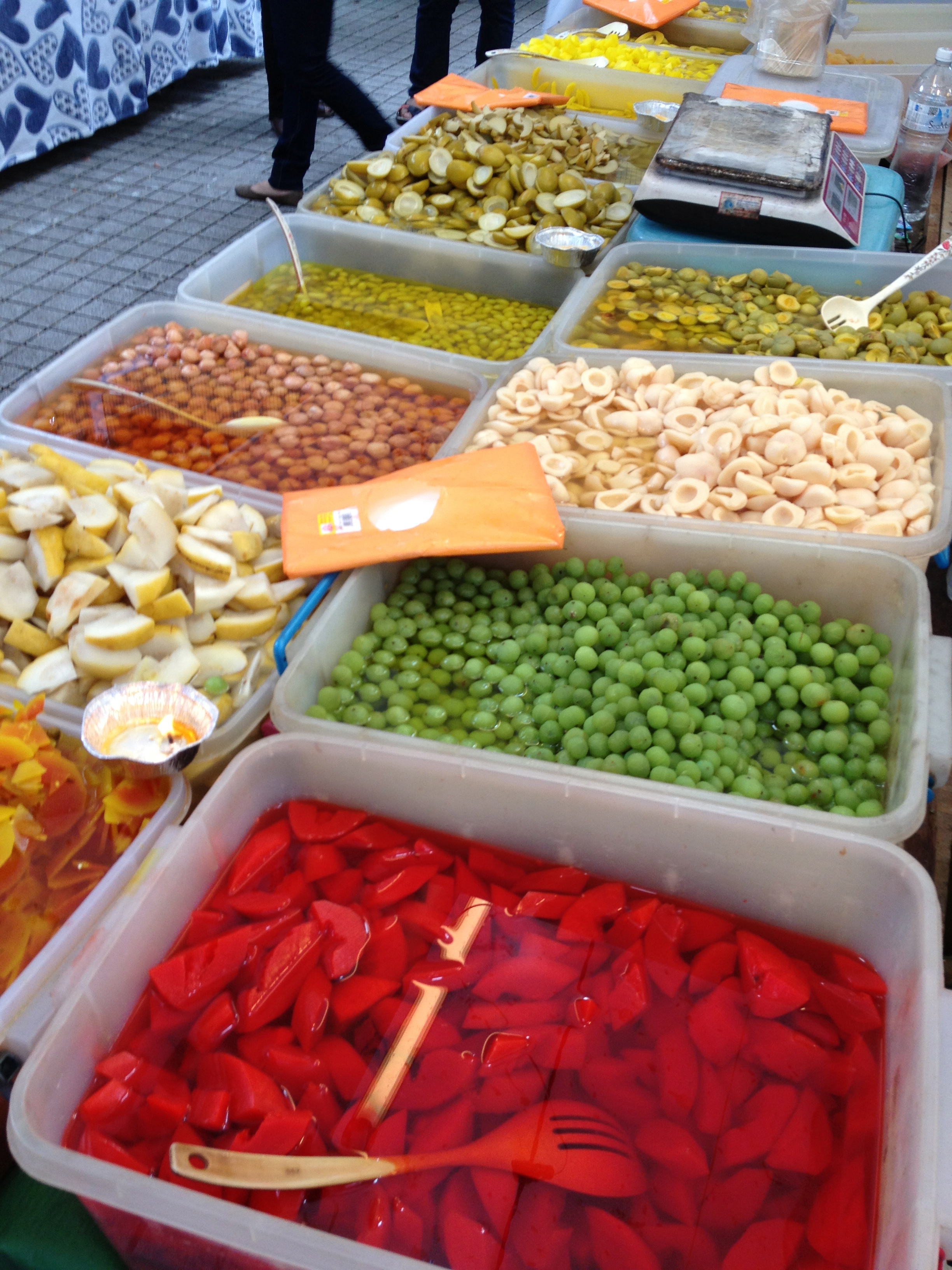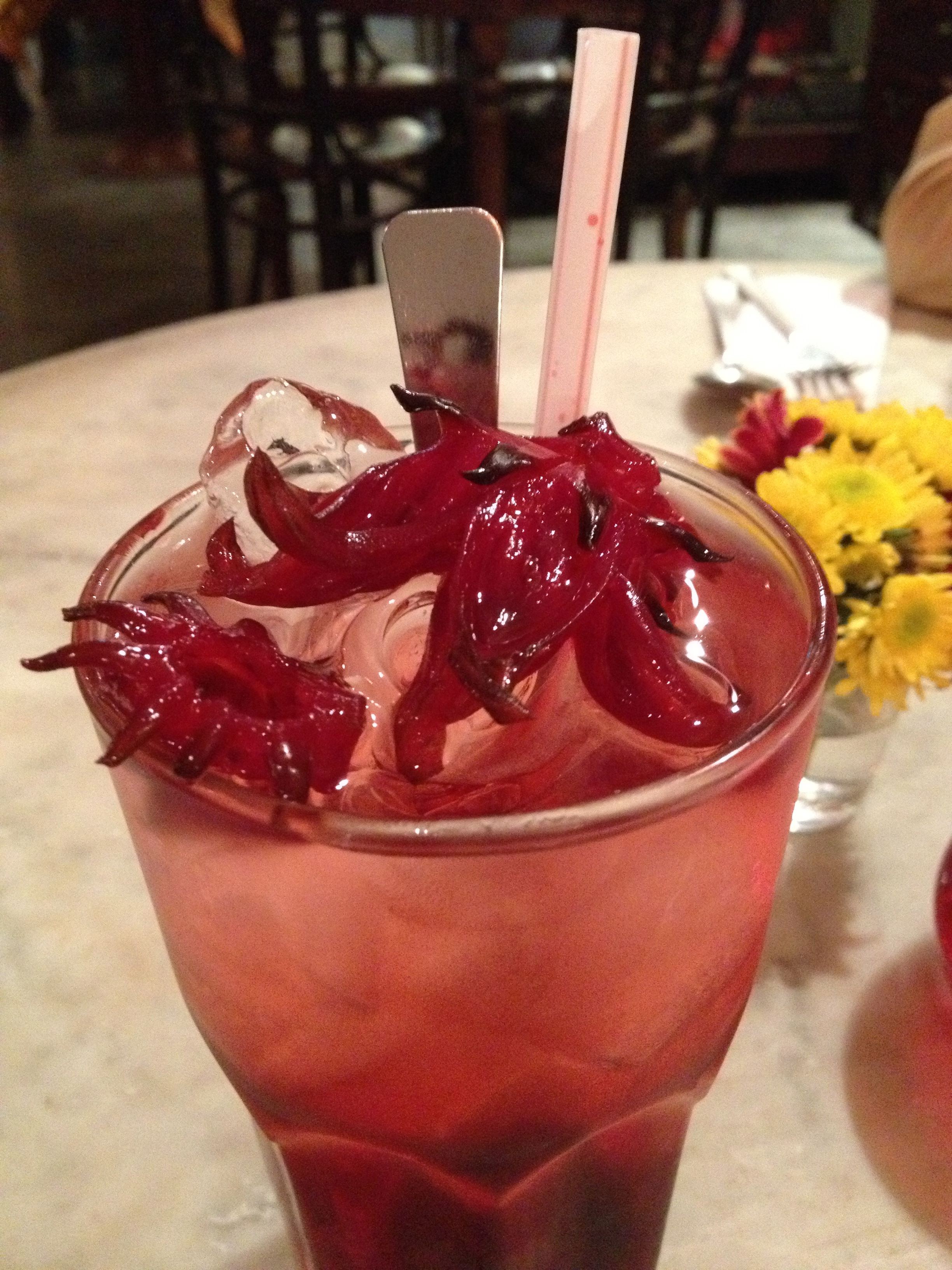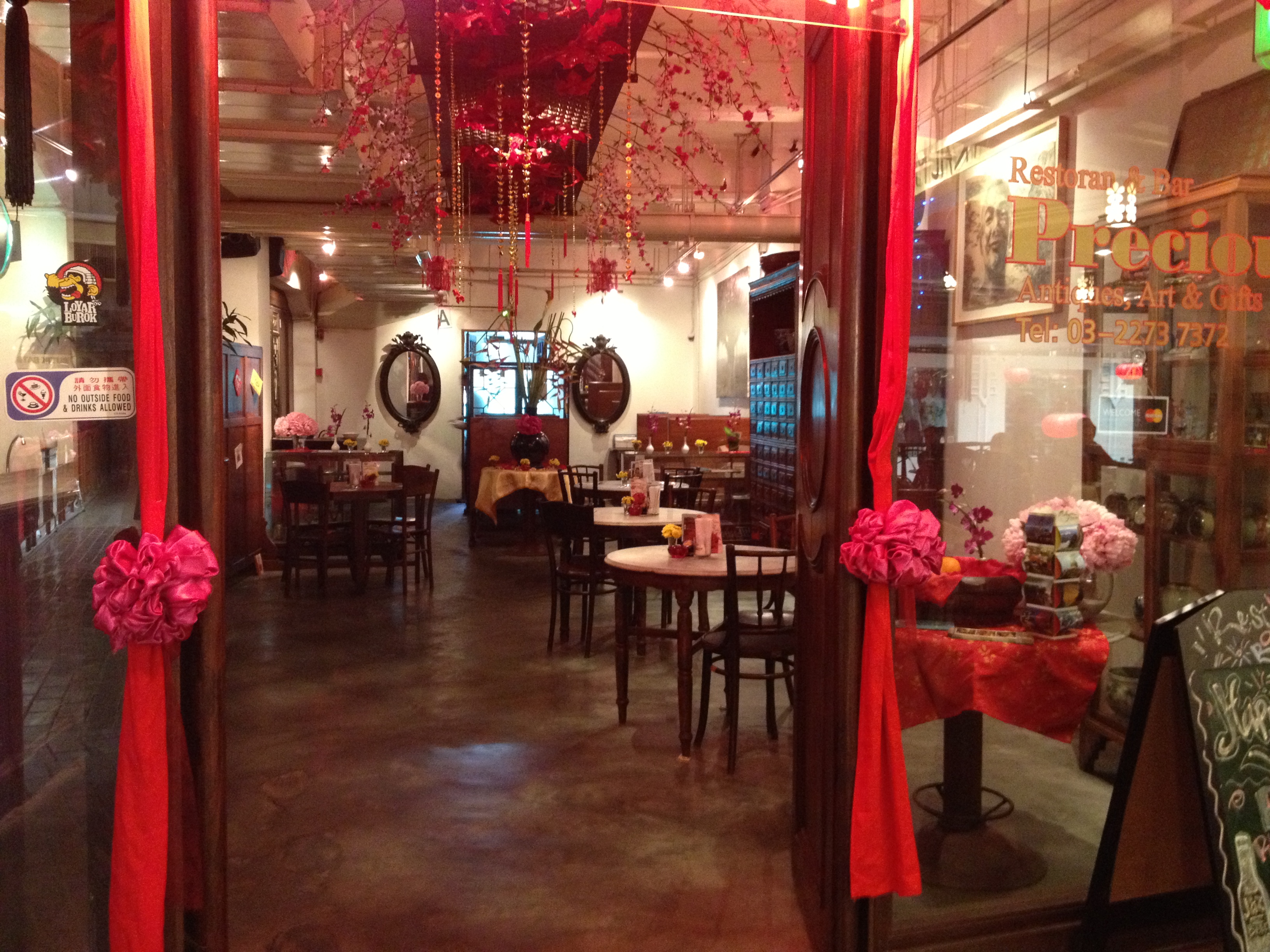 Dans ce marché couvert, à l’étage, un restaurant nous fait de l’œil pour le lunch et je la laisse choisir de délicieux petits plats et vu qu’elle n’aime pas ce qui est fort épicé, je suis ravie – une soupe de poulet au ginseng, du poisson sweet and sour et ce légume que nous avons découvert hier soir, le pucuk paku. Il s’agit d’une fougère comestible et c’est très savoureux ce midi, cuit dans une soupe épicée de lait de coco avec des patates douces et des crevettes … je me régale! Pour la boisson, elle choisit un sirop de Sour Sop, le fruit du corossolier, un voisin du durian et moi de Roselle, la fleur de l’hibiscus. Le patron et son personnel sont vraiment très sympathiques et le cadre est fantastique, le restaurant étant conjointement un magasin d’antiquités.
