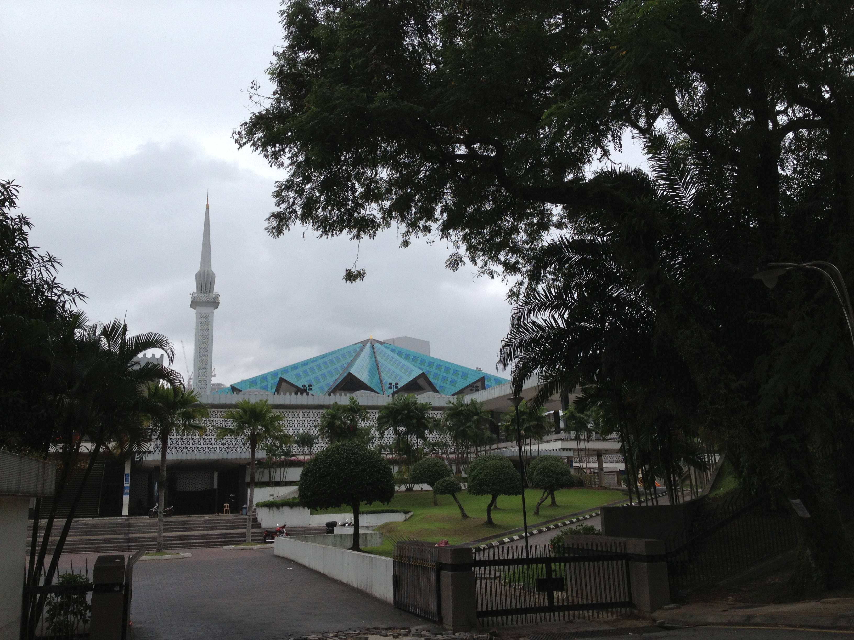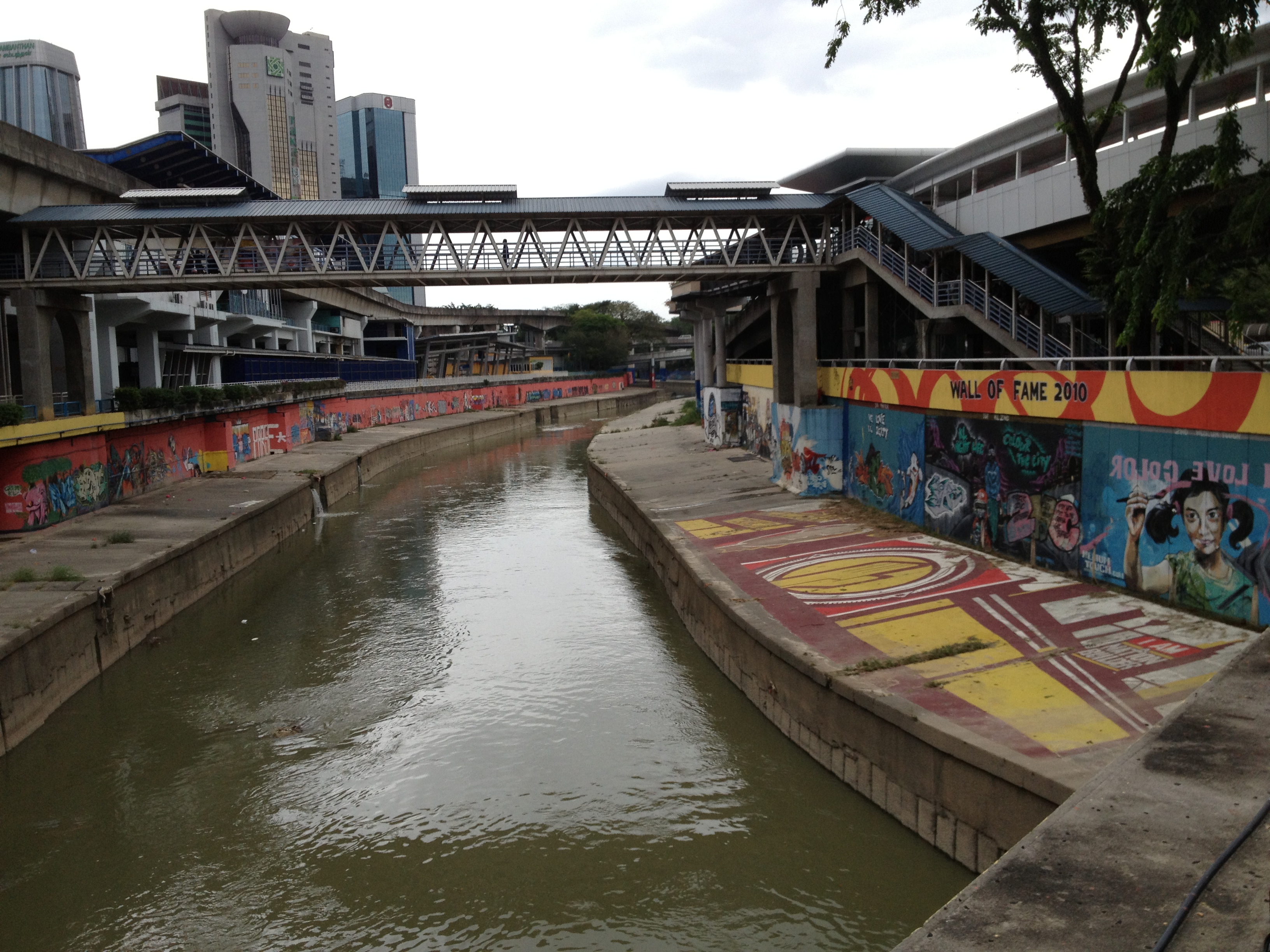 Pour rejoindre ensuite la Mosquée Nationale, au toit en vagues, superbe de tuiles bleutées, nous devons traverser de larges avenues et on y va à l’instinct … un pont enjambe la Klang River dont les murs bordant le canal sont couverts de graffitis qui sont très régulièrement effacés et recréés par des artistes de rue qui se rassemblent sur les berges.