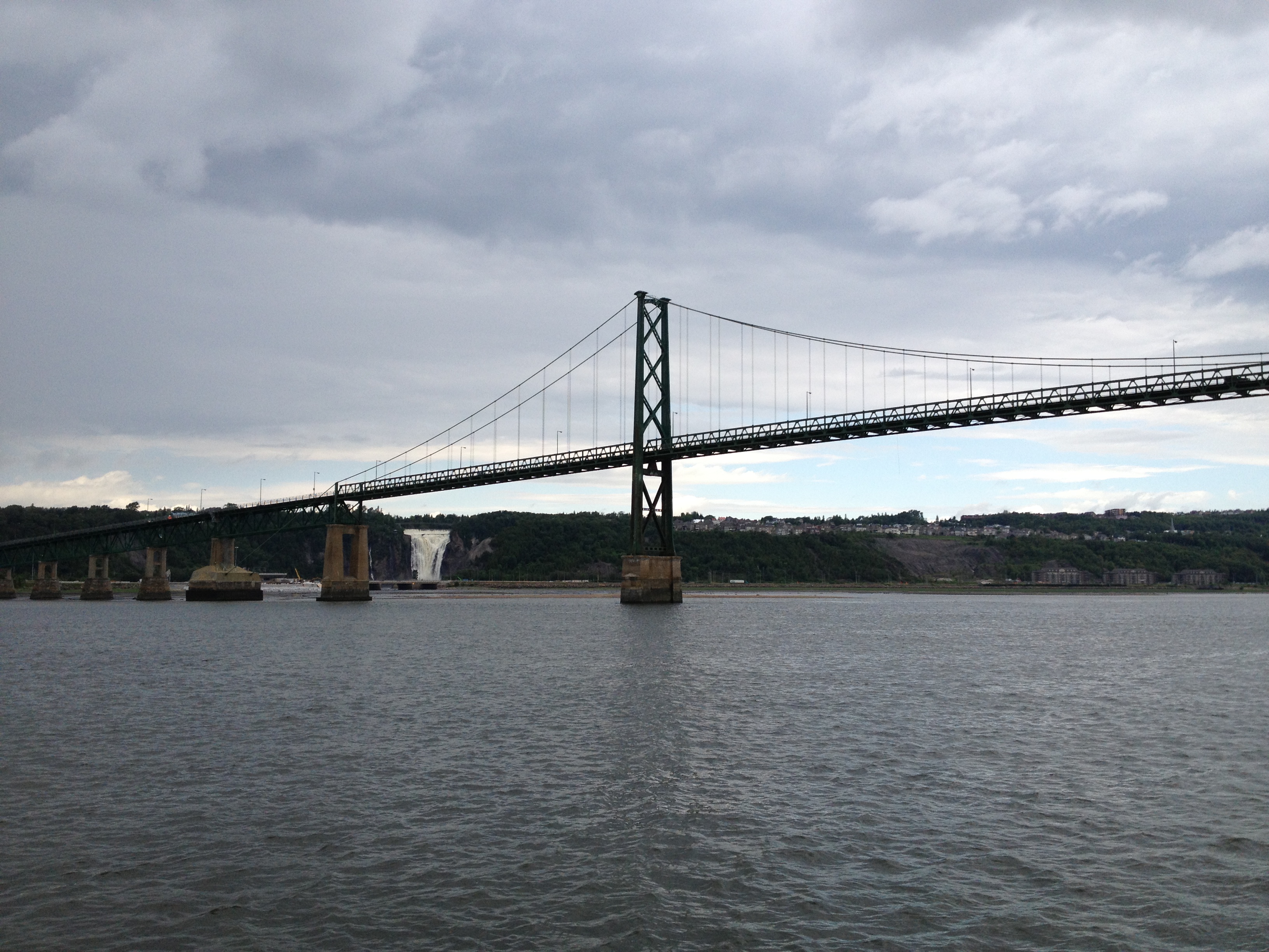 Nous voici quittant le pays sauvage et magnifique de Charlevoix; nous reprenons la route 138 vers Québec. Une dernière halte encore à Beaupré nous tente pour une ultime marche en nature, au Canyon Ste-Anne. Woah, c’est assez vertigineux et spectaculaire de passer par dessus cette chute d’eau, sur les trois ponts suspendus, dont une passerelle qui se situe à soixante mètres au-dessus du gouffre. Ici aussi nous sommes face à une chute plus haute que celle du Niagara; le débit de la rivière varie beaucoup au cours de l’année entre le printemps avec la fonte des neiges et l’automne. La rivière Ste-Anne prend sa source dans une trentaine de lacs, à cent kilomètres à la ronde avant de se faufiler et se jeter dans le St Laurent à Beaupré. Comme la plupart des rivières du Québec, elle abrite des poissons, on peut y pêcher la truite arc-en-ciel, l’omble de fontaine, l’anguille ou le meunier noir. Sa couleur est brune par endroit; cette coloration provient des acides présents dans l’humus du sol des forêts et aussi de la présence de métaux comme le fer et le manganèse qui se trouvent dans les roches sur lesquelles la rivière ruisselle. Elle n’est cependant pas impropre à la consommation.