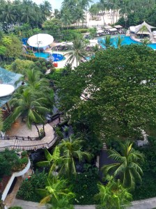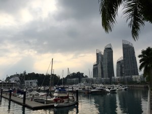 Mathieu a aussi bien aimé nos après-midi à Sentosa, sur la plage privée du Rasa Shangri-La; nous y sommes des habitués, mon natel se connecte de suite au réseau de l’hôtel. Avec Yves, nous y passons deux jours – pour nous consoler du départ de notre fils – et avons le plaisir d’y revoir notre ami Ben, le manager. Il est revenu à son poste de direction mais nous annonce qu’il prend sa retraite dans deux semaines et retourne auprès de son épouse à St-Jean-de-Luze. Mei P. Pun et Jennifer Yong, ses adjointes F&B et Marketing, nous sont elles aussi très sympathiques (je vais conserver le contact). C’est la première fois qu’il nous octroie une chambre à l’extrémité du bâtiment, étage élevé et grand balcon – c’est magnifique! Yves aime observer le traffic constant de tous les bateaux sur le détroit de Singapour, allant des bateaux de pêche, aux ferries qui relient les îles de raffineries, aux porte-containers plus ou moins modernes et parfois, perdus dans cette animation, un ou deux voiliers.