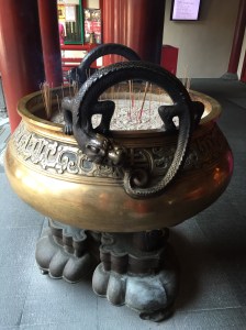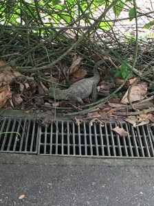 C’est en 2012 que Mélina et moi avons eu l’envie de partir une journée sur une des petites îles au sud de Singapour. Ce projet m’est revenu chaque année en tête, sans par contre l’enthousiasme de Yves et c’est donc Mathieu qui ‘se dévoue’ cette fois pour m’accompagner sur Kusu Island (sans regret ni pour lui ni pour moi). Quelques provisions dans le sac-à-dos (ni restaurant, ni magasin, ni distributeur sur l’île) et nous voici embarqués sur un vieux petit ferry vers ce chapelet des 5 îles singapouriennes les plus proches de l’équateur, sillonnant vraiment très près d’énormes tankers et porte-containers. L’ampleur du port, la quantité de containers vont rendre Mathieu plus clairvoyant sur le trajet de ses produits ! La journée est belle, ensoleillée et sans orage en vue. La première halte à St-John’s voit débarquer presque tous les autres passagers (environ six personnes 😉 tandis que nous poursuivons jusque L’île aux Tortues (histoire de légende d’une énorme tortue qui aurait sauvé un pêcheur naufragé) avec ses deux temples, l’un bouddhiste, l’autre Shinto. Le premier est superbe de couleurs, juste près du débarcadère mais l’autre nous fait gravir la colline dans un bush de végétation danse, bruyante de cigales … un singe nous surprend et surtout des moustiques qui nous dévorent. Mathieu propose que nous installions notre campement sur la plage la plus éloignée de cette forêt ! Le ferry repart une heure plus tard avec deux passagers et nous restons les seuls touristes sur l’île – avec quelques jardiniers et des lézards monitors d’une belle longueur – en espérant que le ferry de 16 heures viendra bien nous rechercher ! Merci à Mathieu pour ce moment de déconnexion, loin de la ville animée. Il paraît que quelques fois dans l’année des célébrations au temple attirent foule de pratiquants.