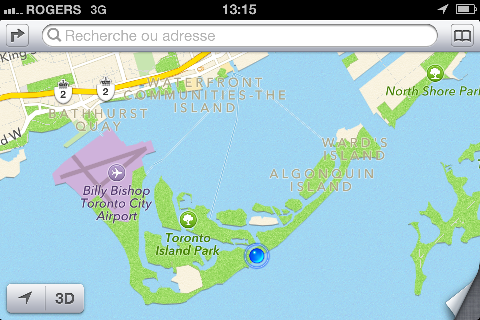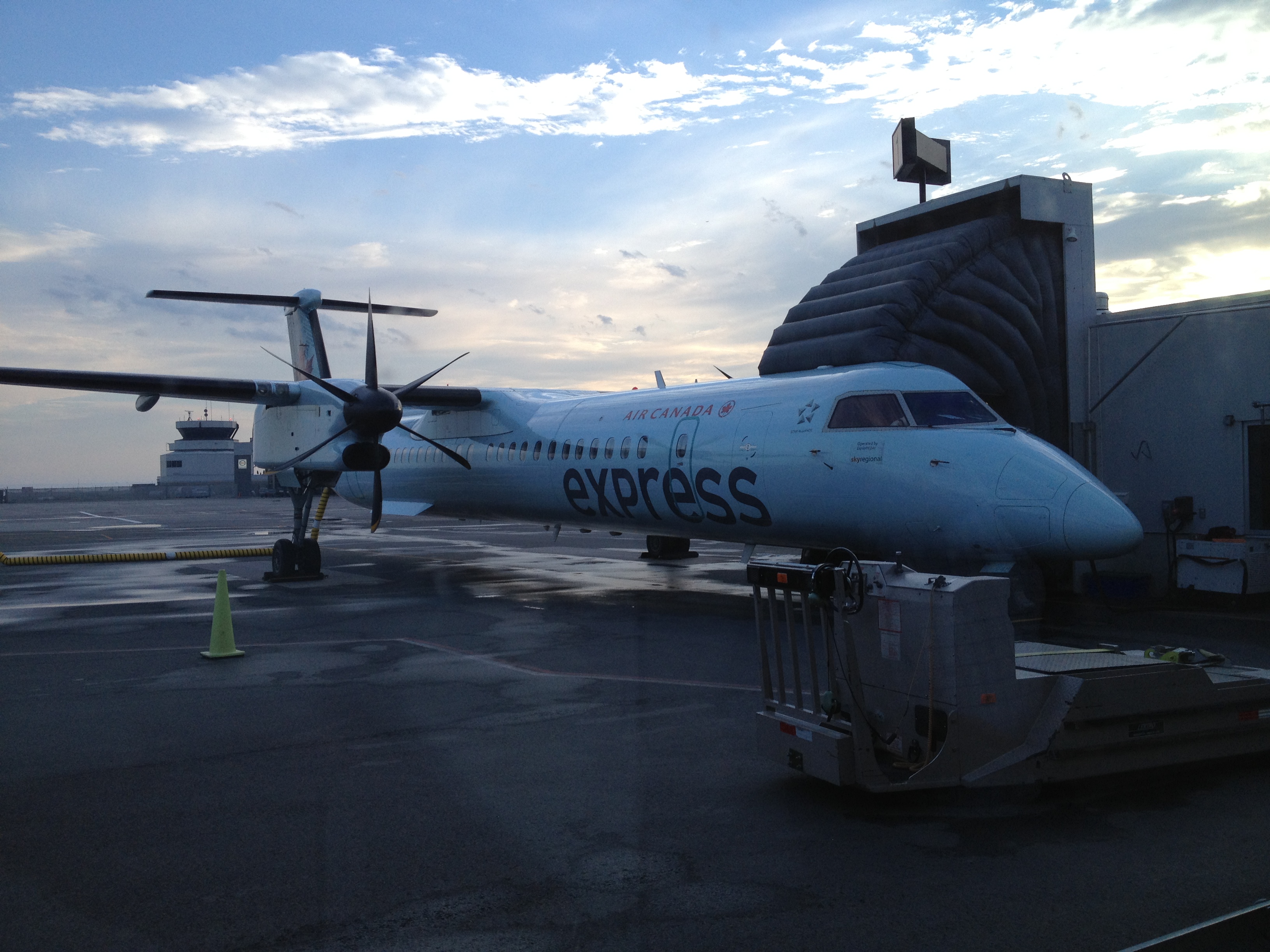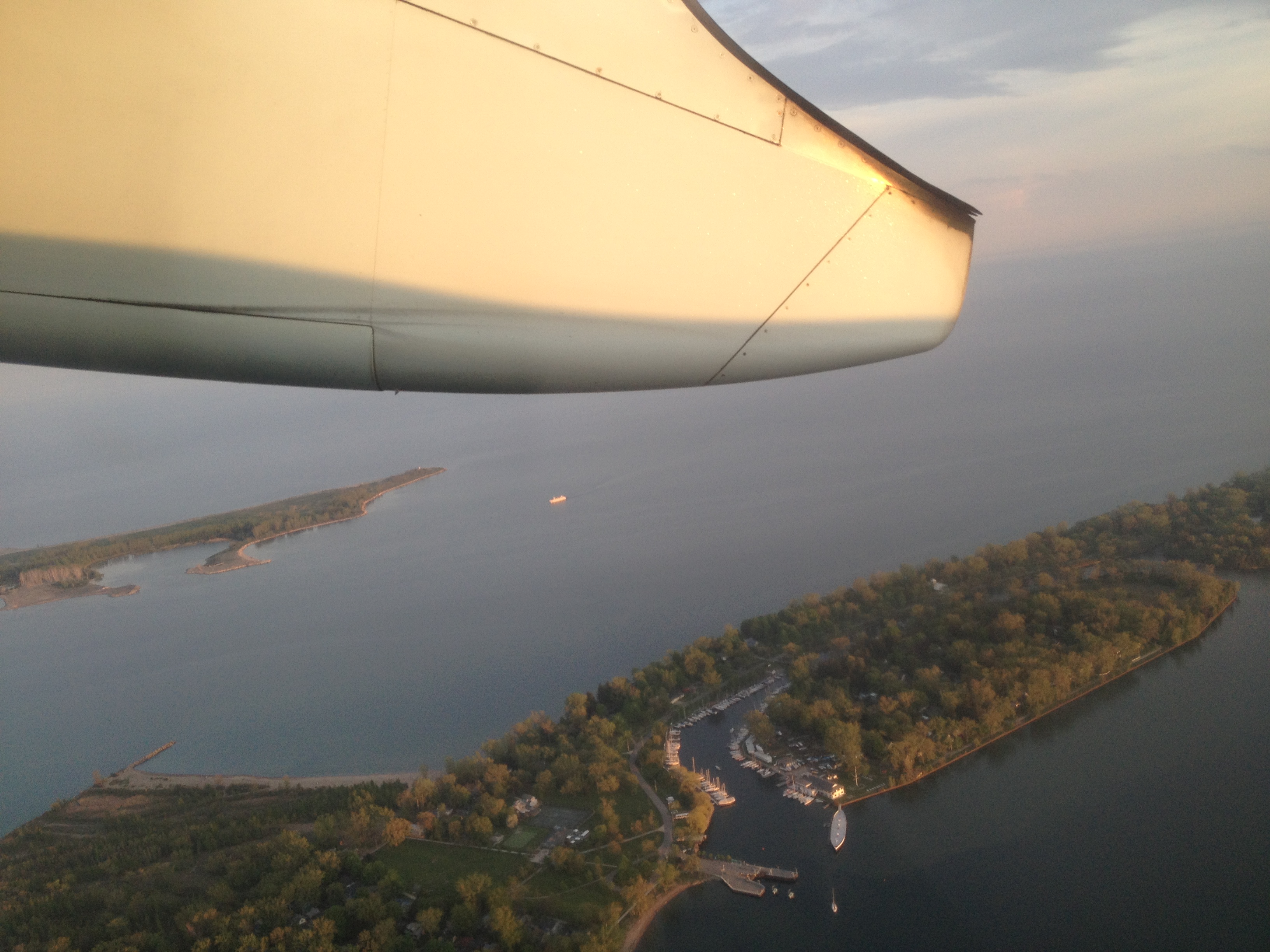 Yves a lui passé une bonne journée de travail, son séminaire du soir a eu beaucoup de succès à la ISchool. Nous nous retrouvons à l’hôtel pour partir ensemble chercher l’avion qui nous ramène à Montréal. Alors là, c’est un record de rapidité et d’efficacité. Le taxi nous emmène au hall du Porter AirPort, là un bac nous fait traverser le petit canal et au guichet d’enregistrement de Air Canada Express, l’employé nous propose une place dans le vol une heure plus tôt que prévu, soit dans dix minutes. Un contrôle de sécurité rapide, pas de longs corridors, nous montons à bord d’un avion Bombardier à hélices, qui va décoller trente minutes après notre départ de l’hôtel. Peu de passagers, un snack et une boisson, presque comme un jet privé et nous nous envolons par-dessus les îles où je laisse mes doux souvenirs de Toronto.