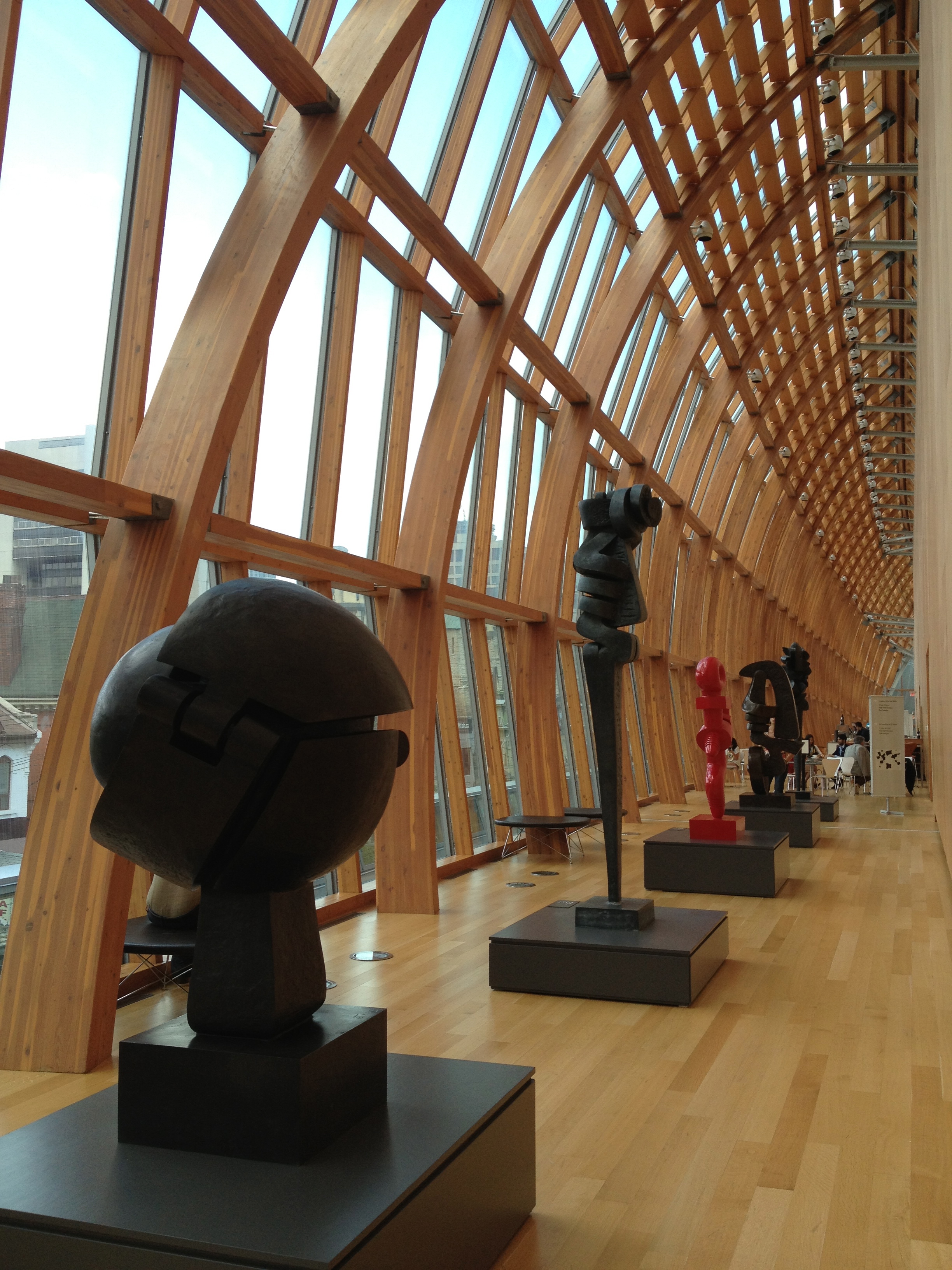 Ma dernière visite mais pas la moindre, loin de là, sera la Art Gallery of Ontario, un musée extraordinaire qui a été rajeuni il y a cinq ans par une nouvelle façade de verre et de bois, fantastique, conçue par le célèbre architecte Frank Gehry, originaire de Toronto. Par cette structure transparente, il a voulu créer une relation entre les activités du musée et celles de la rue; c’est magique de se promener dans cette galerie au niveau deux qui surplombe le trottoir.